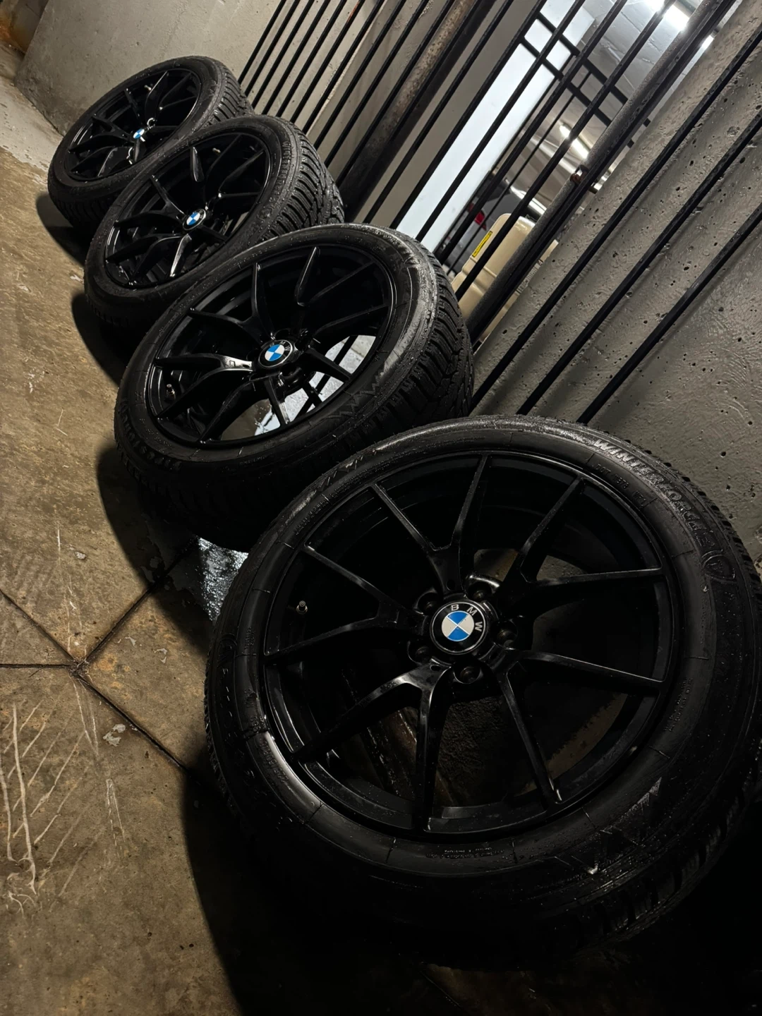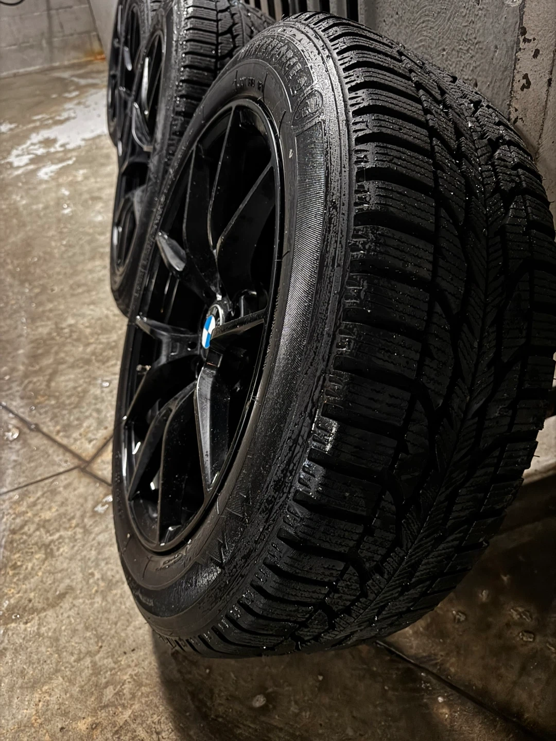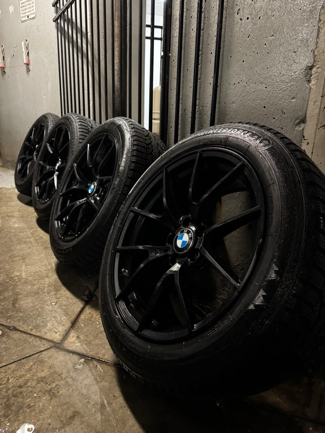 Rims are aftermarket (not OEM BMW) with BMW center caps installed. Wheels are straight, no cracks or bends. Normal cosmetic wear only. Tires have good tread left and were used only in winter seasons.