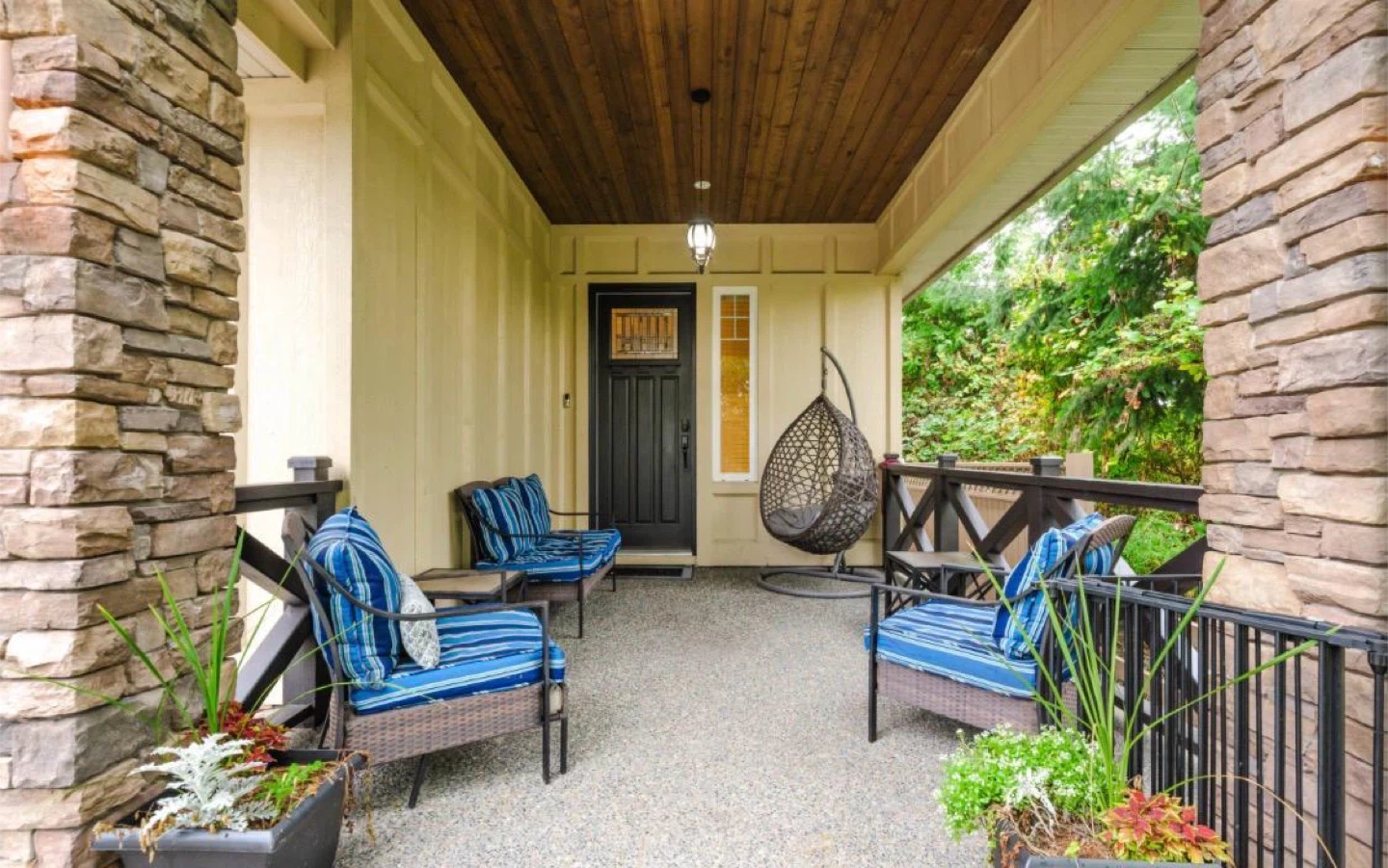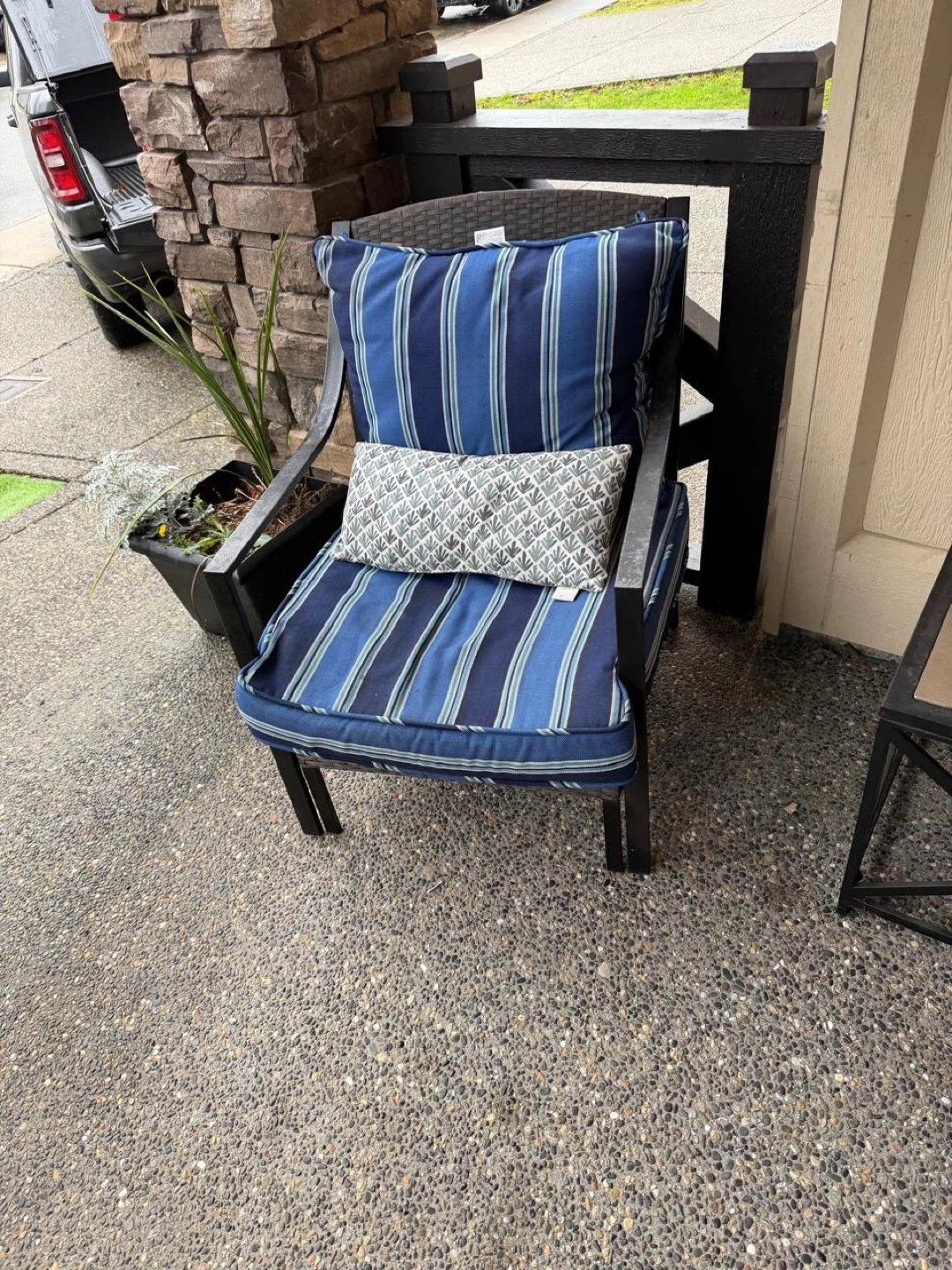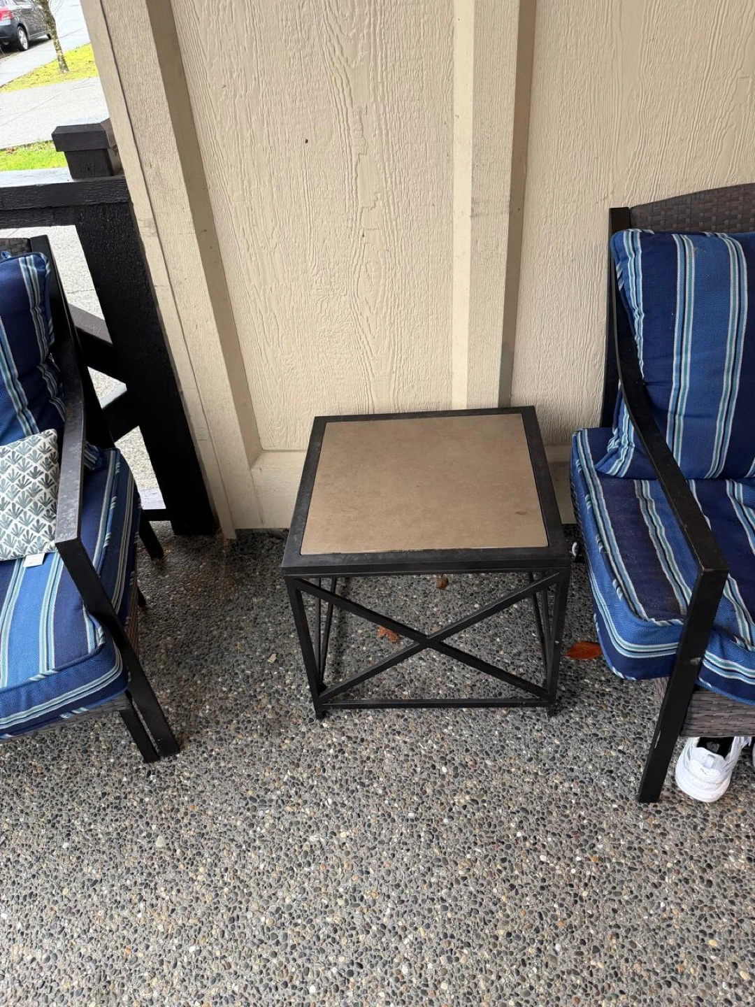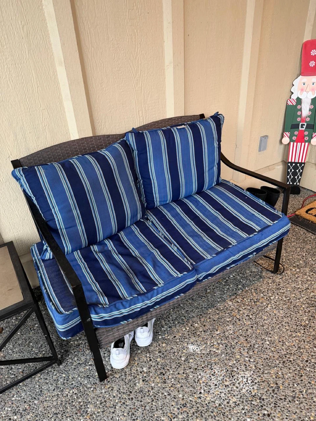 Selling a lovely outdoor patio set! It includes a loveseat, two chairs, and a small side table. The cushions are a nice blue and white stripe. Perfect for enjoying the outdoors on your porch or patio