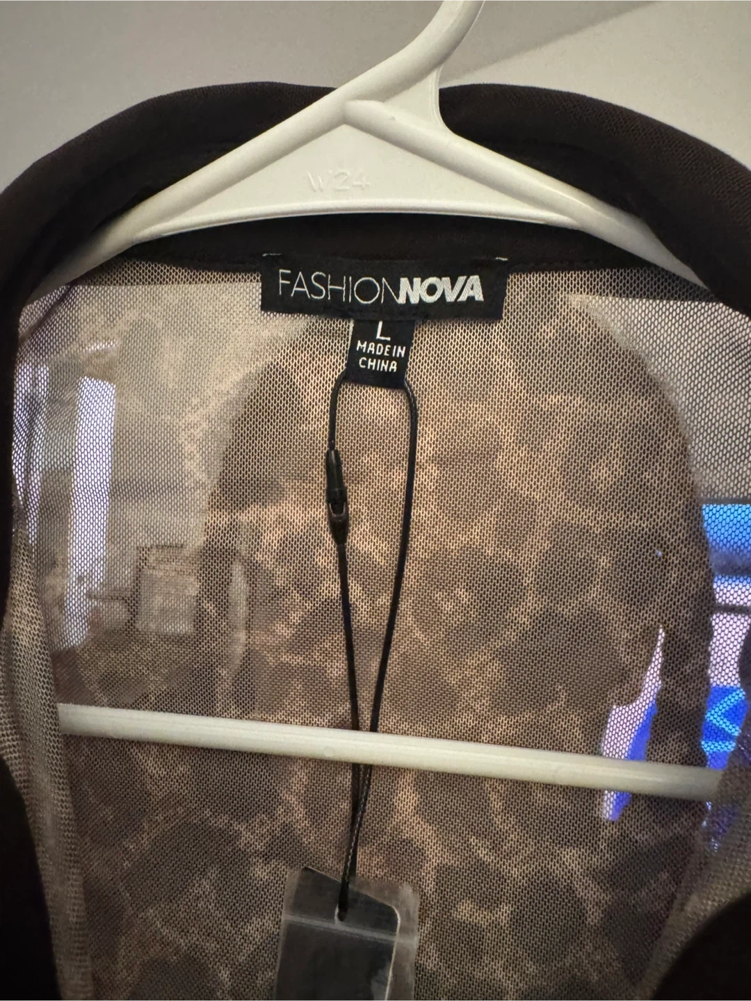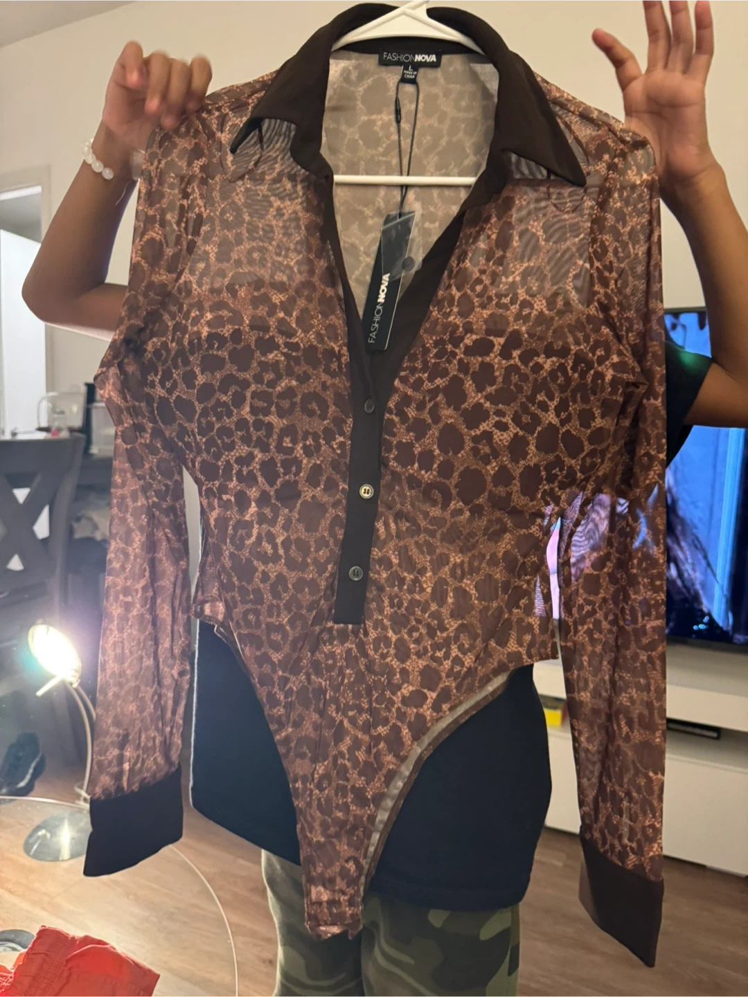 Selling a Fashion Nova leopard print bodysuit in size large! It features a sheer, mesh-like material with long sleeves and a collared neckline. Perfect for a night out or a trendy casual look