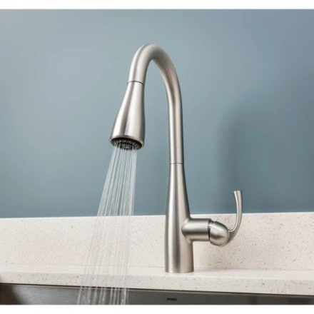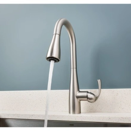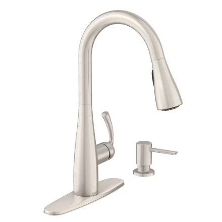 Brand new sealed MOEN Essie pull-down kitchen faucet/tap with soap dispenser in spot-resistant stainless steel. Model 87014SRS. Style meets functionality in the Essie pull-down sprayer kitchen faucet from MOEN, boasting transitional design appeal while showcasing several of MOEN's top innovative features. Essie utilizes Reflex technology and Powerclean technology that delivers 50% more spray power. Spot Resist stainless finish resists fingerprints and water spots. Equipped with the Reflex system for smooth operation, easy movement, and secure docking of the pull-down spray head. Features Duralock quick connect system for easy installation. Pull-down design offers at-your-fingertips water delivery. Optional soap/lotion dispenser and deck plate (escutcheon) included for a 1, 2, 3, or 4-hole sink configuration. Deck plate included.