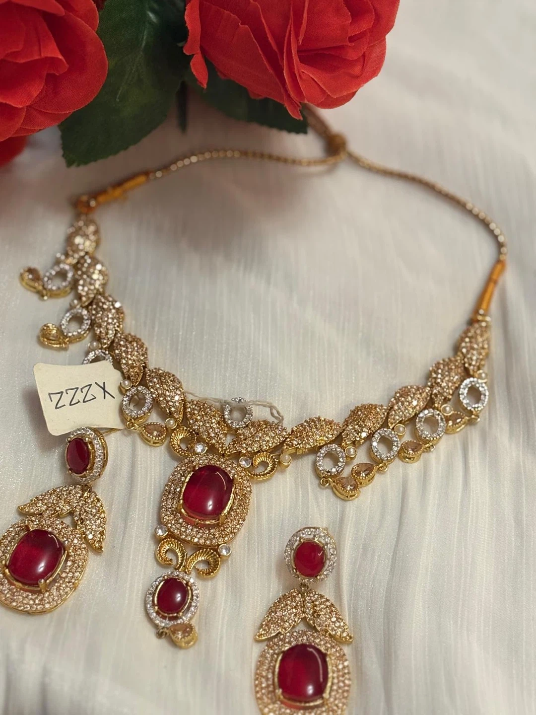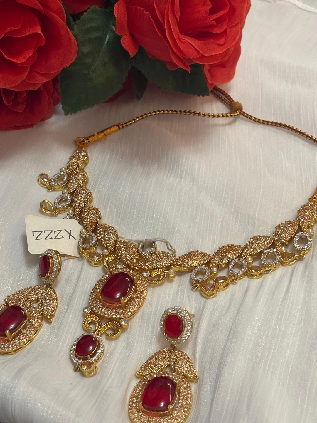 Beautiful red and gold necklace with matching earrings! This set is perfect for adding a touch of elegance to any outfit. The intricate detailing and vibrant colours make it a standout piece
