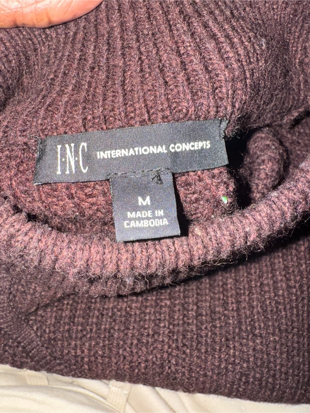 Selling an INC International Concepts sweater in size M. It's a stylish and comfortable piece, perfect for layering or wearing on its own. The sweater has a unique design and is made in Cambodia.