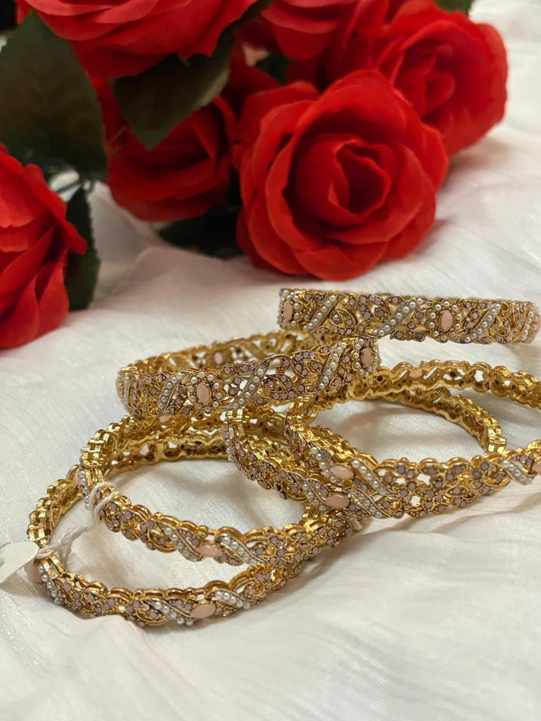 Selling a beautiful set of gold bangles. They feature intricate detailing with small pearl-like accents and a delicate design. Perfect for adding a touch of elegance to any outfit!