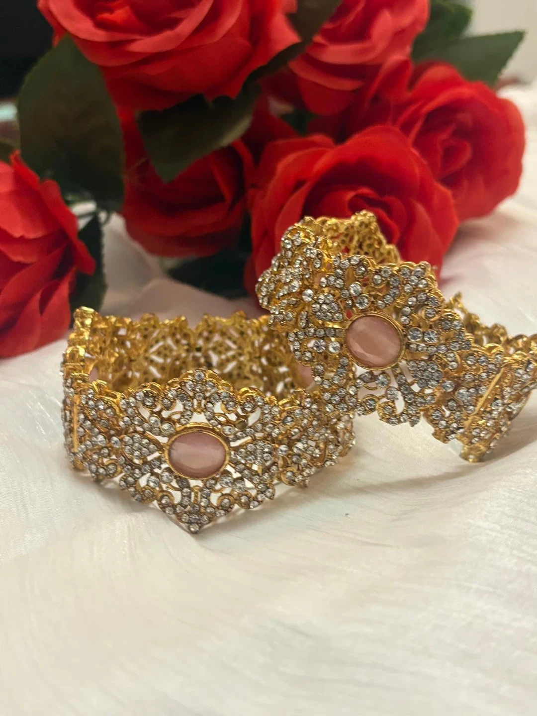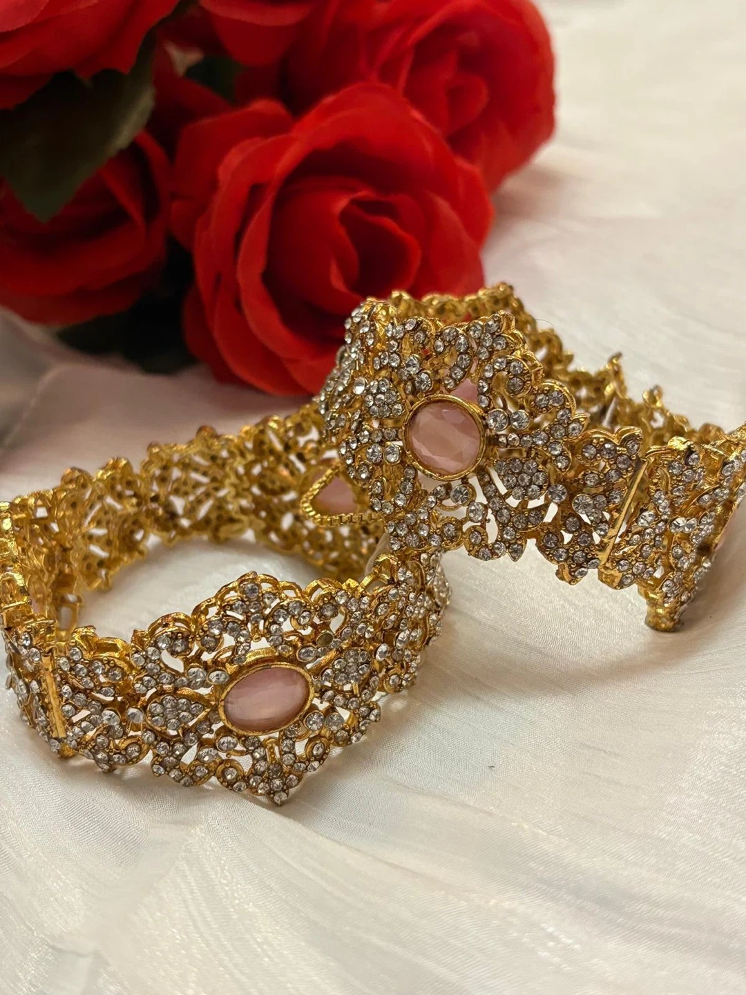 These are a pair of beautiful gold tone bangle bracelets. They feature an intricate design with rhinestones and a pink oval stone in the center. Perfect for adding a touch of elegance to any outfit!