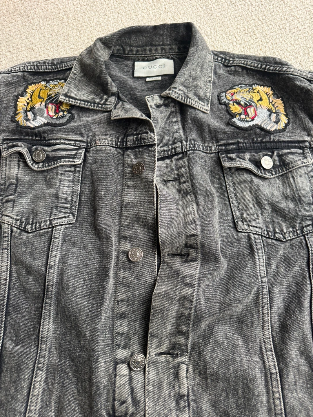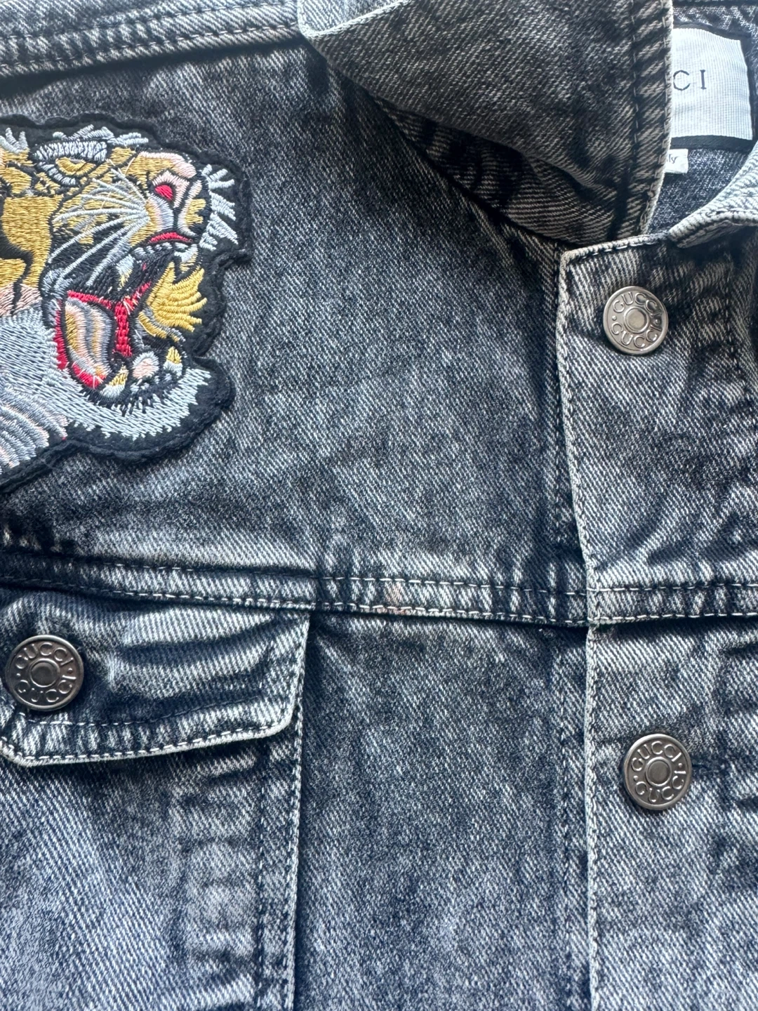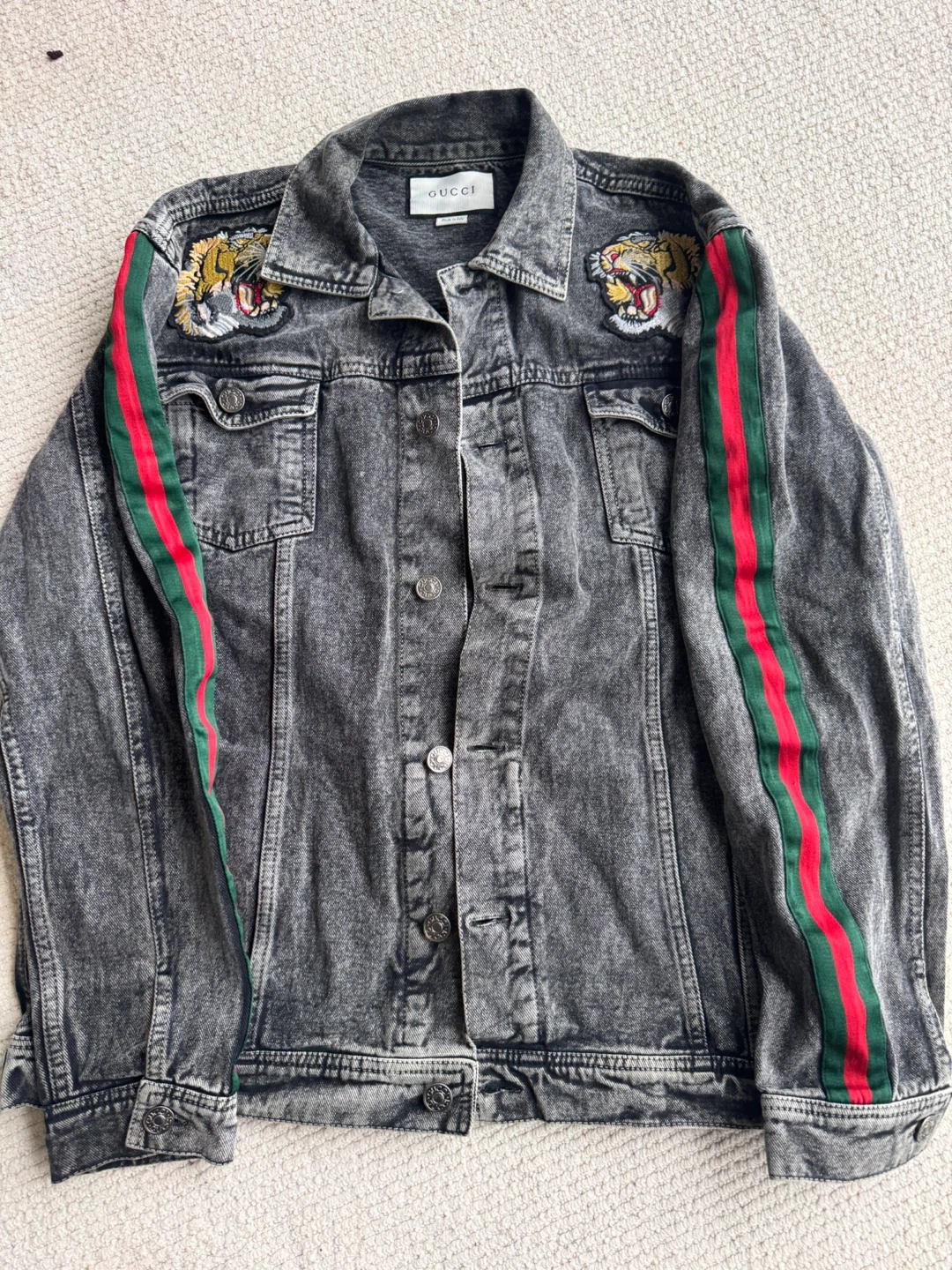 Selling a stylish Gucci denim jacket in a size medium. It features the iconic Gucci stripe on the sleeves and tiger embroidery on the chest. The jacket is in great condition and ready for a new home!