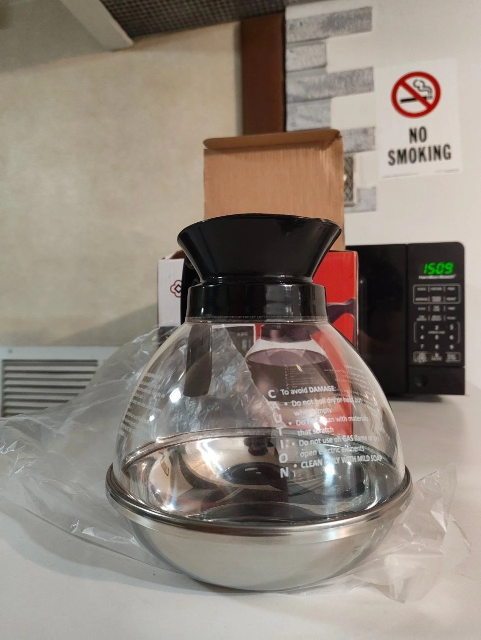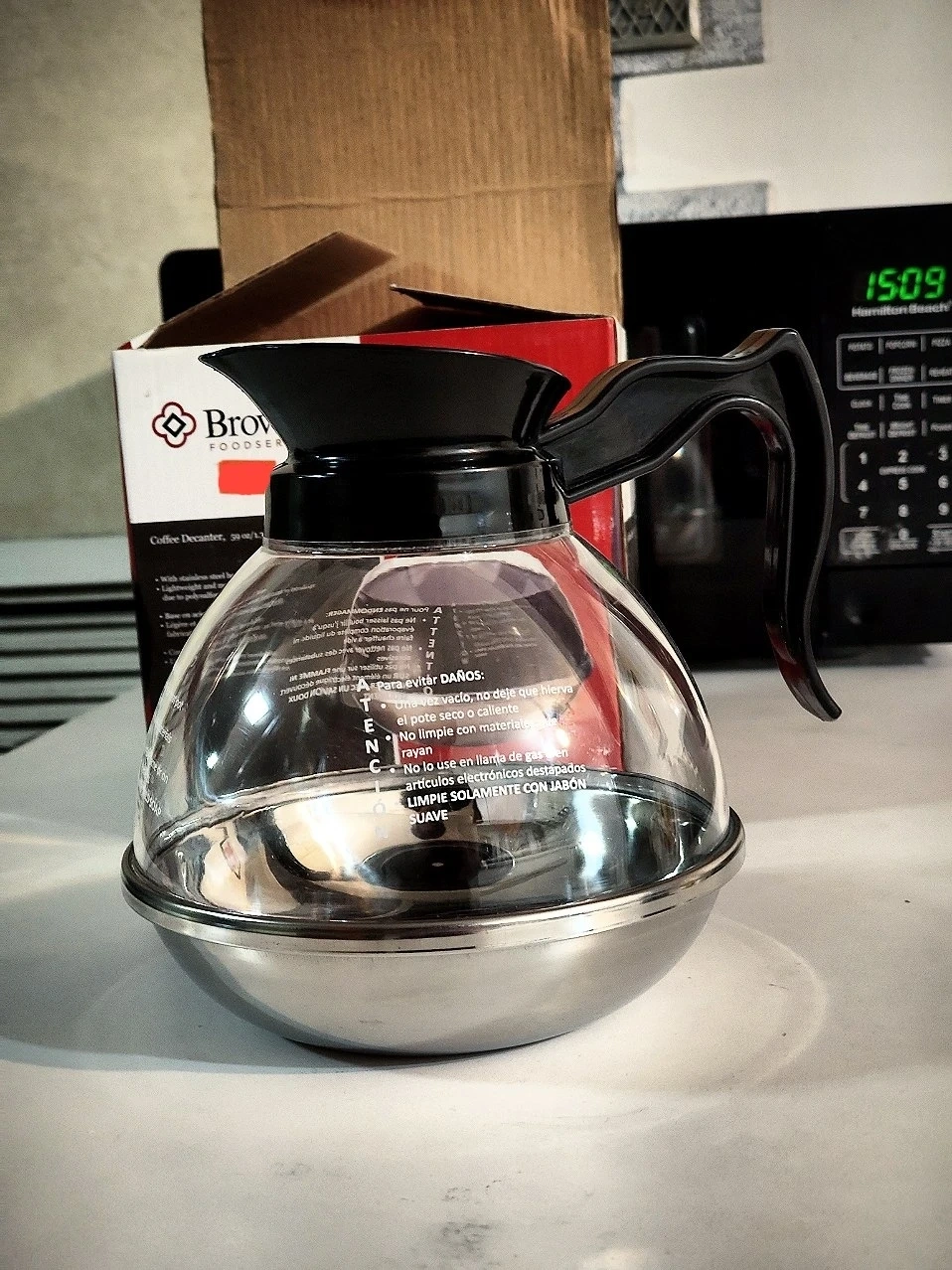 Selling a Browne Foodservice coffee decanter! It holds 59 oz or 1.75 L. It features a stainless steel base and is lightweight. The decanter is more resistant to breakage due to its polysulfone construction. Comes with the original box