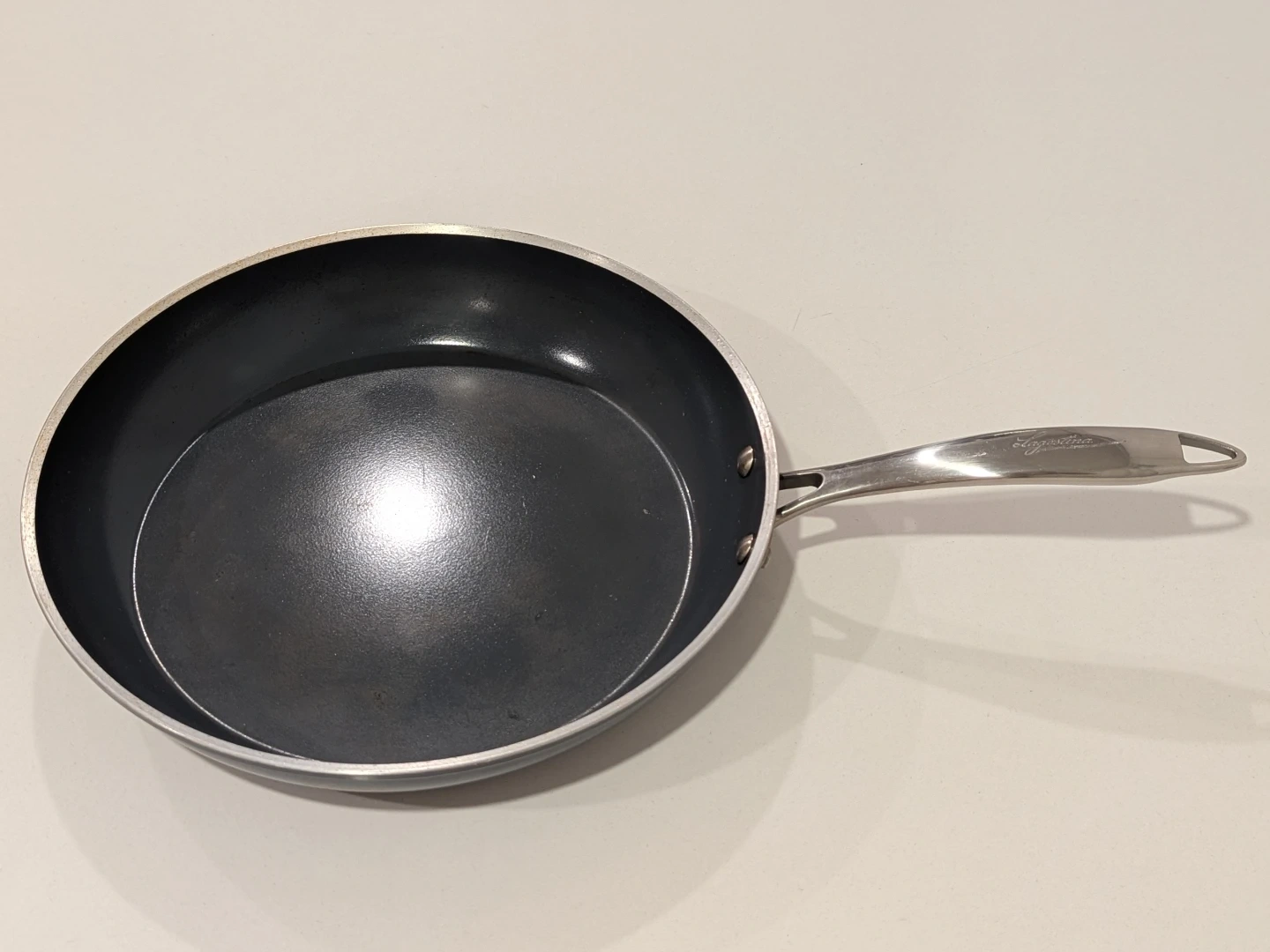 Selling a Lagostina frying pan. It's in good used condition and ready for your next culinary adventure! It has a nonstick surface for easy cooking and cleaning, and the handle is riveted for durability