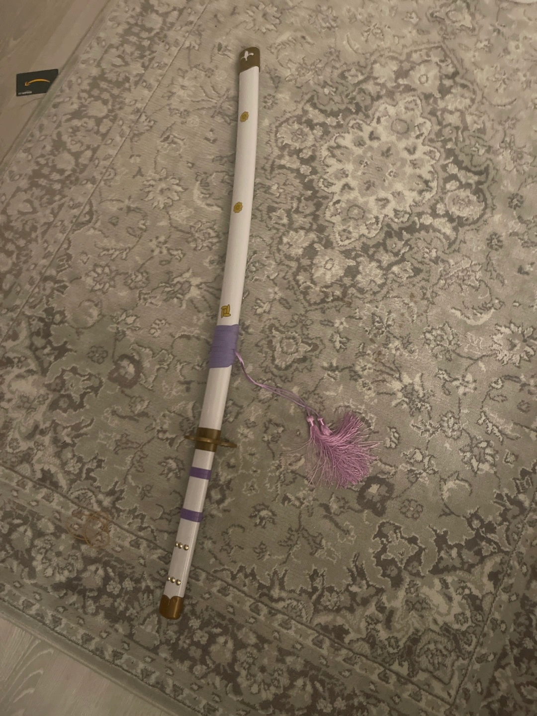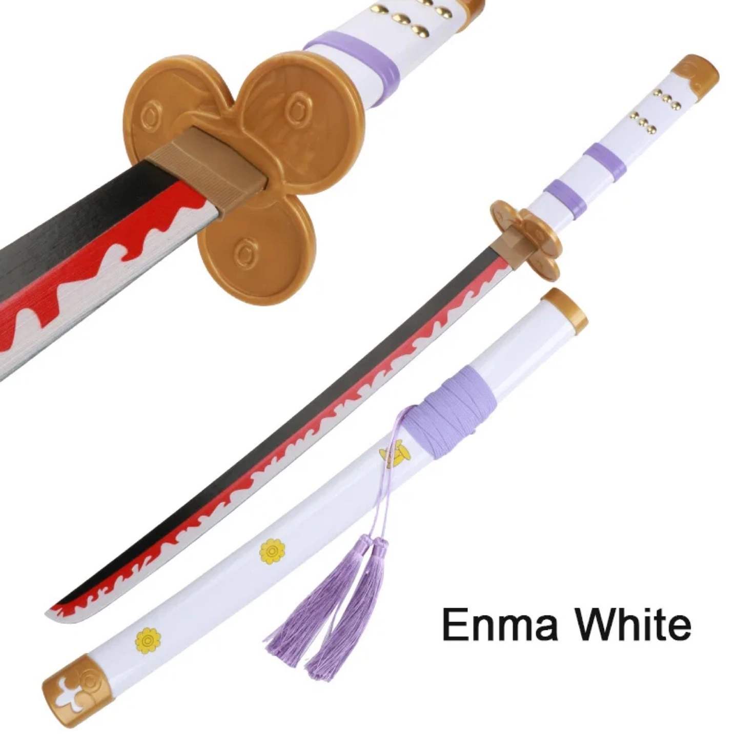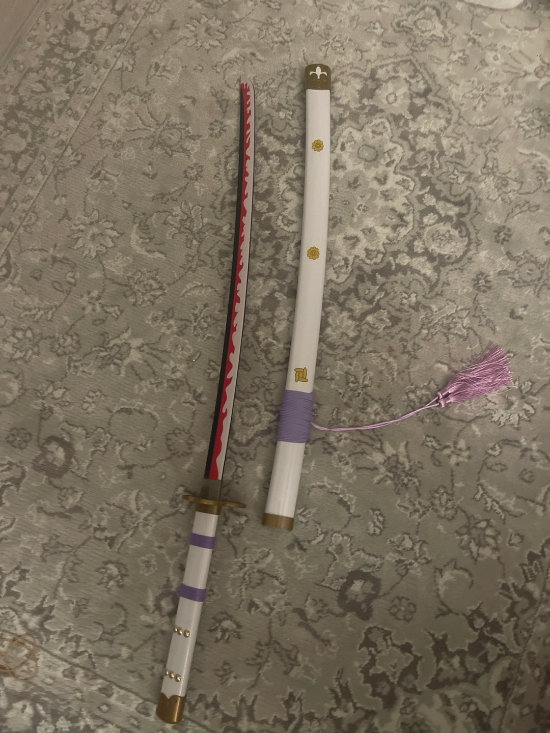 Selling Zoro Katana. The sheathe is white with purple accents and gold flower details, While the blade is made from bamboo, colours black, red and white with a firey look. Great for cosplay or just a display in your house. (bamboo balde and everything else plastic. 80cm)