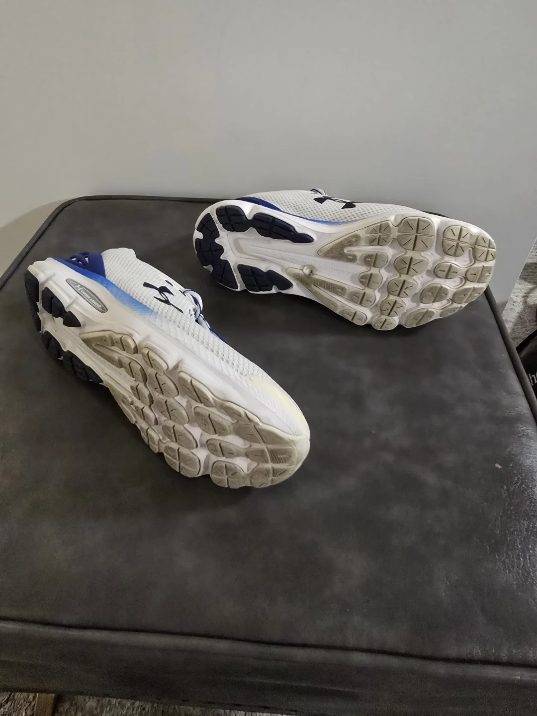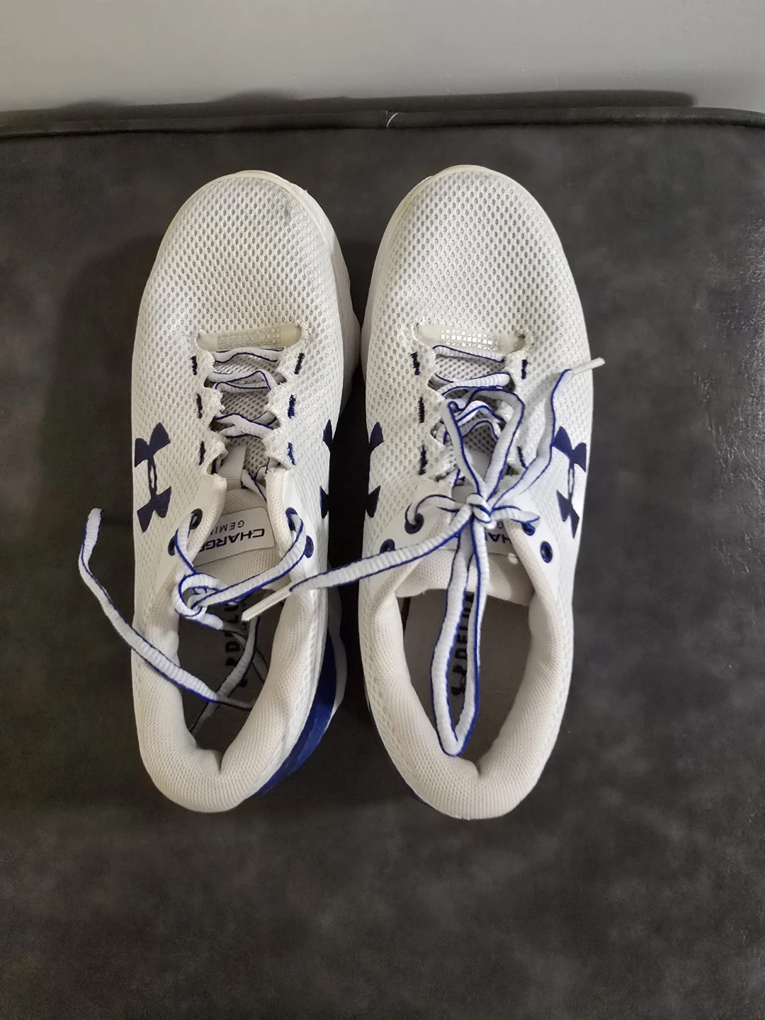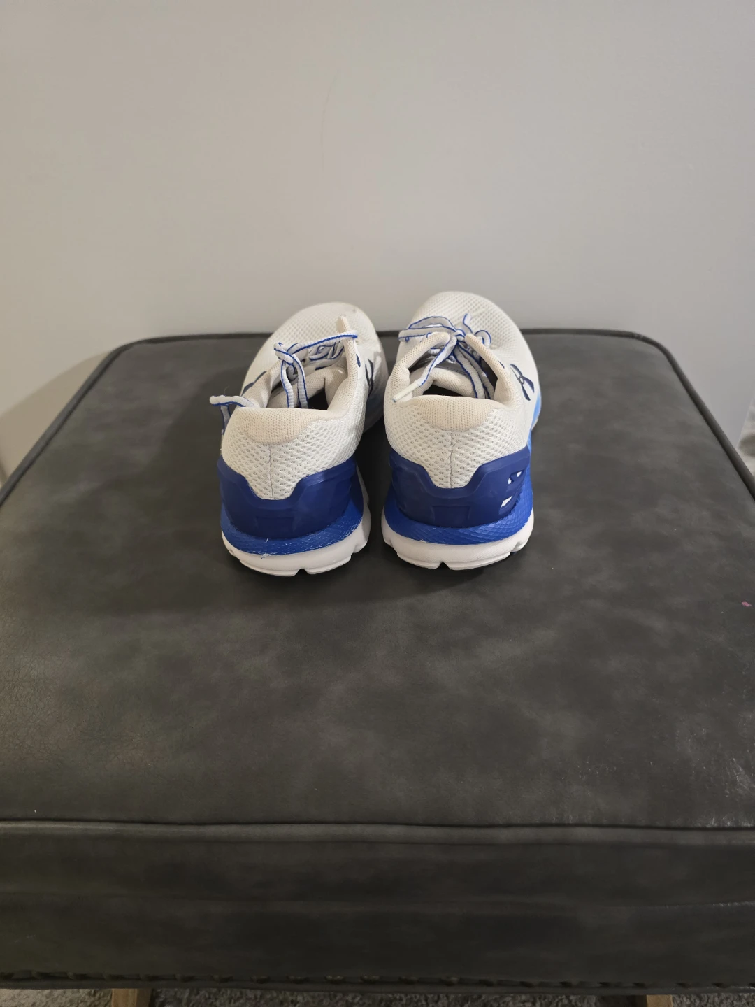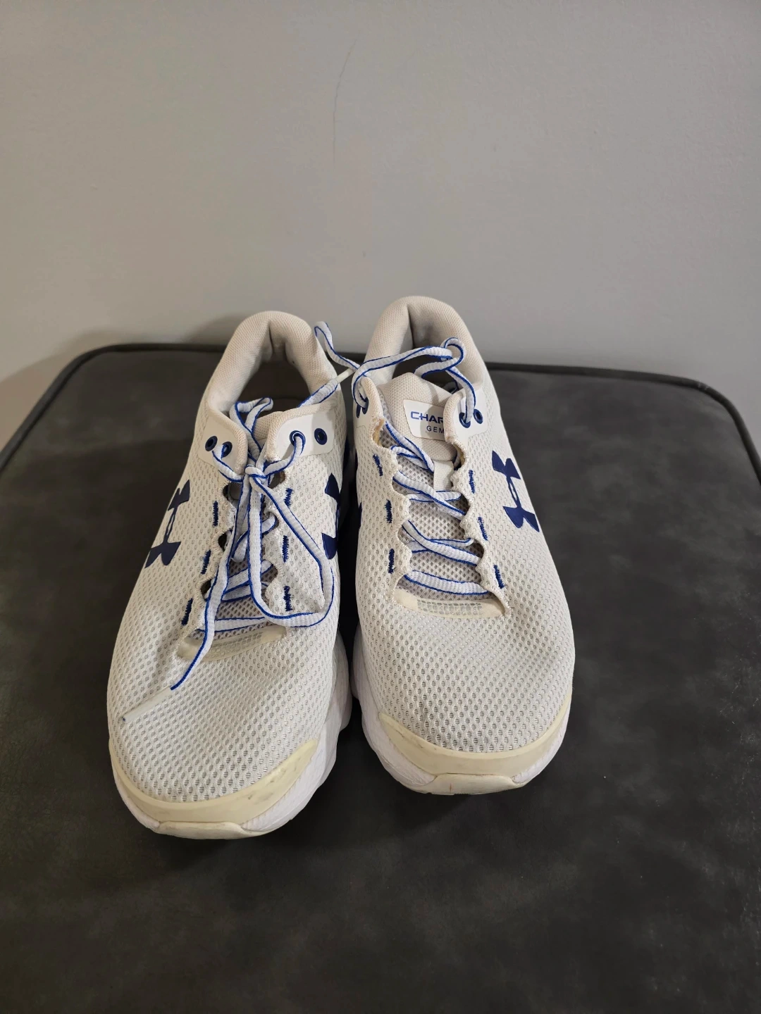Selling a pair of Under Armour Charged Assert 9 running shoes. They are white with blue accents and in good condition. Perfect for running or everyday wear!