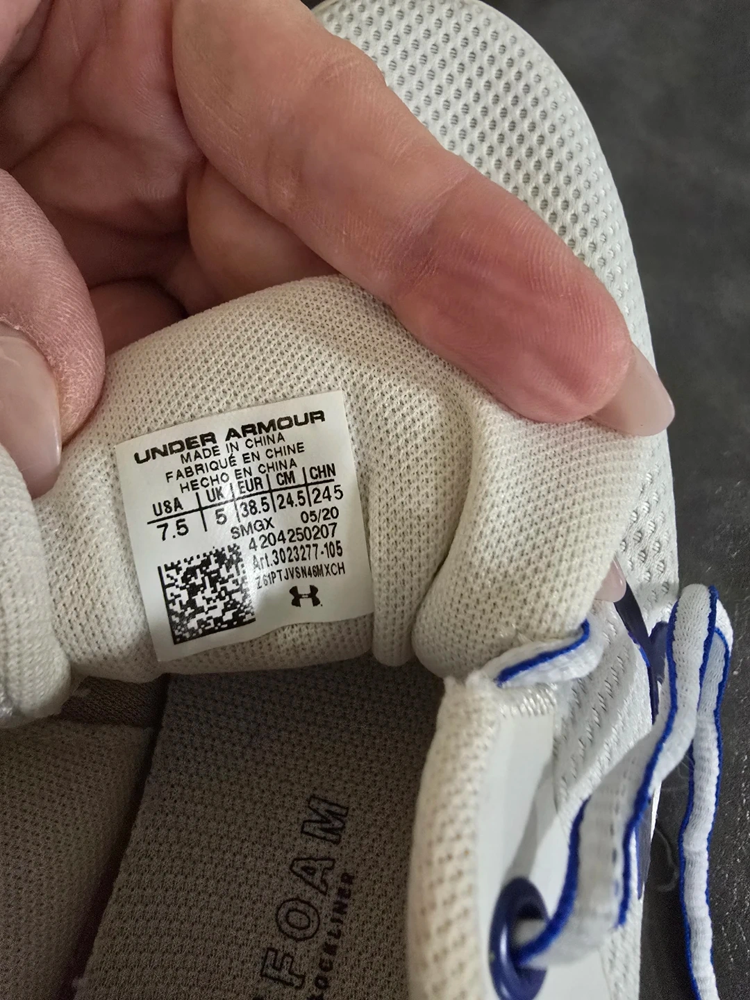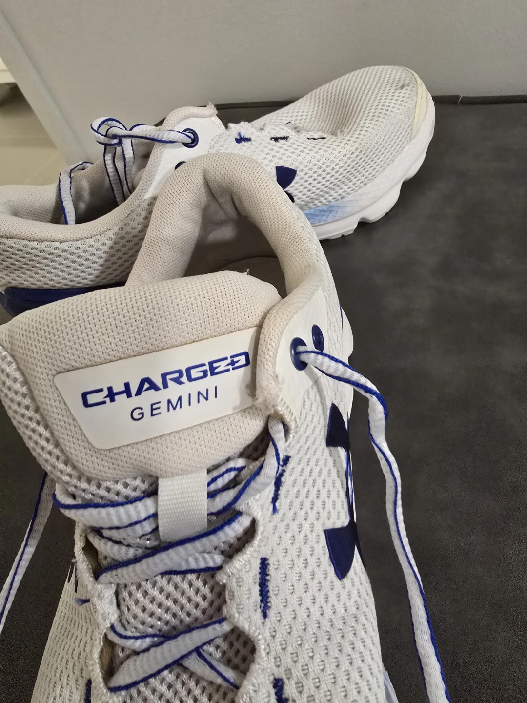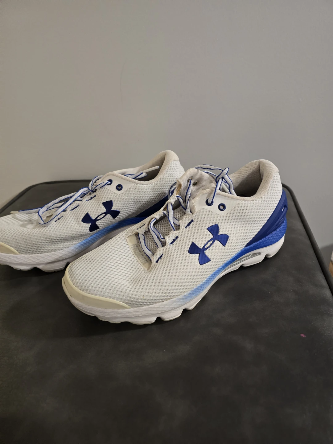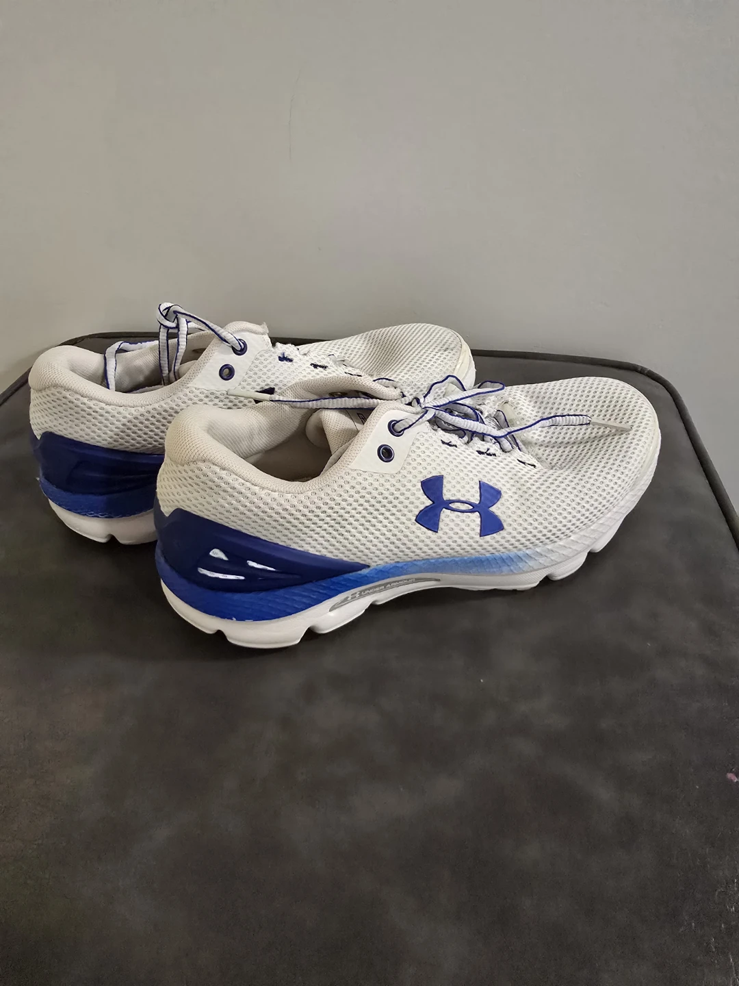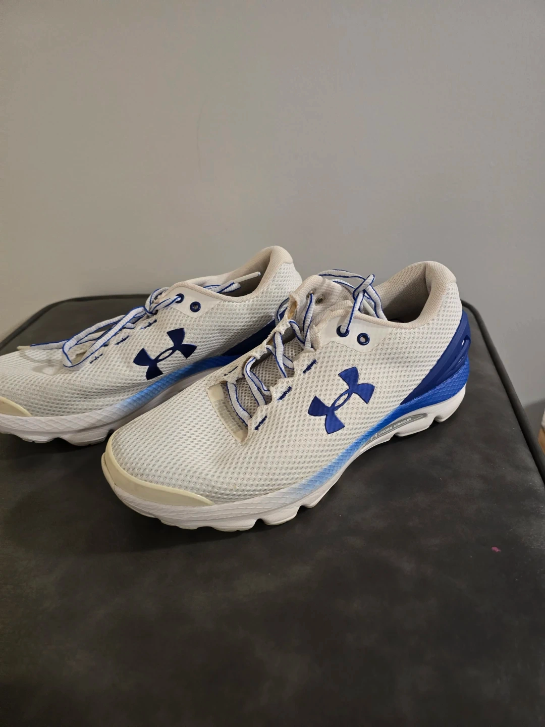 Selling a pair of Under Armour Charged Assert 9 running shoes. They are white with blue accents and in good condition. Perfect for running or everyday wear!
