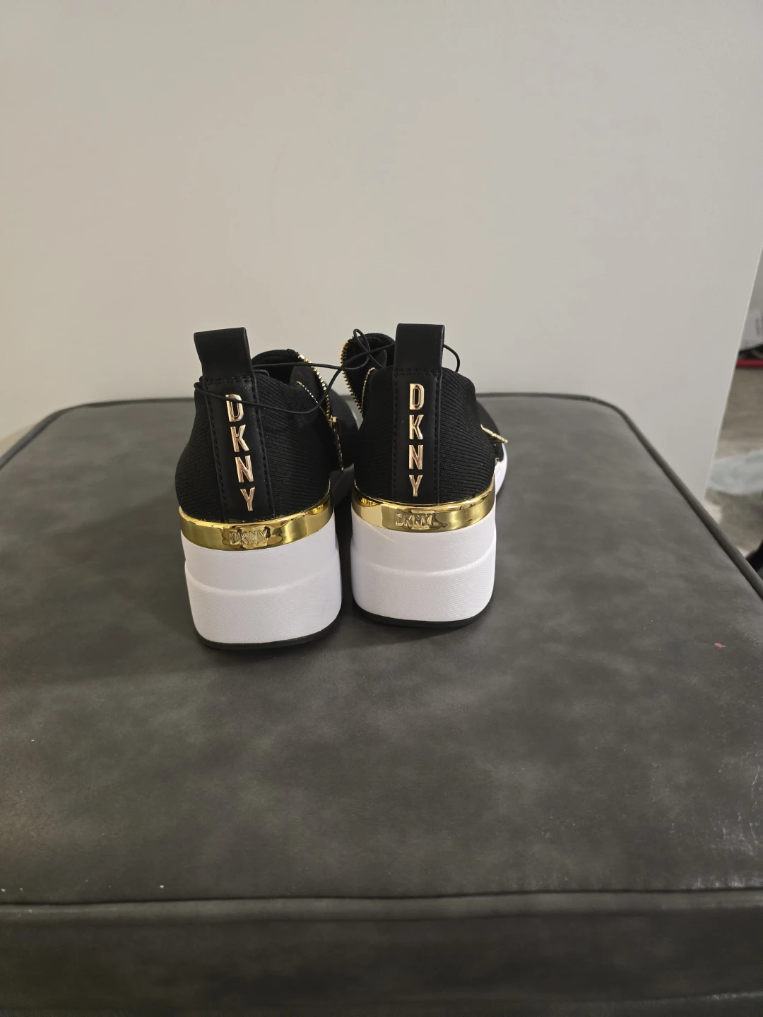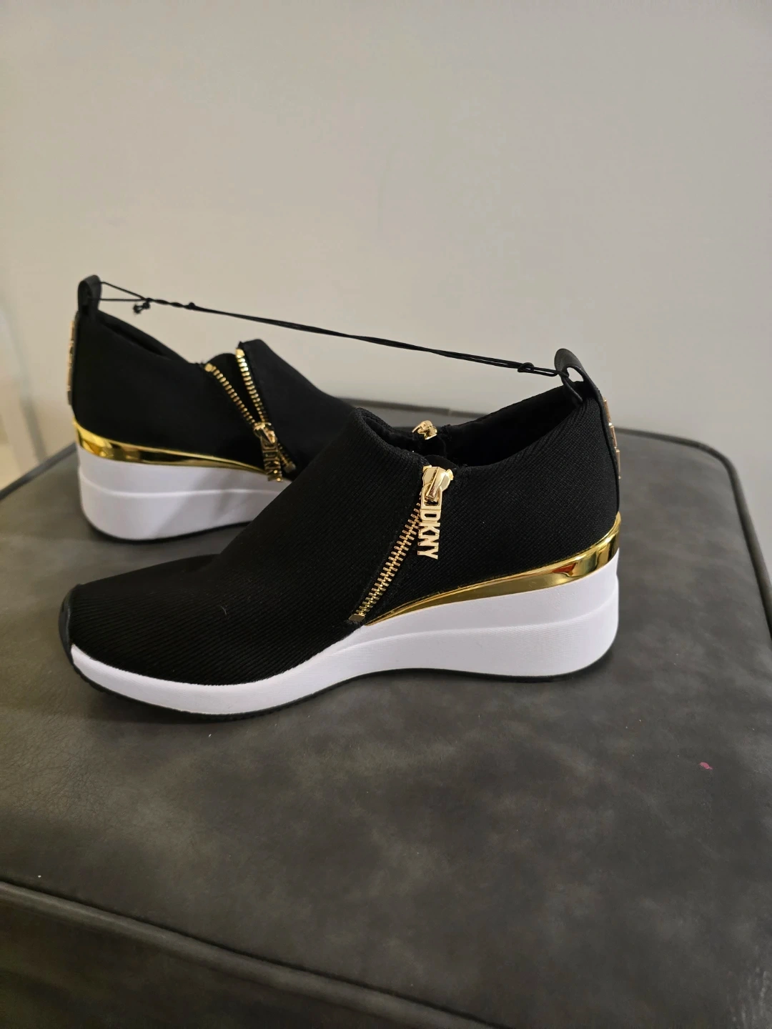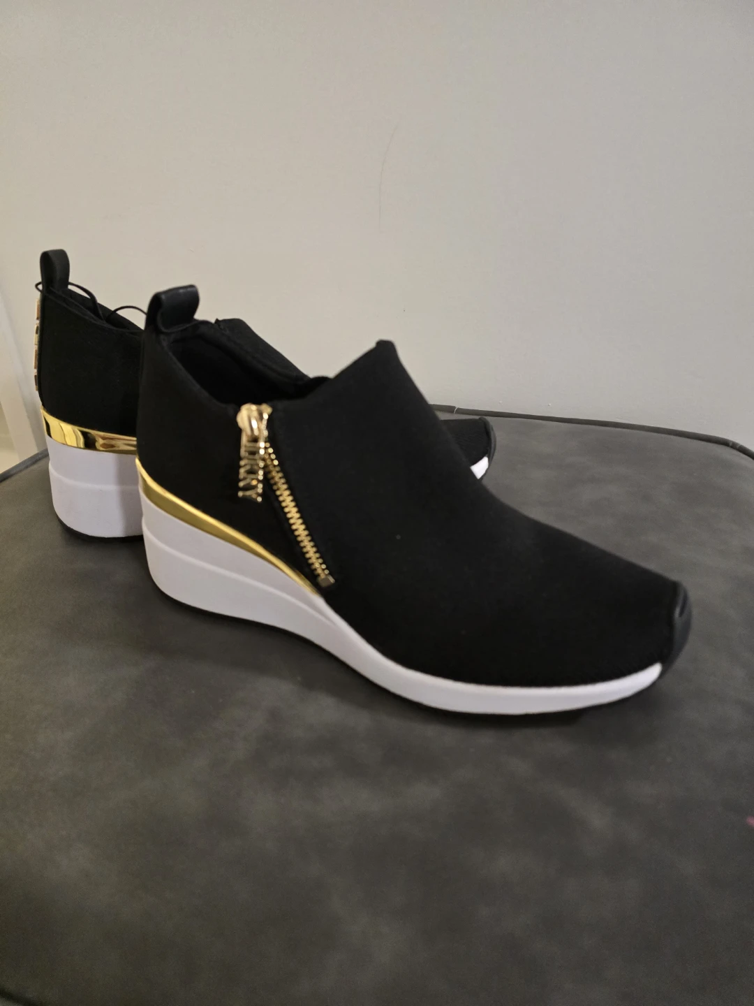 These DKNY wedge sneakers are in great condition and ready for a new owner! They feature a stylish black upper with a gold accent and a comfortable wedge sole. Perfect for adding a bit of height and style to your everyday look