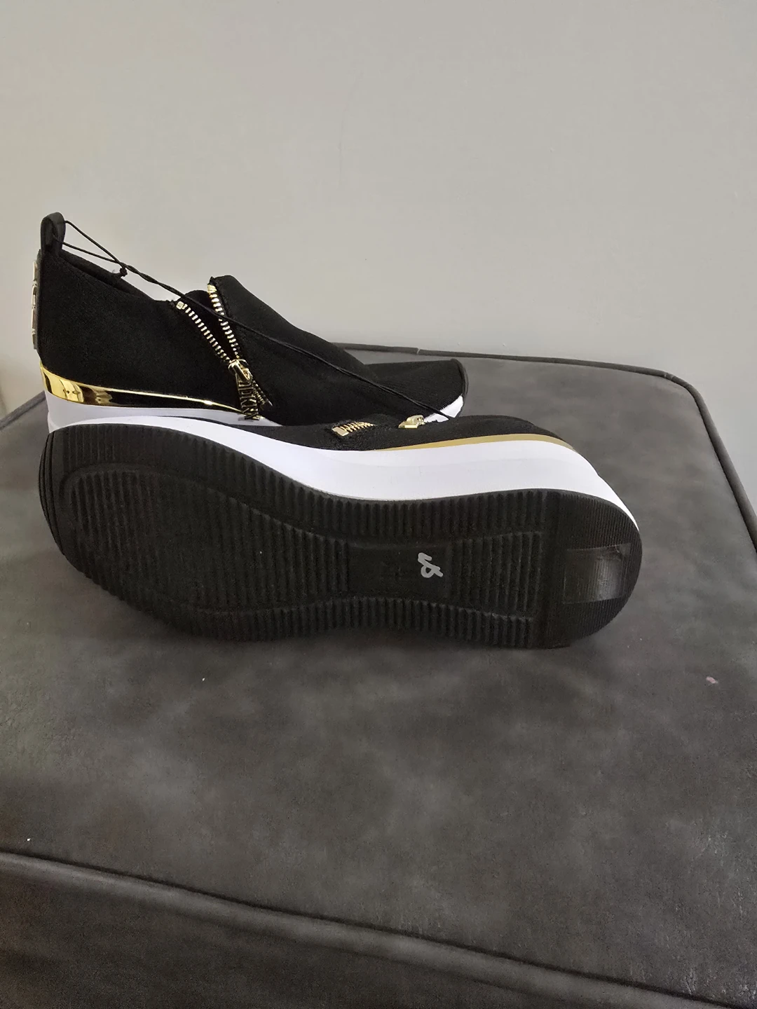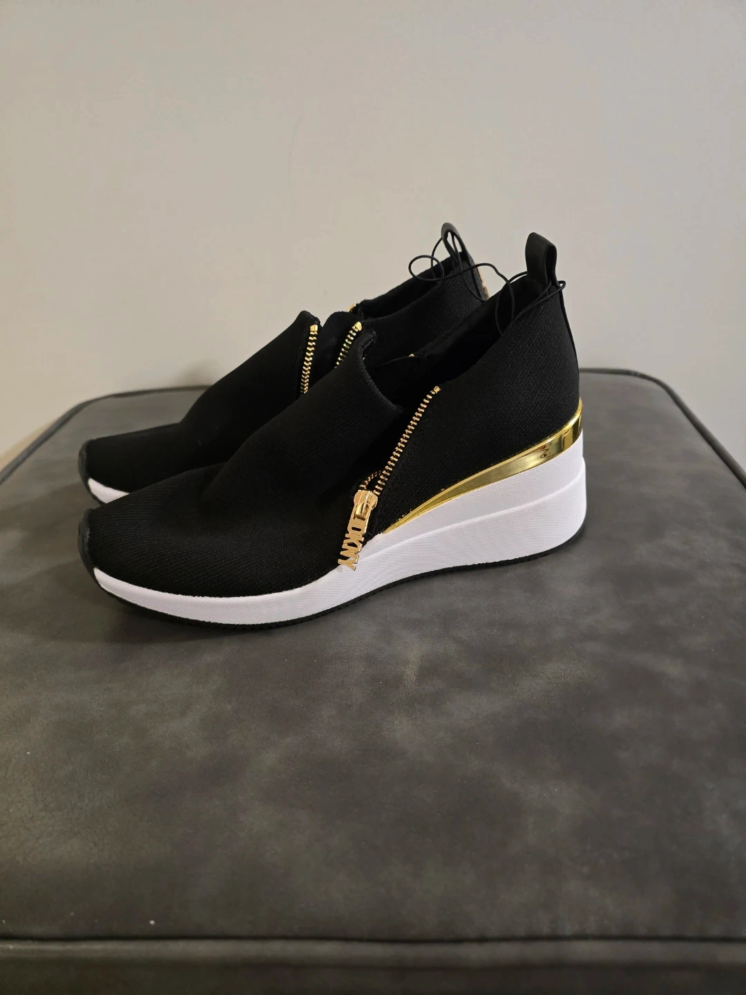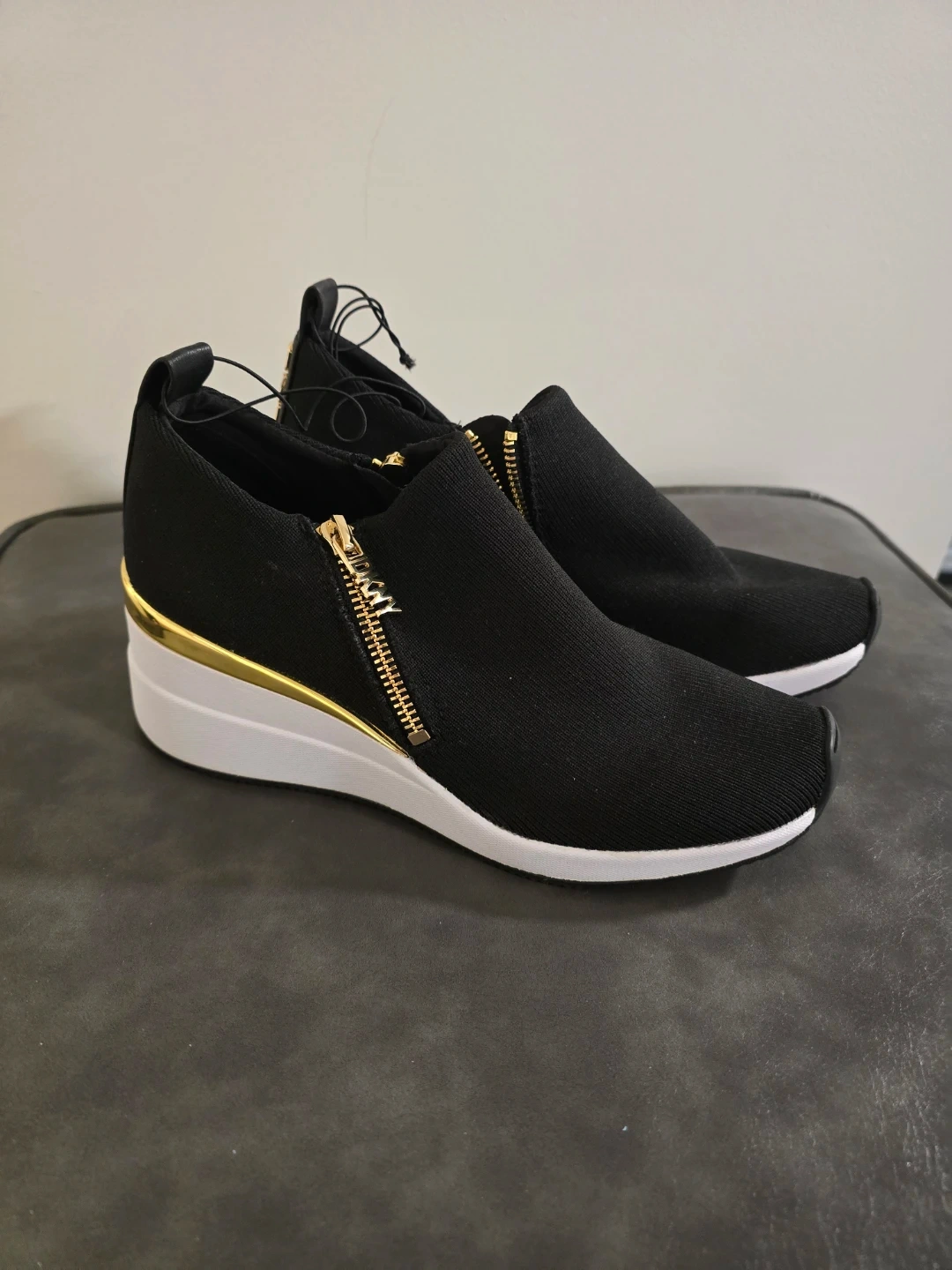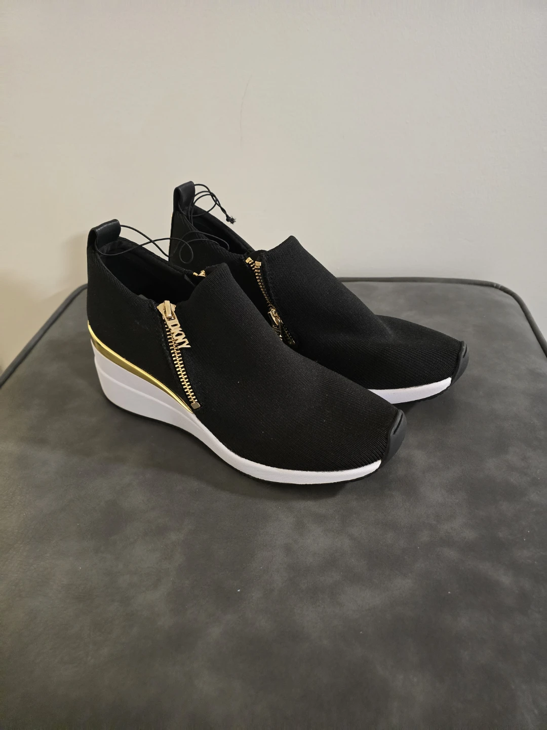 These DKNY wedge sneakers are in great condition and ready for a new owner! They feature a stylish black upper with a gold accent and a comfortable wedge sole. Perfect for adding a bit of height and style to your everyday look