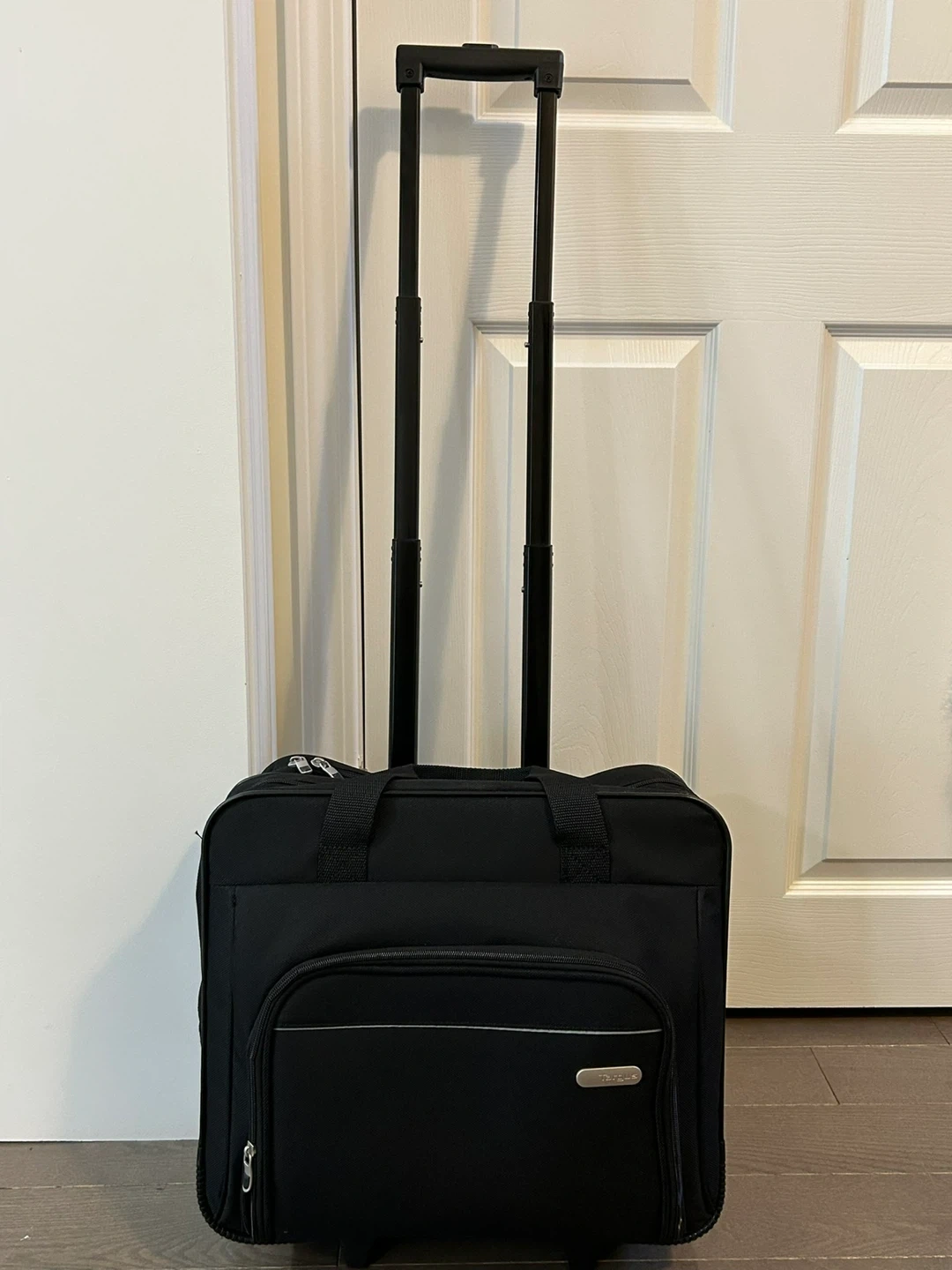 This rolling tote is perfect for travel or work! It's in great shape and ready for a new adventure. The black colour is sleek and professional, and it's super convenient with its rolling design.