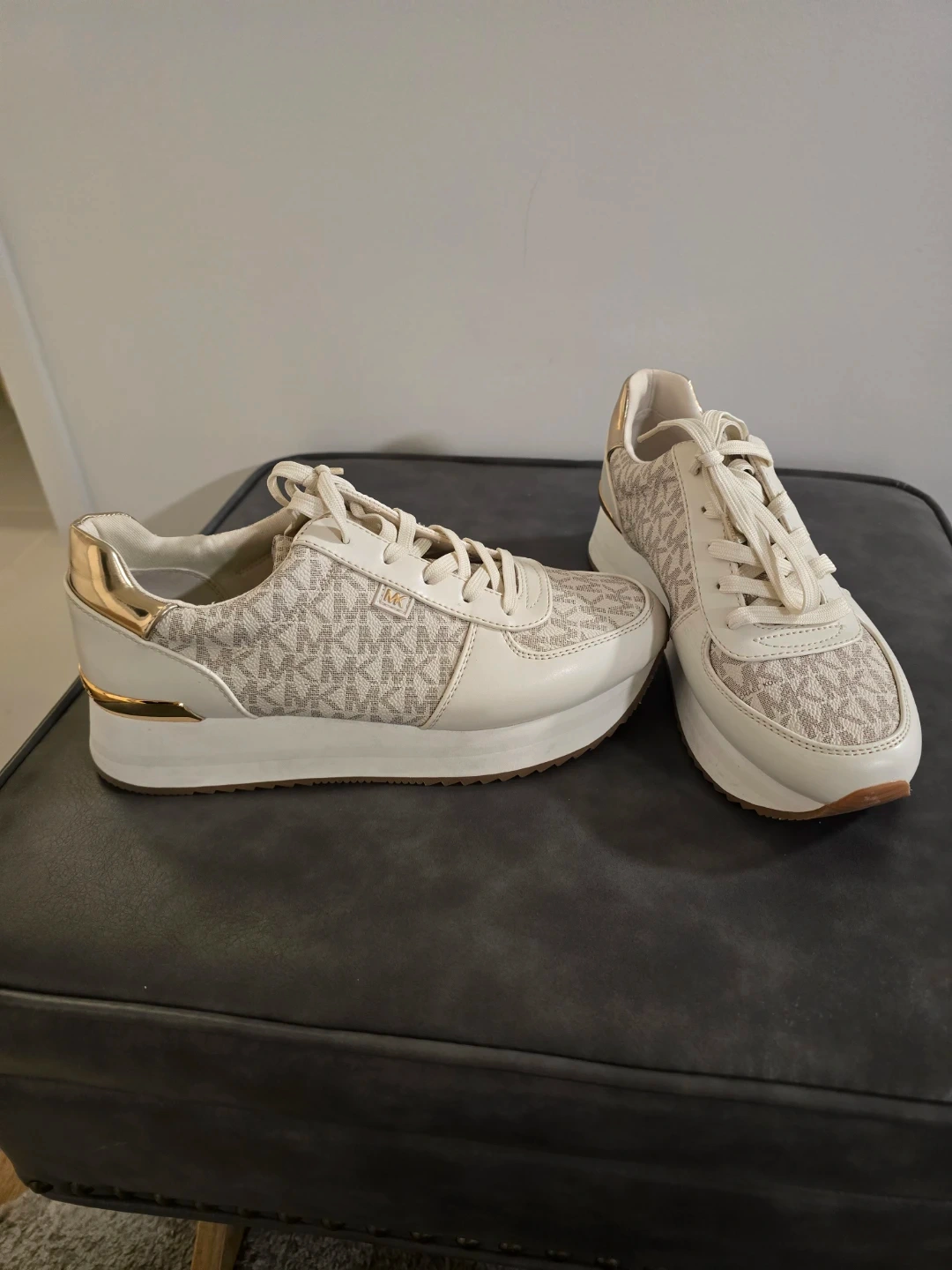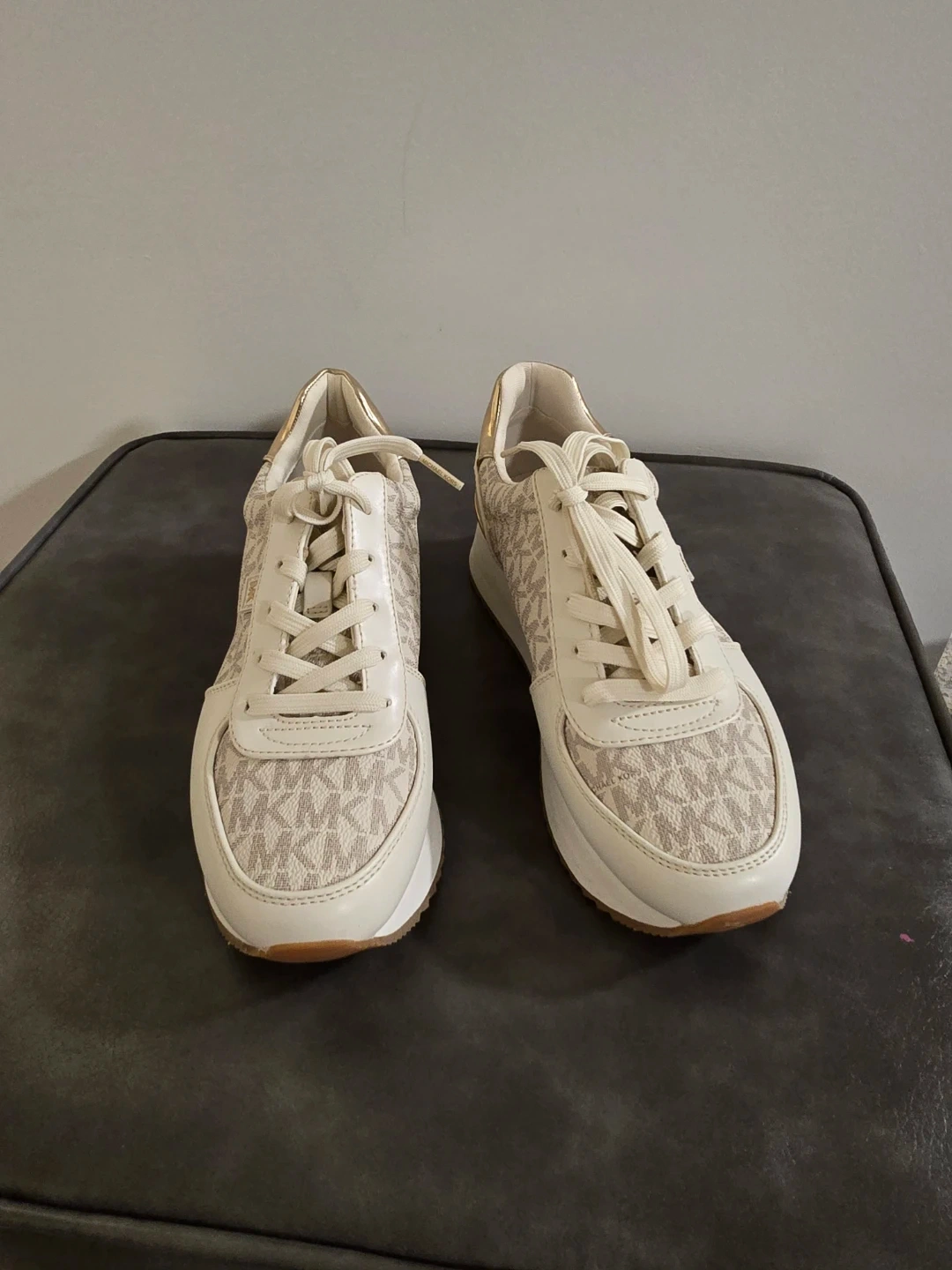 Selling a pair of Michael Kors sneakers in cream and gold. They have a stylish MK print and are in great condition! Perfect for adding a touch of luxury to your everyday look