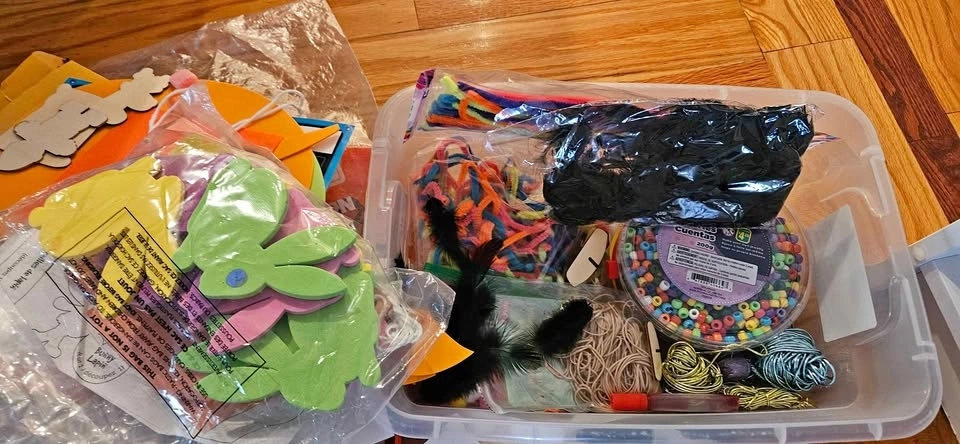 Beads, alphabet beads, elastic bands, feathers, pipe cleaners, puff balls, foam cut outs, stickers. Kids craft scissors as well.