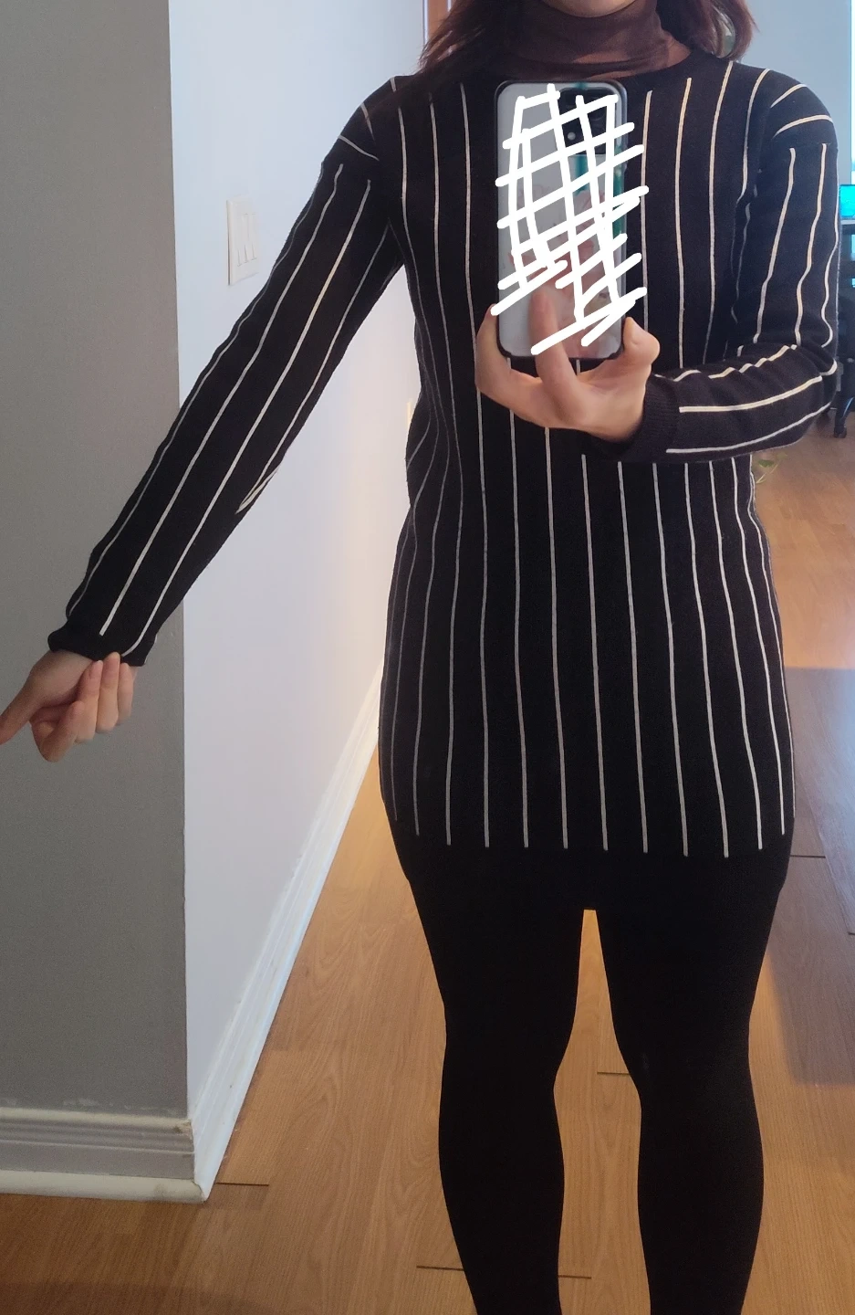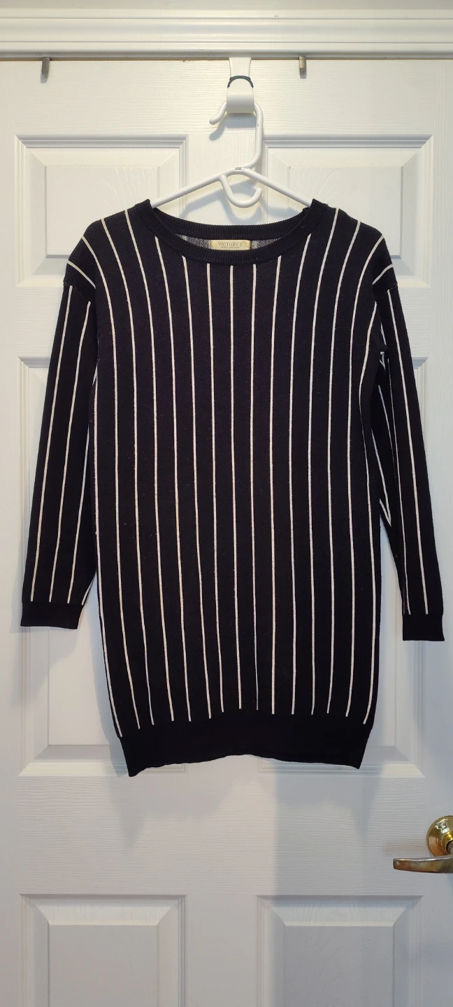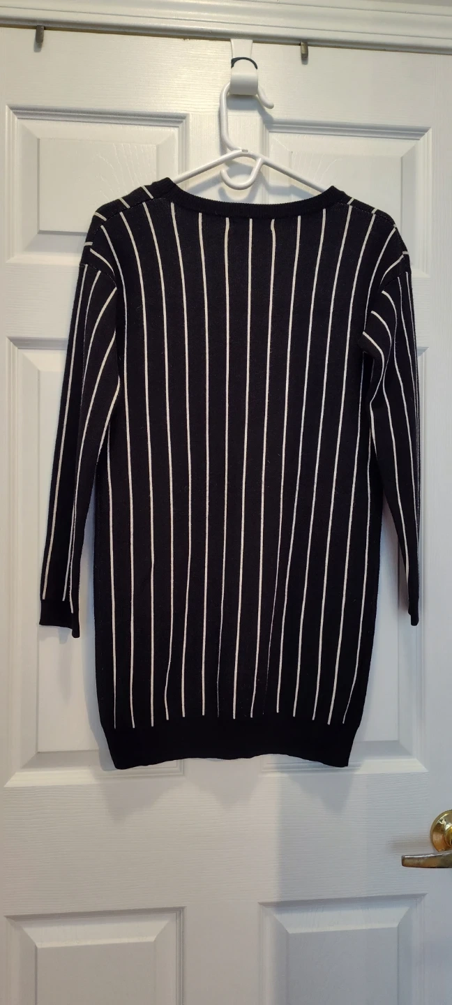 Here's a sweater with a classic black and white striped design! It's perfect for adding a touch of style to any outfit. The sweater features a comfortable fit and is made from a soft material, making it ideal for everyday wear. It's in great condition and ready for a new home!
