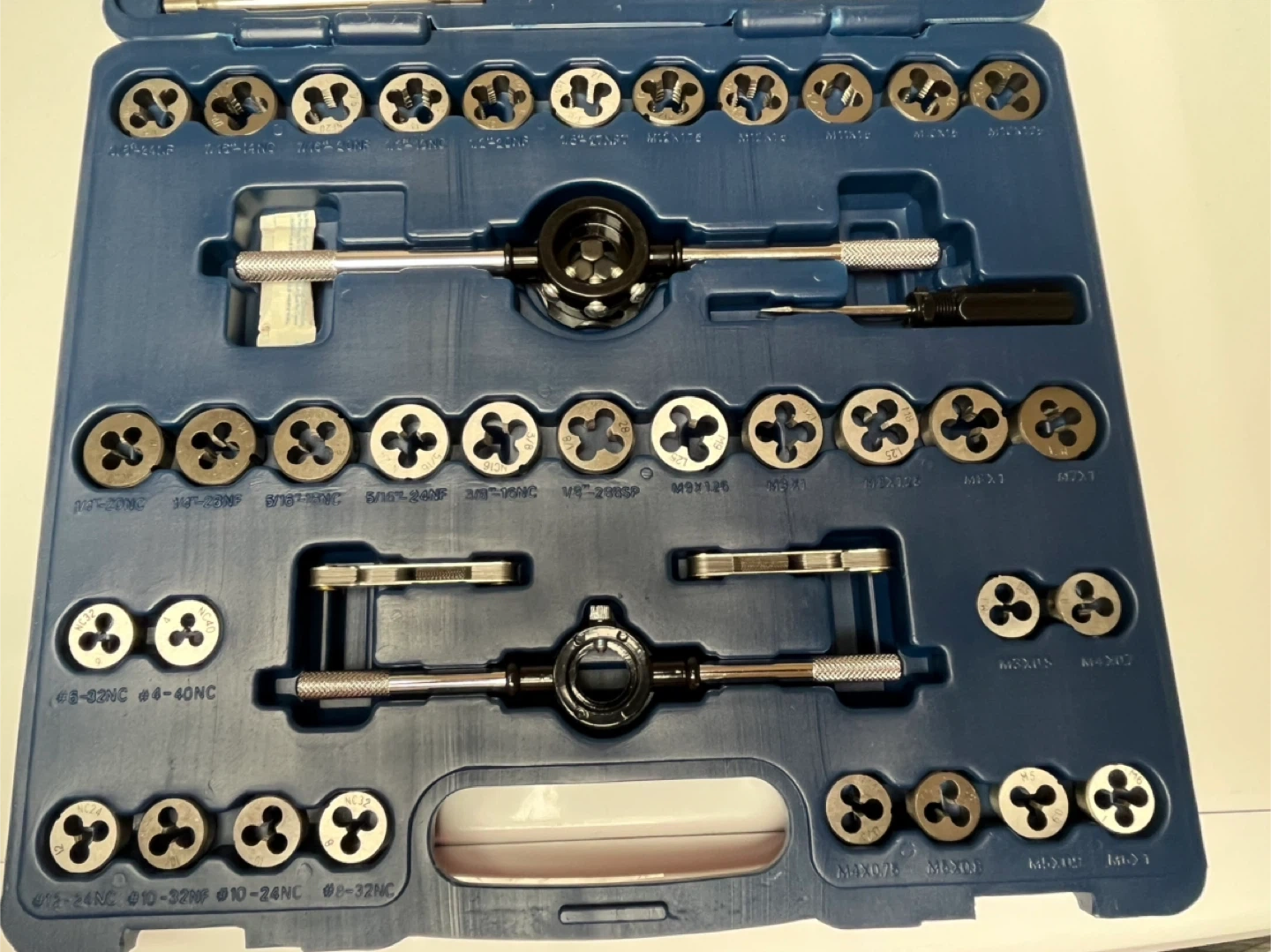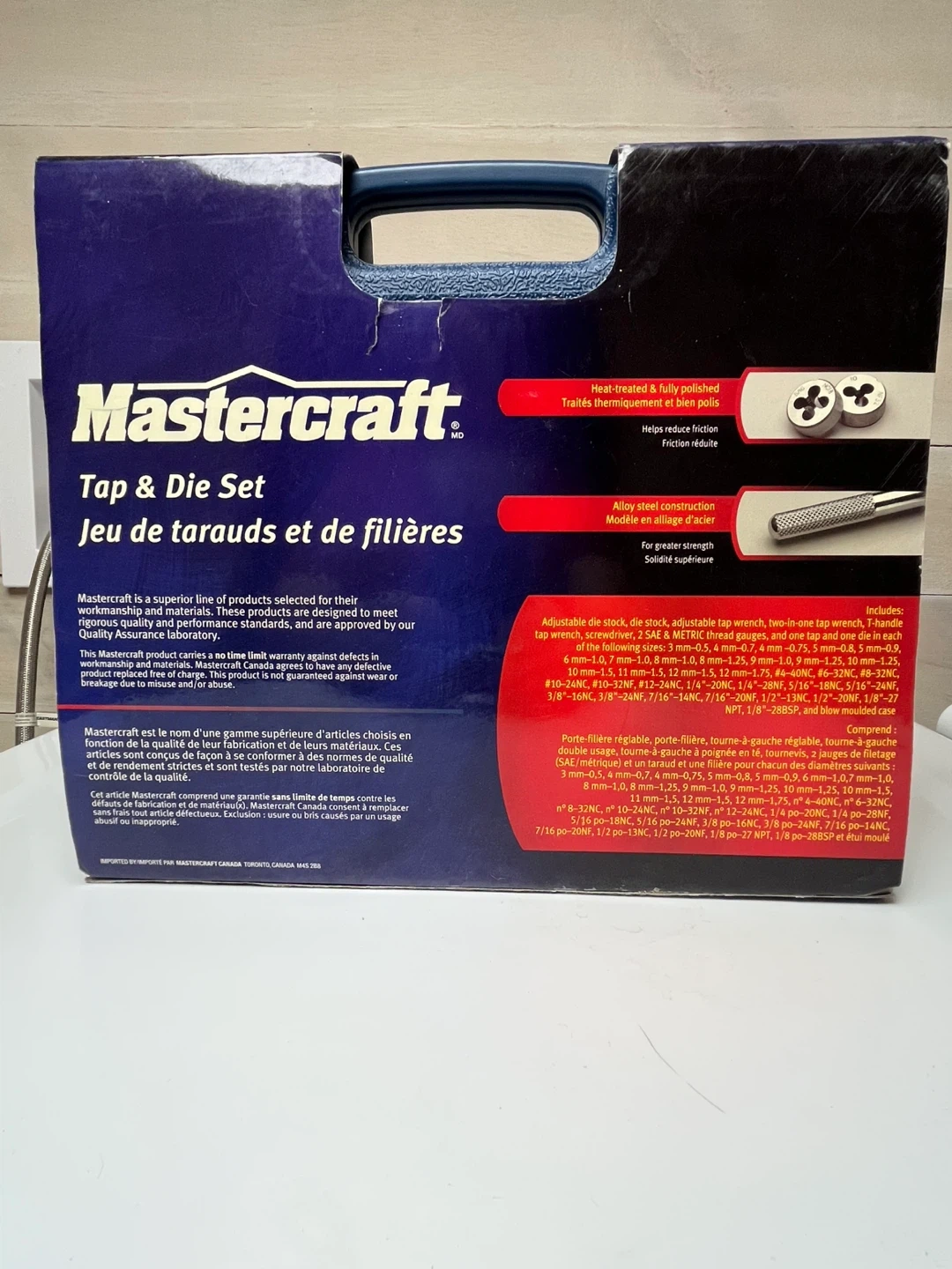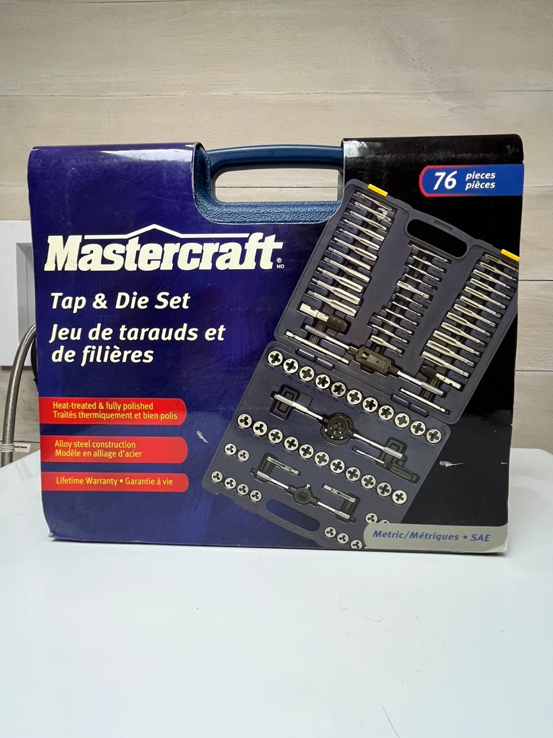 Selling a Brand New In Box Mastercraft Tap & Die Set with 76 pieces. It includes an adjustable die stock, die stock, adjustable tap wrench, two-in-one tap wrench, T-handle tap wrench, screwdriver, 2 SAE & METRIC thread gauges, one tap and one die in each of the following sizes: 3 mm–0.5, 4 mm–0.7, 4 mm –0.75, 5 mm–0.8, 5 mm–0.9, 6 mm–1.0, 7 mm–1.0, 8 mm–1.0, 8 mm–1.25, 9 mm–1.0, 9 mm–1.25, 10 mm–1.25, 10 mm–1.5, 11 mm–1.5, 12 mm–1.5, 12 mm–1.75, #4–40NC, #6–32NC, #8–32NC, #10–24NC, #10–32NF, #12–24NC, 1/4"–20NC, 1/4"–28NF, 5/16"–18NC, 5/16"–24NF, 3/8"–16NC, 3/8"–24NF, 7/16"–14NC, 7/16"–20NF, 1/2"–13NC, 1/2"–20NF, 1/8"–27 NPT, 1/8"–28BSP, and blow molded case