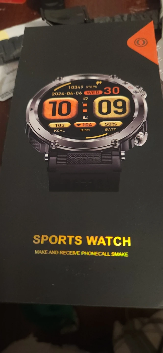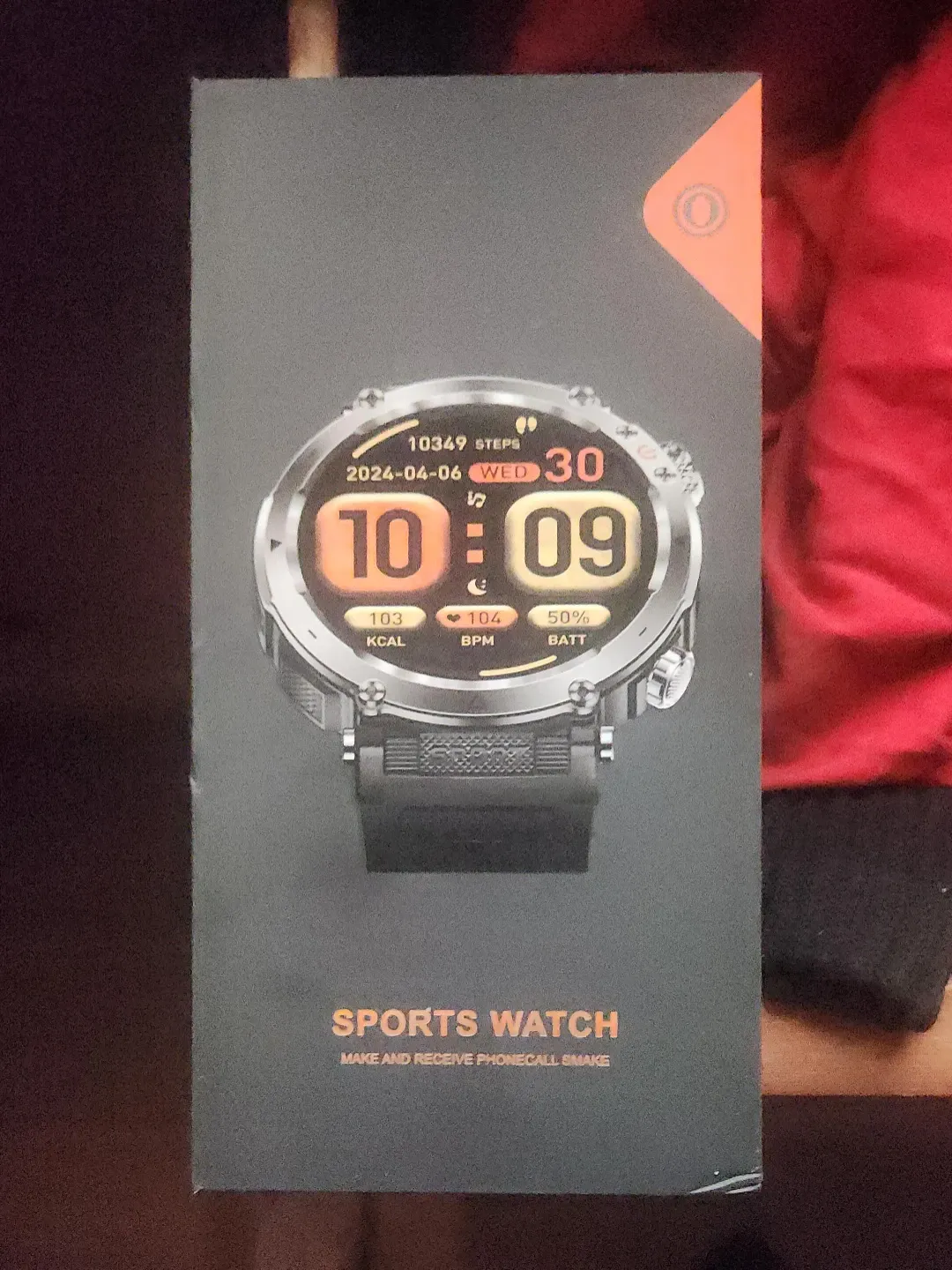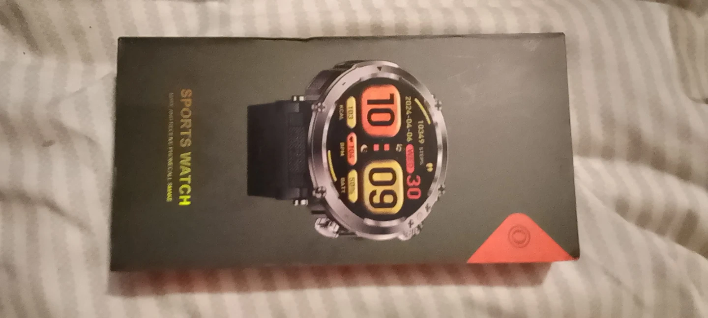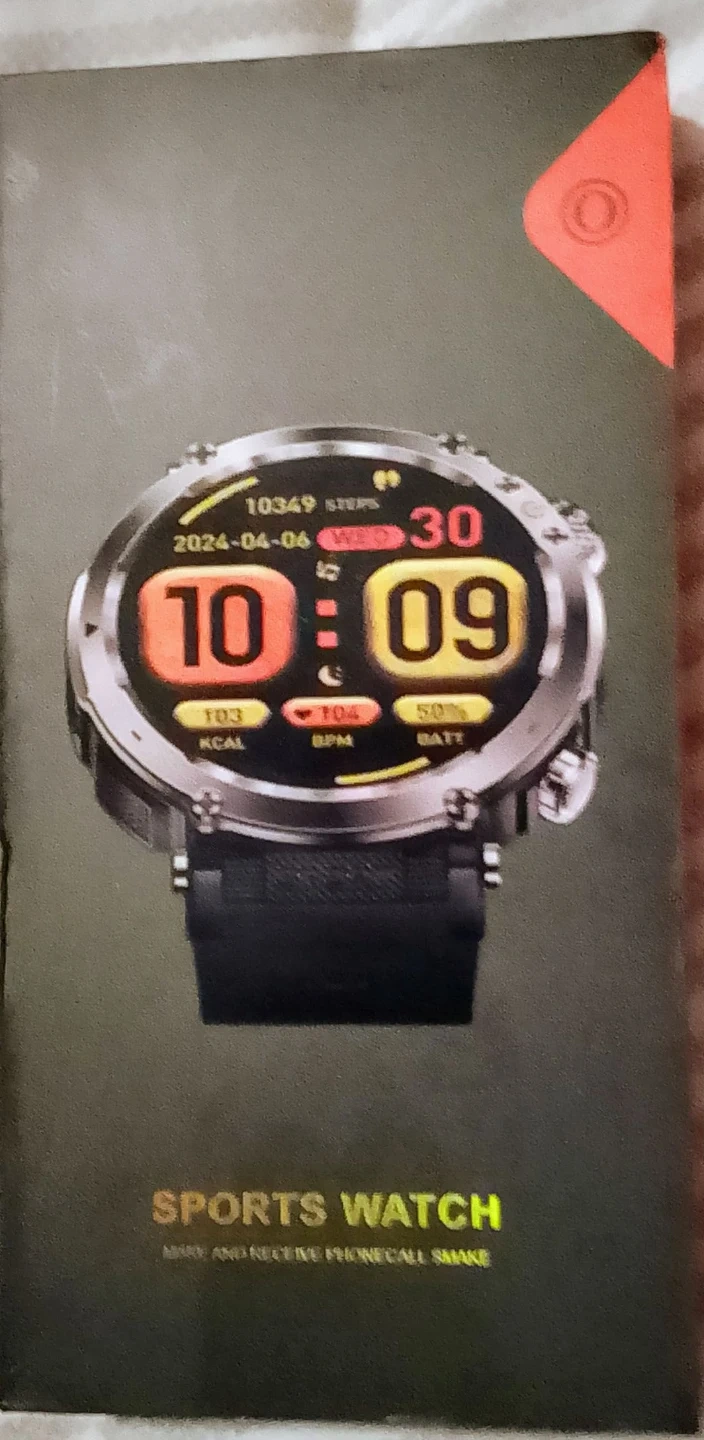 Selling a sports watch still in its original box! The box shows the watch displaying the time 10:09, date 2024 April 06, 10349 steps, 103 kcal, 104 bpm, and 50% battery