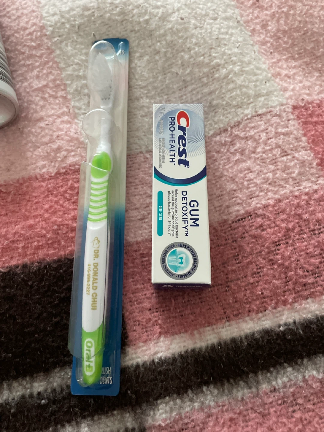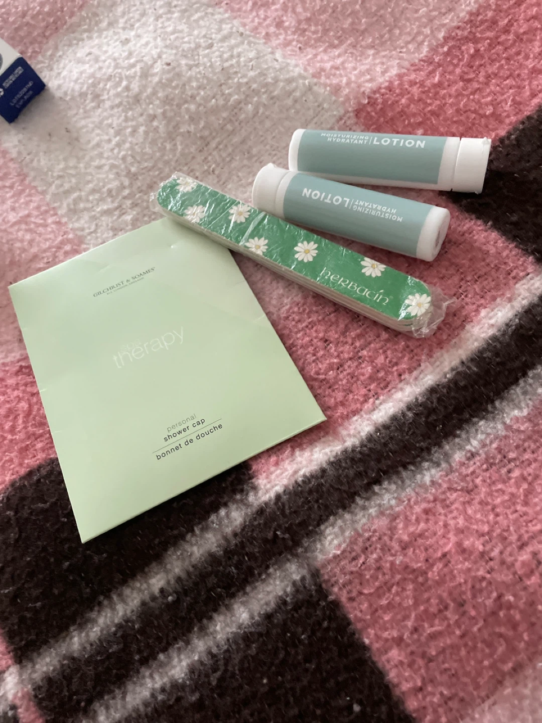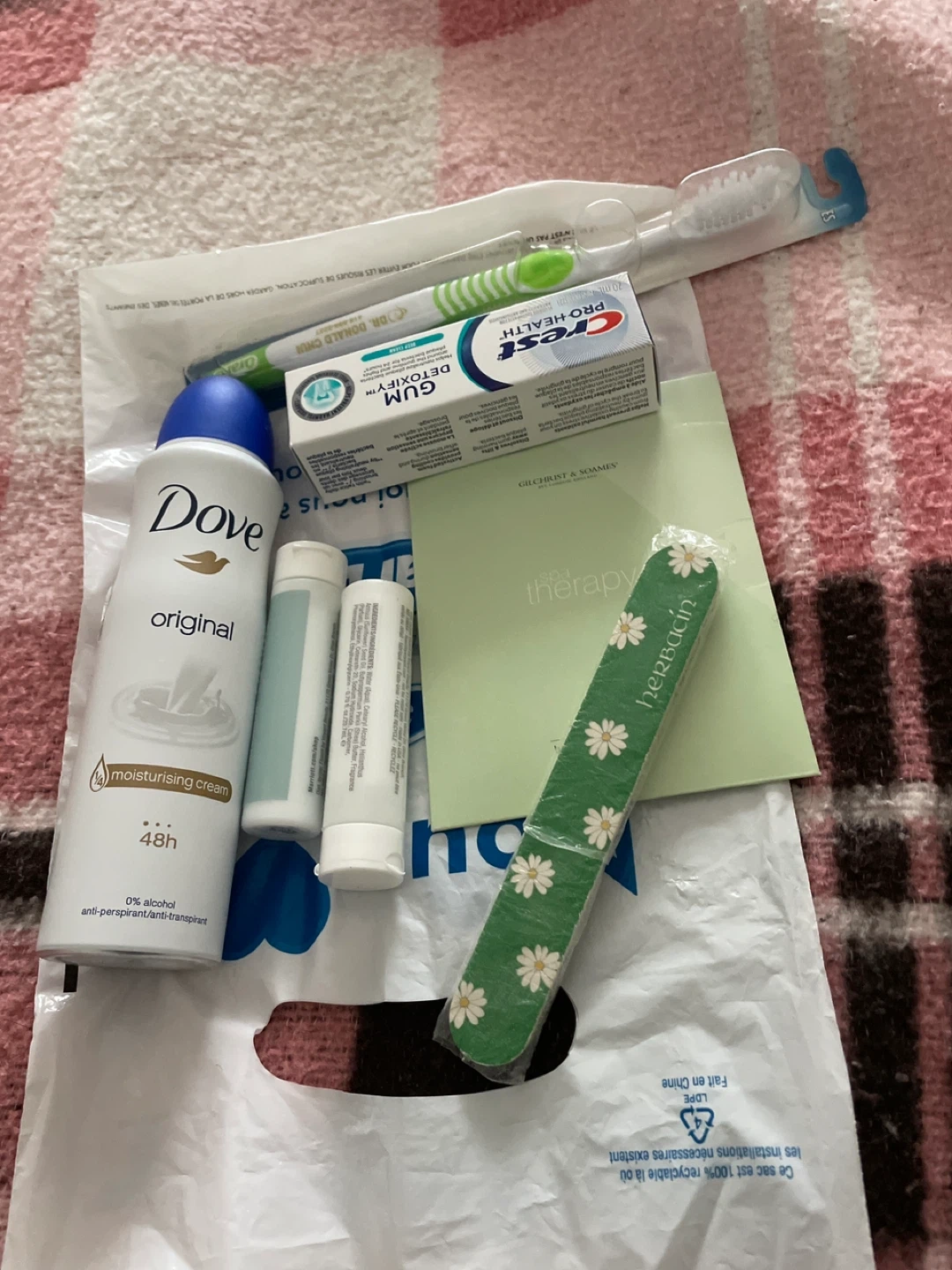 Selling a bundle of personal care items! Included is a Dove Original Moisturizing Cream anti-perspirant/anti-transpirant, Crest Gum Detoxify toothpaste, Oral-B toothbrush, two tubes of moisturizing lotion, a nail file, and a Gilchrist & Soames shower cap