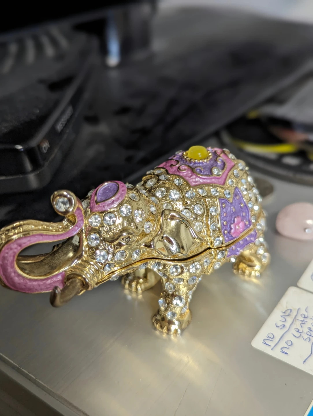 Selling a cute elephant trinket box! It's gold-coloured and covered in jewels with purple accents. Perfect for storing small items or as a decorative piece