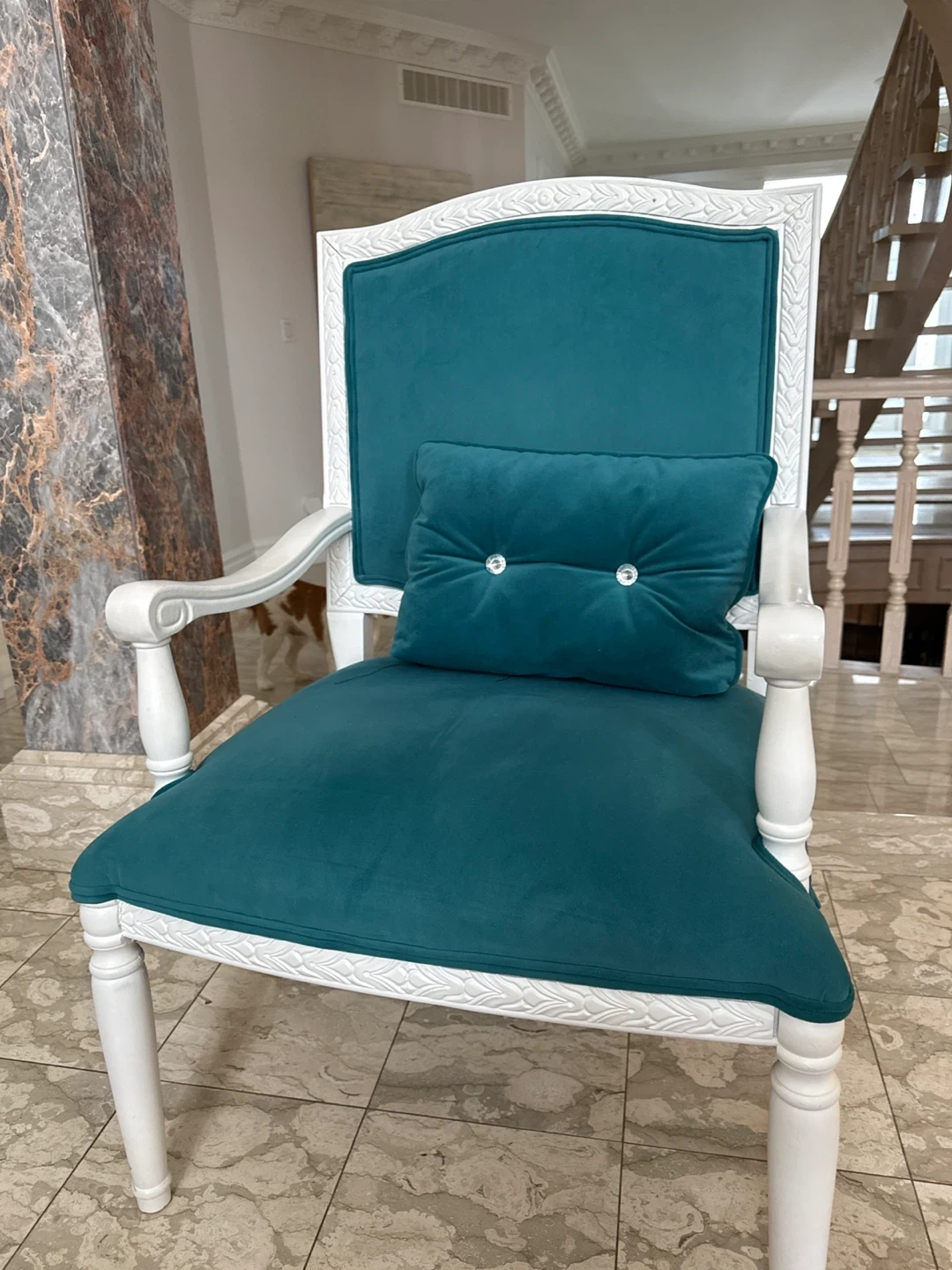 Selling a beautiful teal velvet accent chair! It features a white frame and a plush velvet seat and back. Perfect for adding a pop of colour and elegance to any room in your home. The chair is in excellent condition and ready to be enjoyed