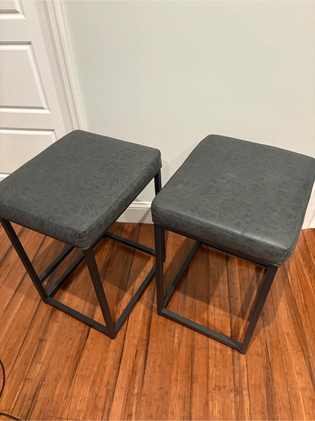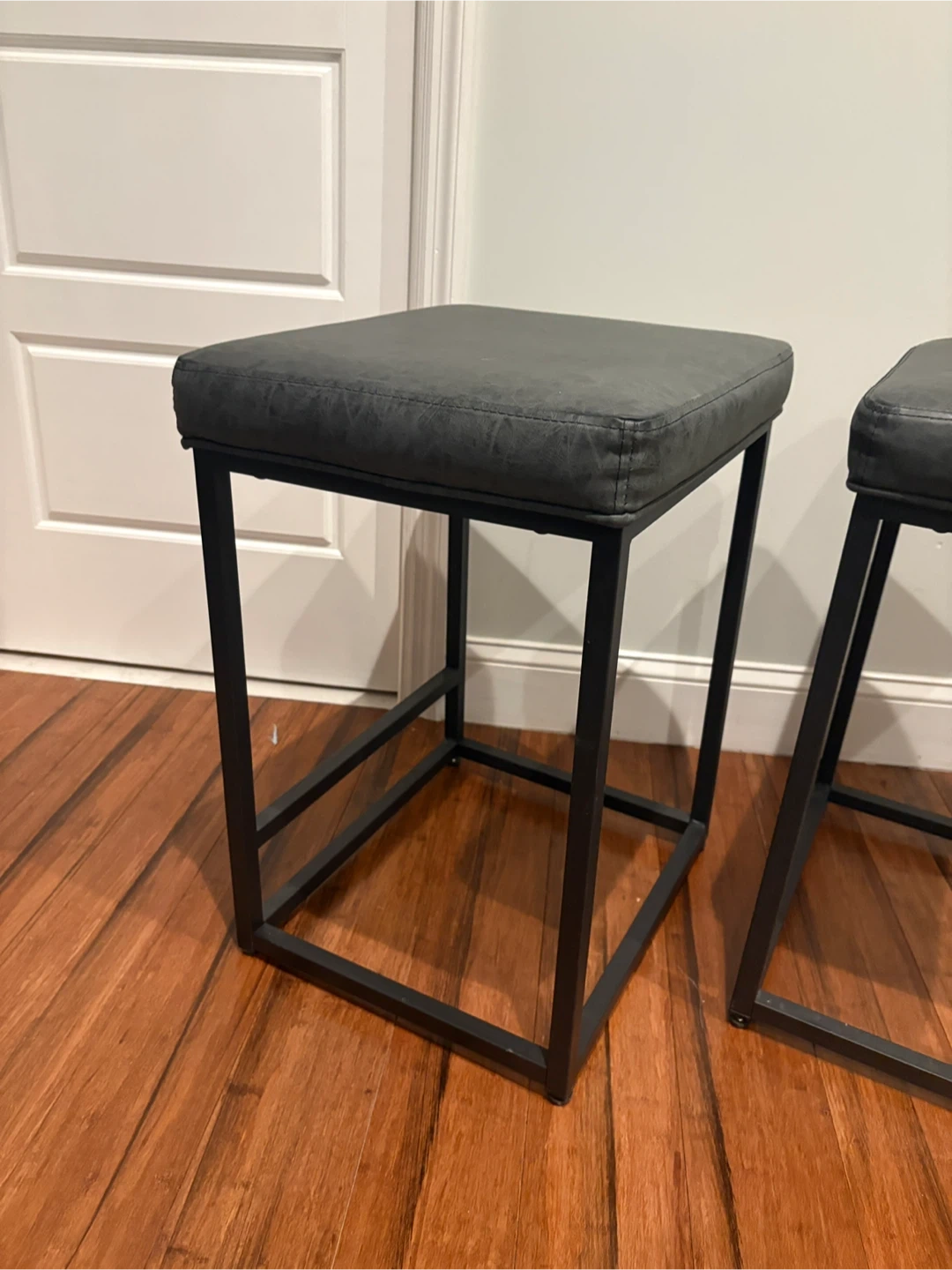 They're in great condition and have a sleek, modern look with a gray upholstered seat and black metal frame. Perfect for adding extra seating to your kitchen or bar area!