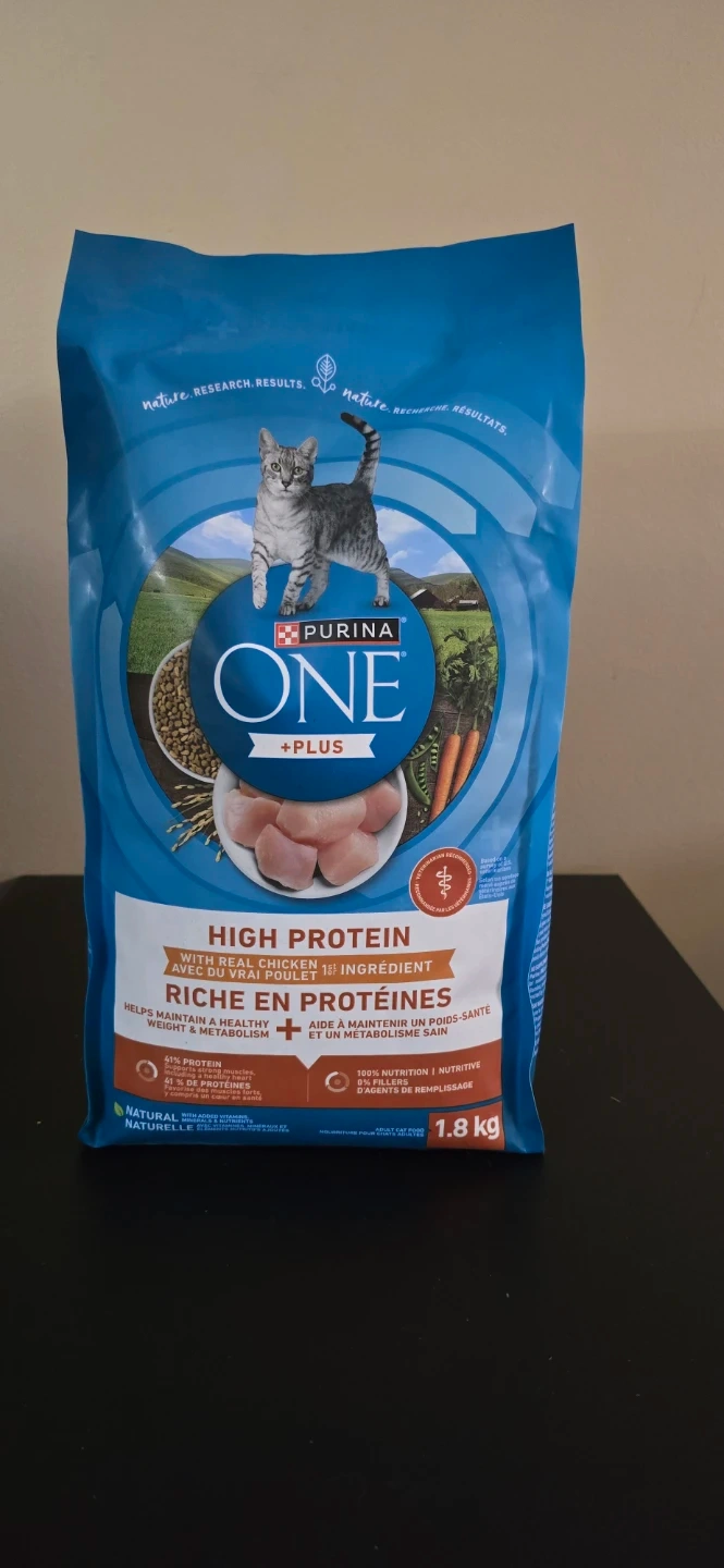 Selling a bag of Purina ONE +Plus High Protein cat food. It's a complete and balanced nutrition for adult cats. Helps maintain a healthy weight and is easily digestible. Contains real chicken and other wholesome ingredients. Net weight is 1.8 kg
