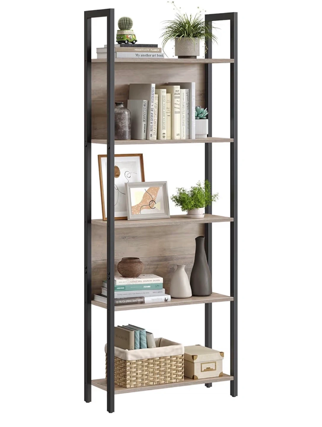 Selling a stylish industrial-style bookcase with 5 shelves! It's perfect for displaying books, plants, and other decorative items. The bookcase features a sturdy metal frame and wooden shelves, blending rustic and modern elements.