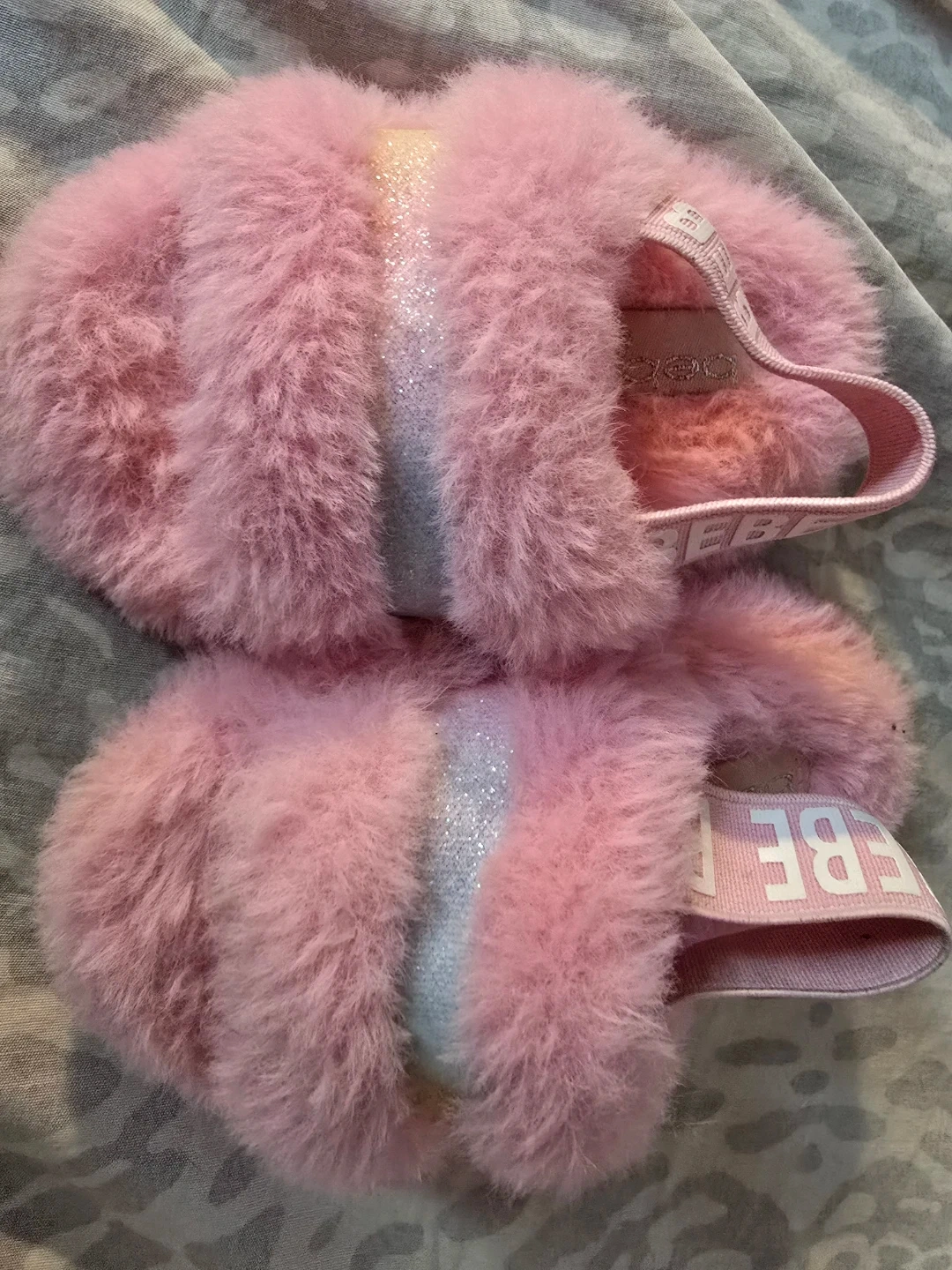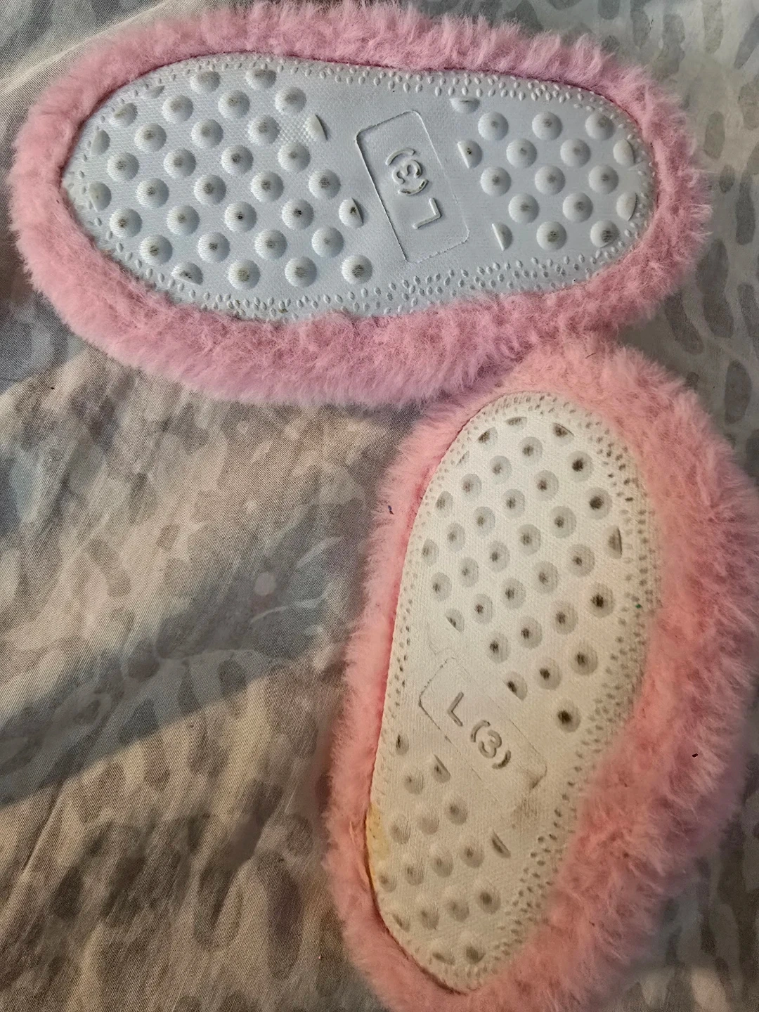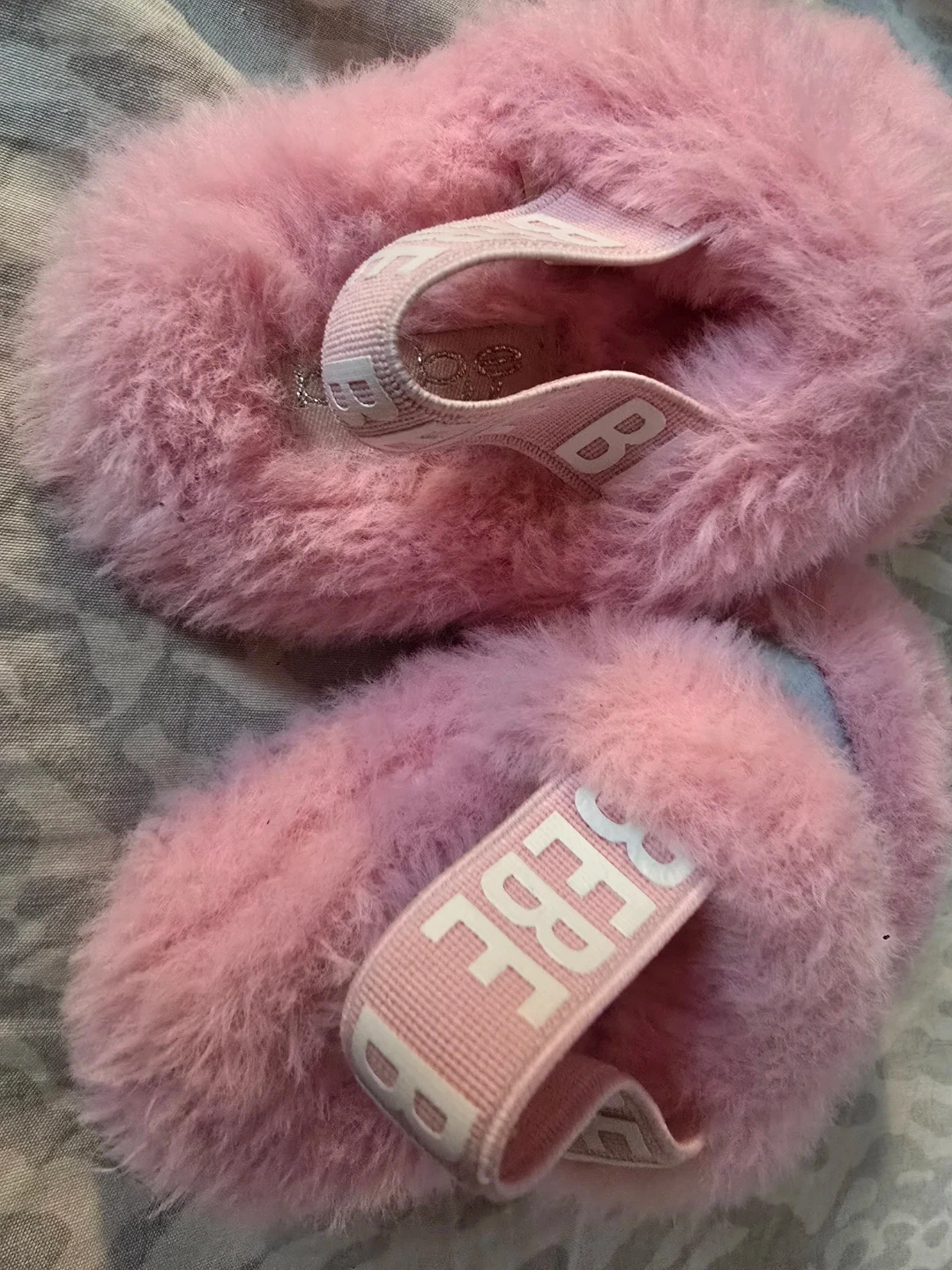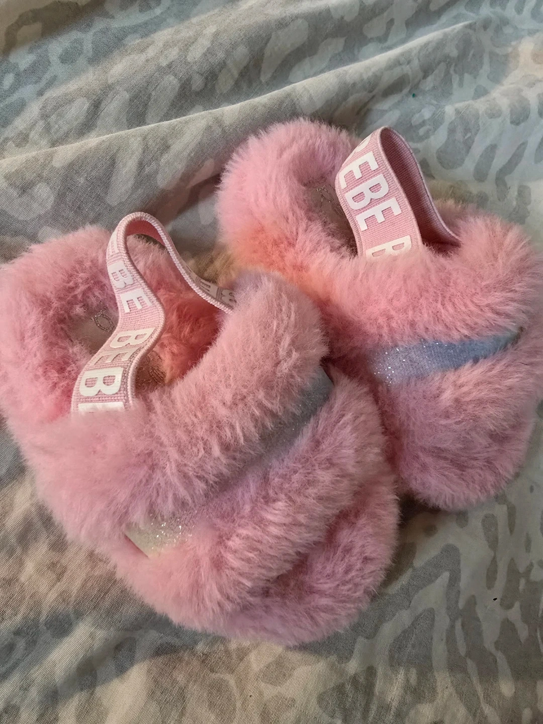 These are a pair of Bebe pink fuzzy slippers in a size 3. They're super soft and comfy!