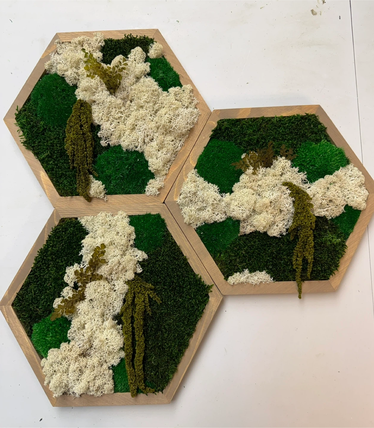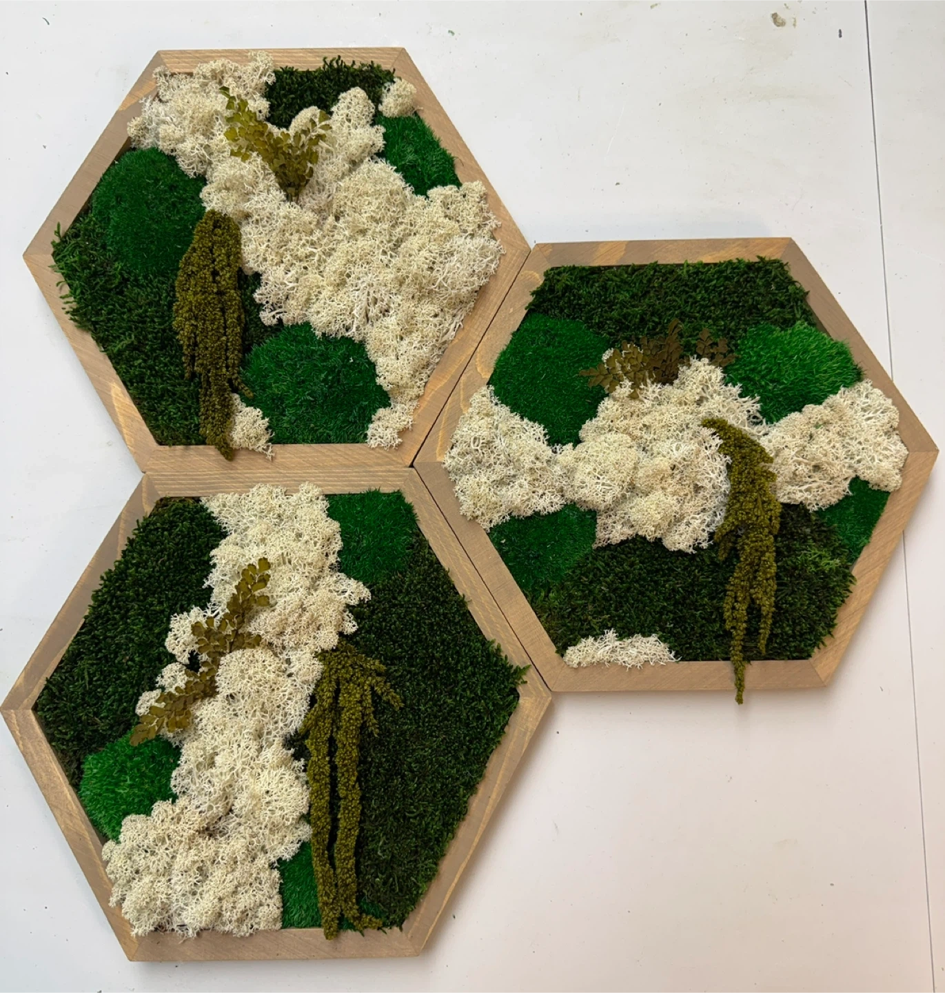 Selling a set of two hexagon moss wall art pieces. They add a natural and calming touch to any room. These are great for adding some texture and visual interest to your walls! Perfect for creating a unique and eye-catching display. 10”x 11 1/2”