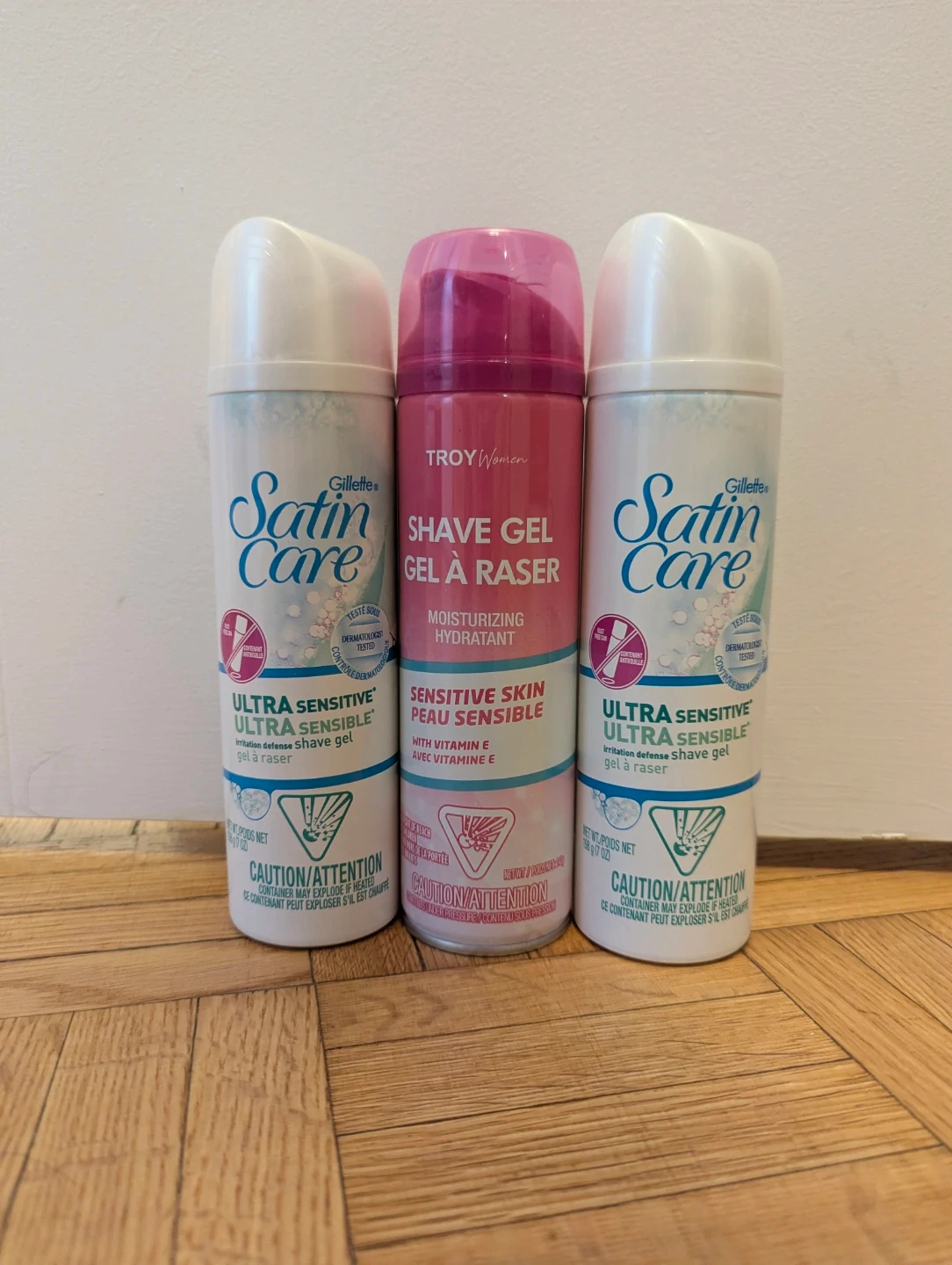 Selling a trio of shave gels! You'll get two Gillette Satin Care Ultra Sensitive shave gels, perfect for irritation defense. Plus, a Troy Women shave gel for sensitive skin with vitamin E. All are full-sized cans never used
