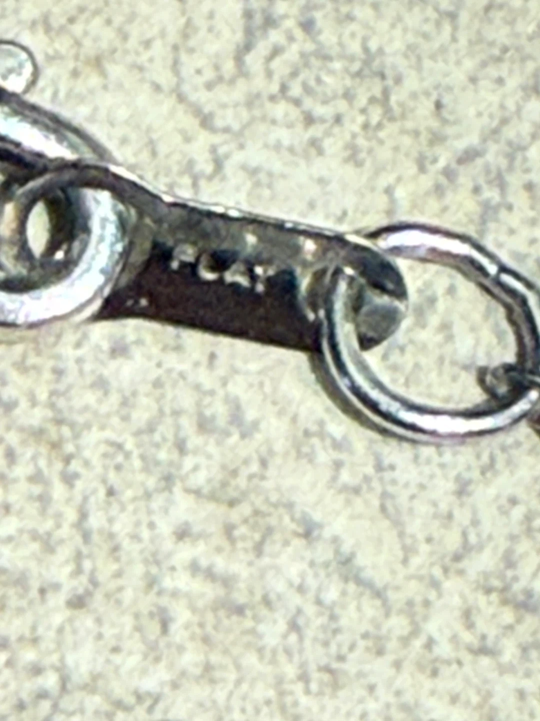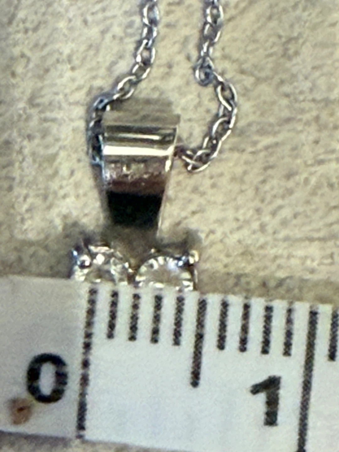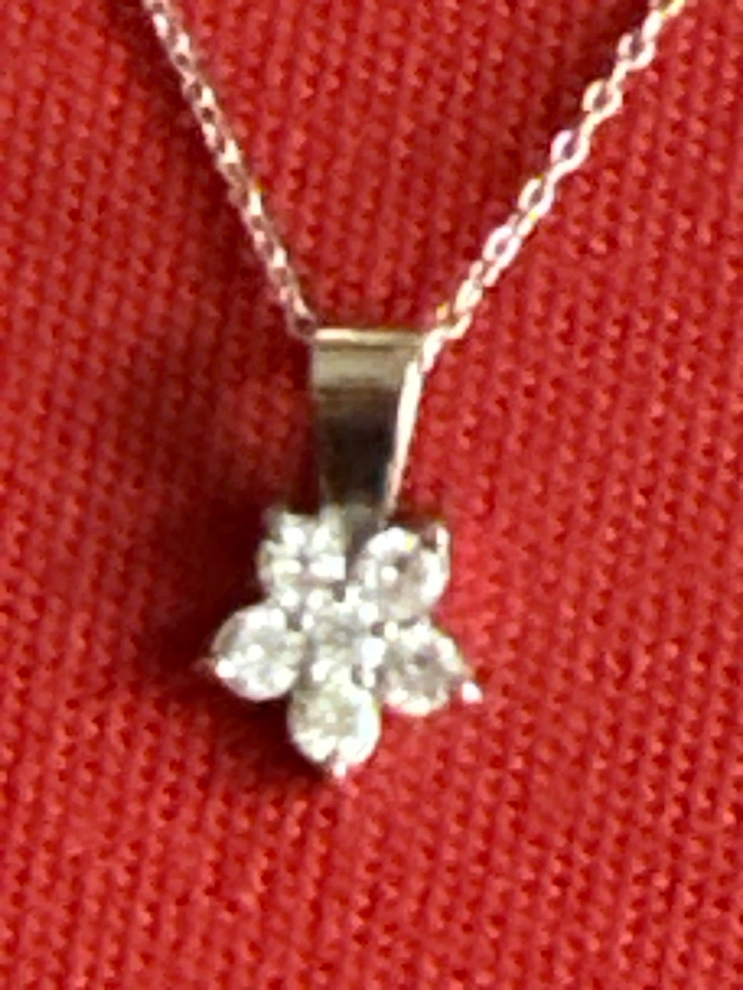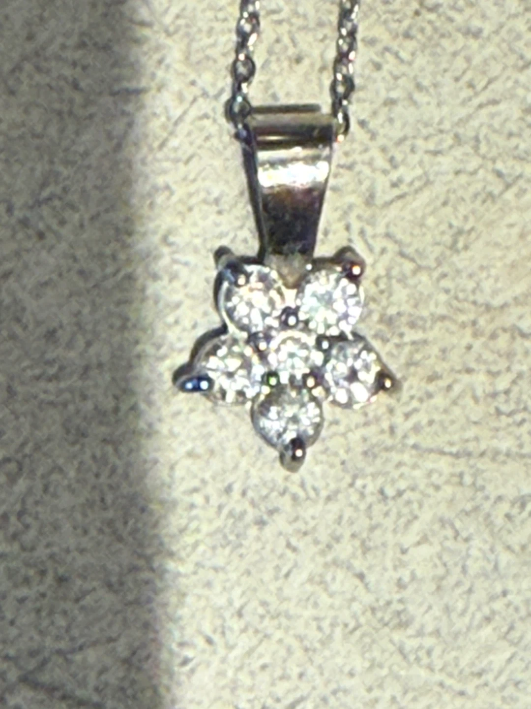 A delicate natural 0.60 karat diamond flower pendant with necklace. The necklace has a lobster clasp. The clasp is marked "PLAT". The pendant is approximately 1cm in size. Pendant has hallmarks 950 but it’s hard to take a picture of that.