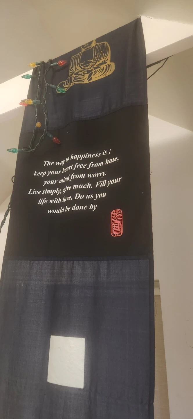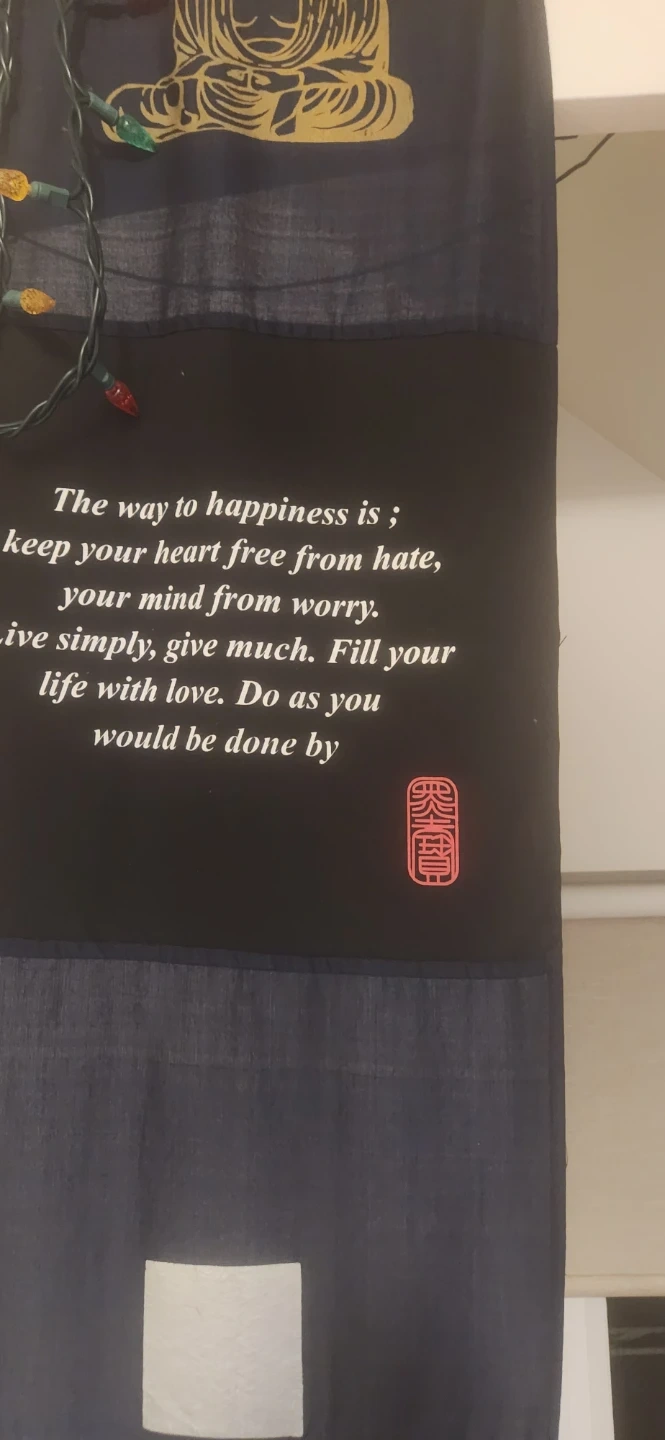 This wall hanging features a Buddha image and an inspirational quote about happiness and living simply. It's a unique piece to add a touch of serenity to your space. The colours are black, gold and white.