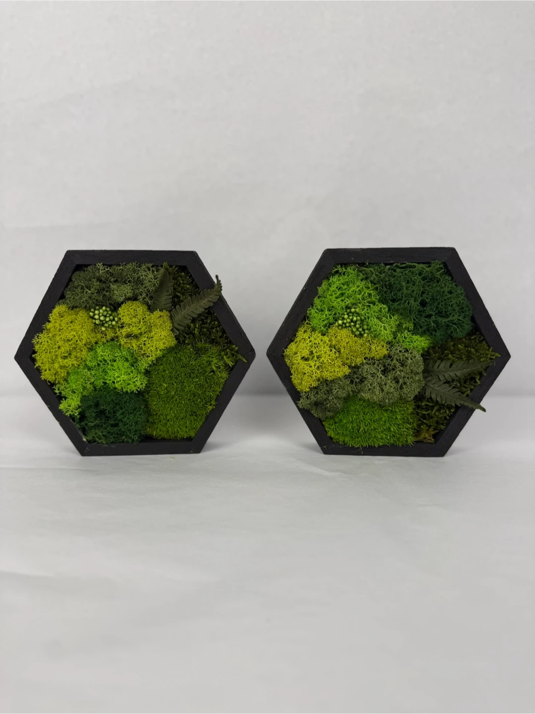 Add a touch of nature to your home with these unique hexagon moss wall art pieces! This set of two features a variety of lush green mosses arranged in a modern, geometric frame. Perfect for adding a pop of colour and texture to any room