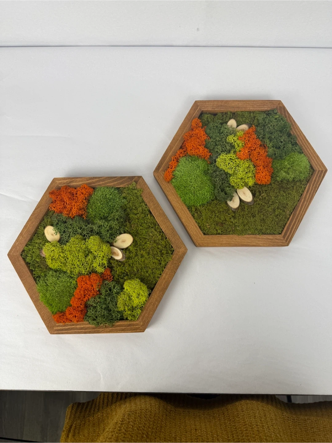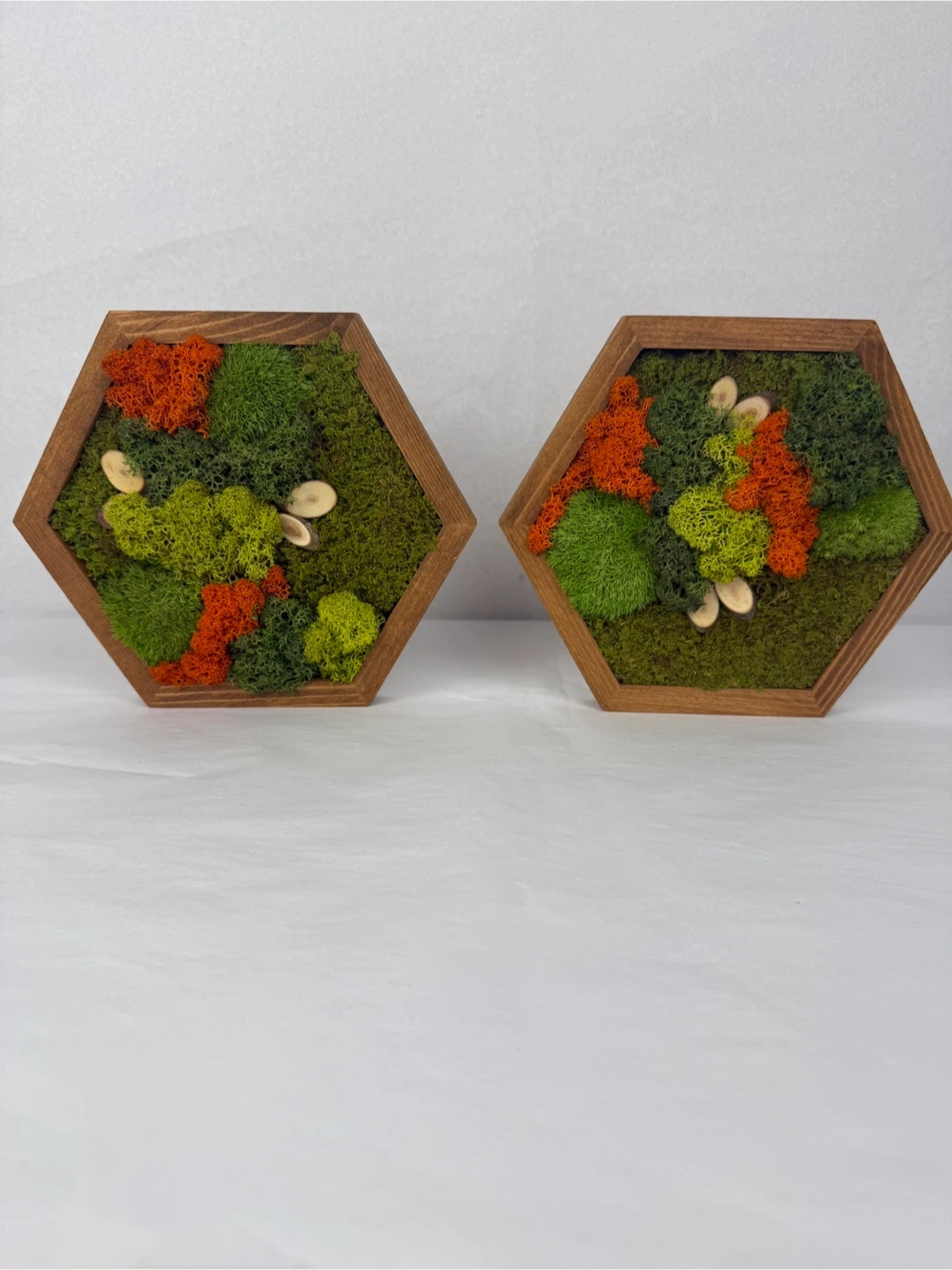 Selling a set of two hexagon-shaped moss wall art pieces. These are perfect for adding a touch of nature to your home decor. The frames are a warm wood tone and the moss features vibrant greens and oranges. They're in great condition and ready to brighten up any space set of 2
