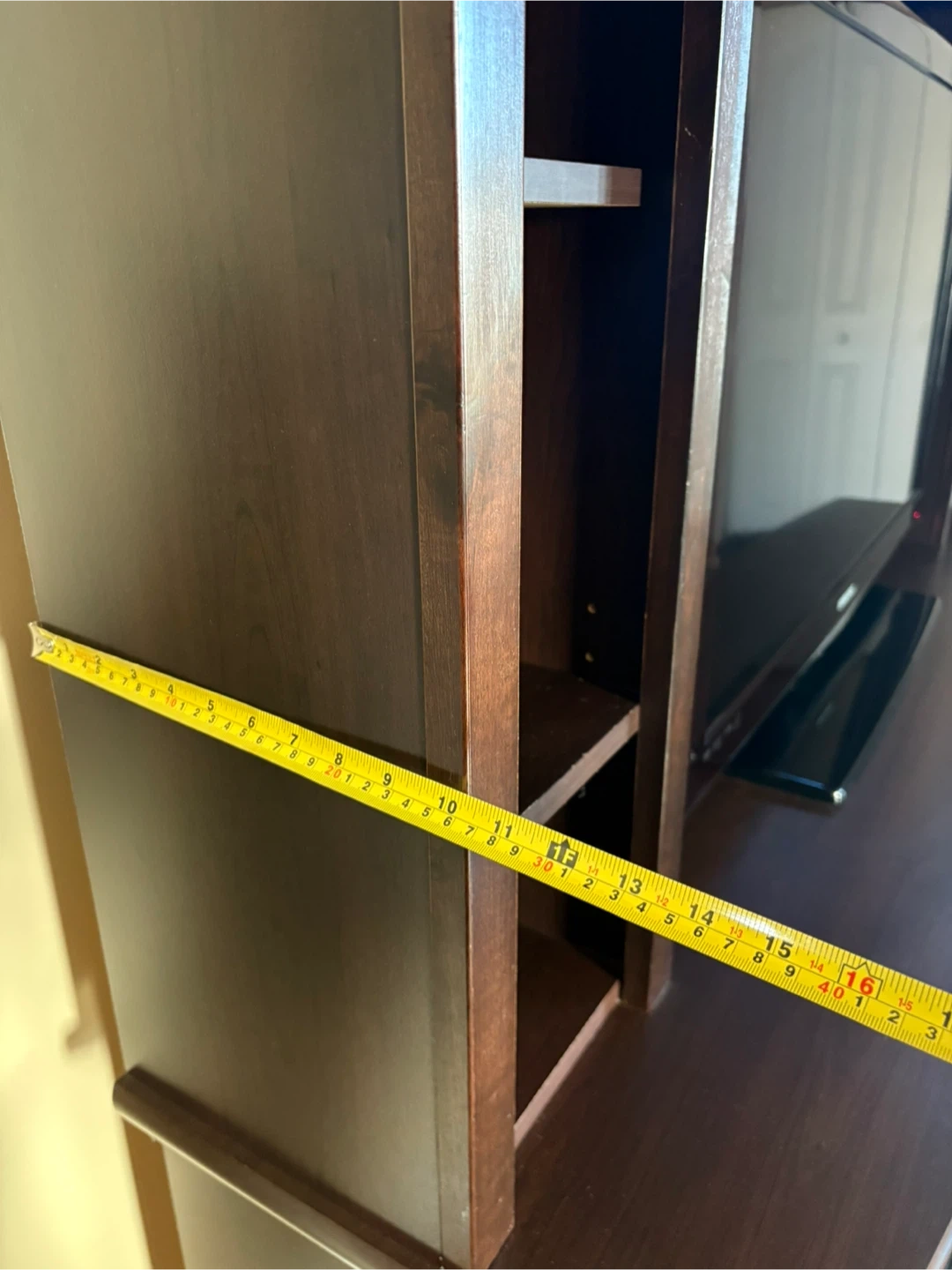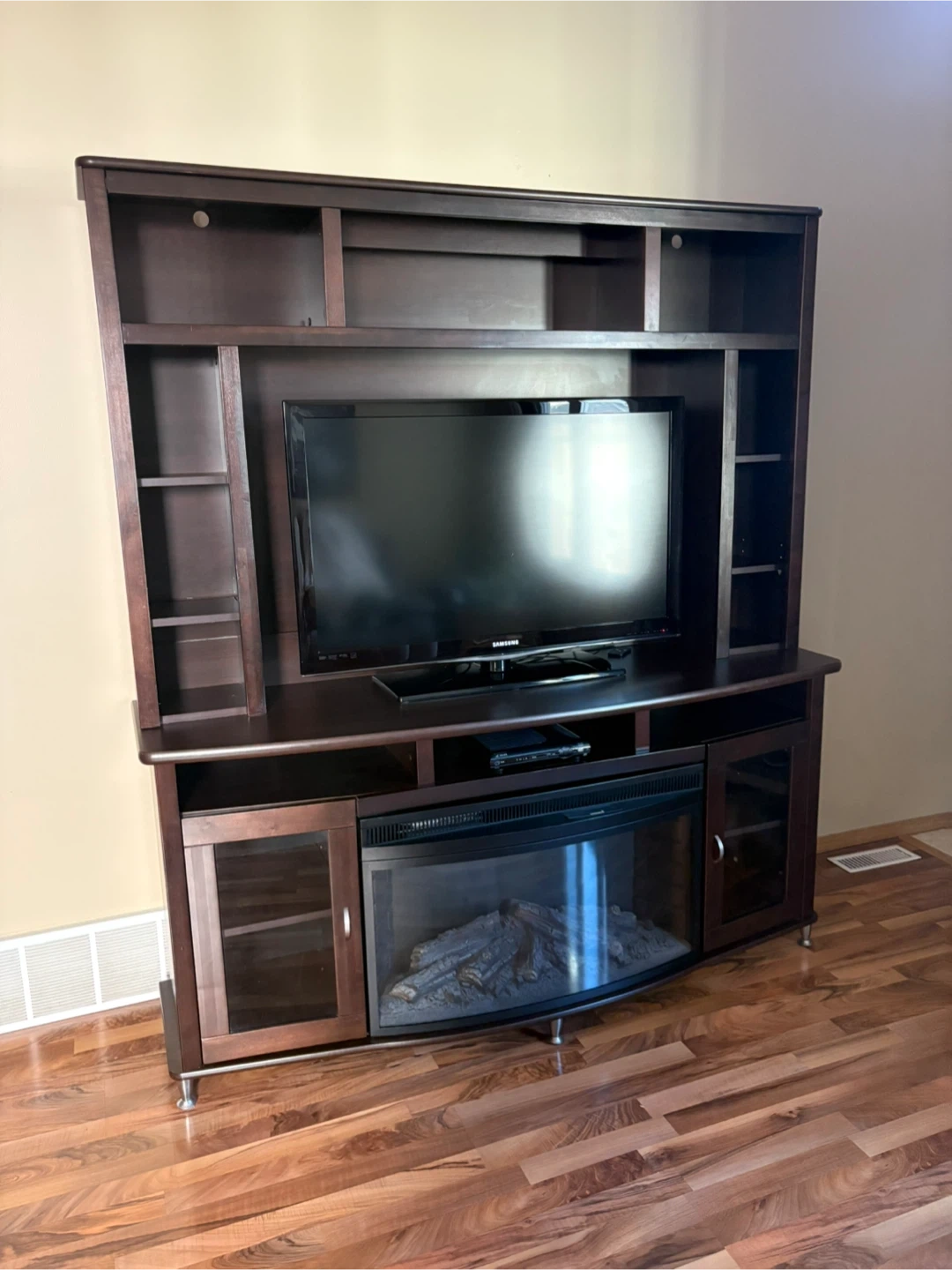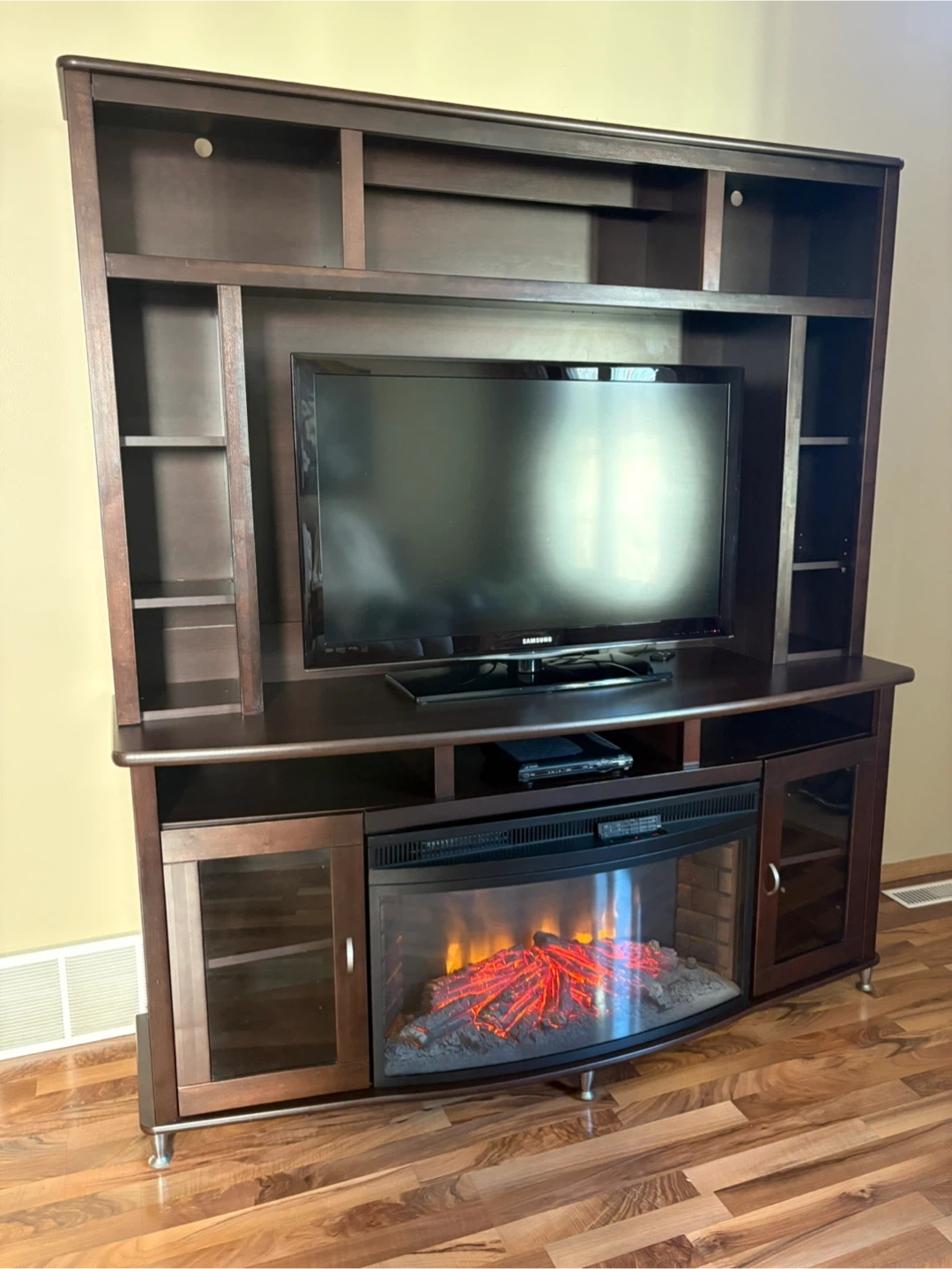 Selling a dark brown entertainment unit with a built-in fireplace. It features shelving and glass-door cabinets, providing ample storage space. The unit measures approximately 67 inches in length and 21 inches in depth. Great for creating a cozy atmosphere in your living room. Comes apart for moving. Cash only.