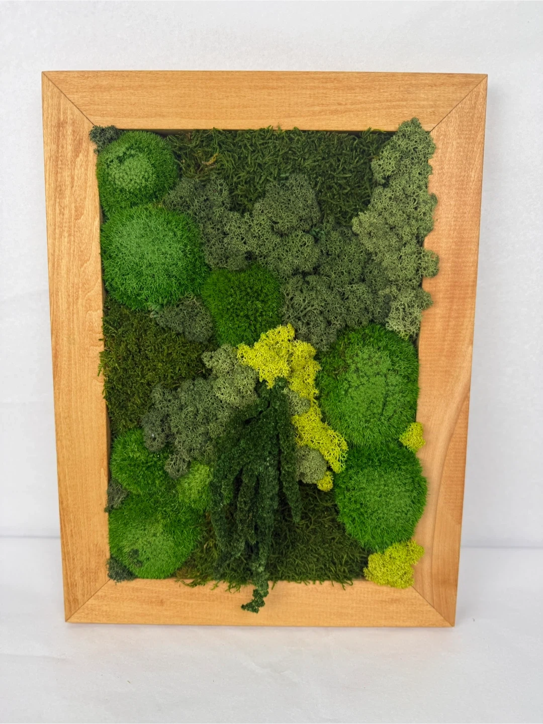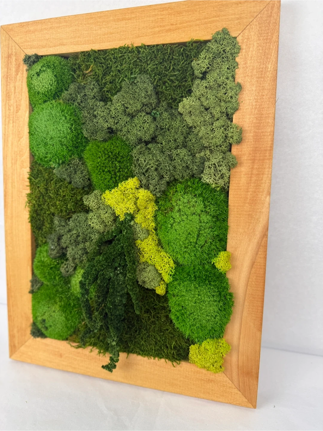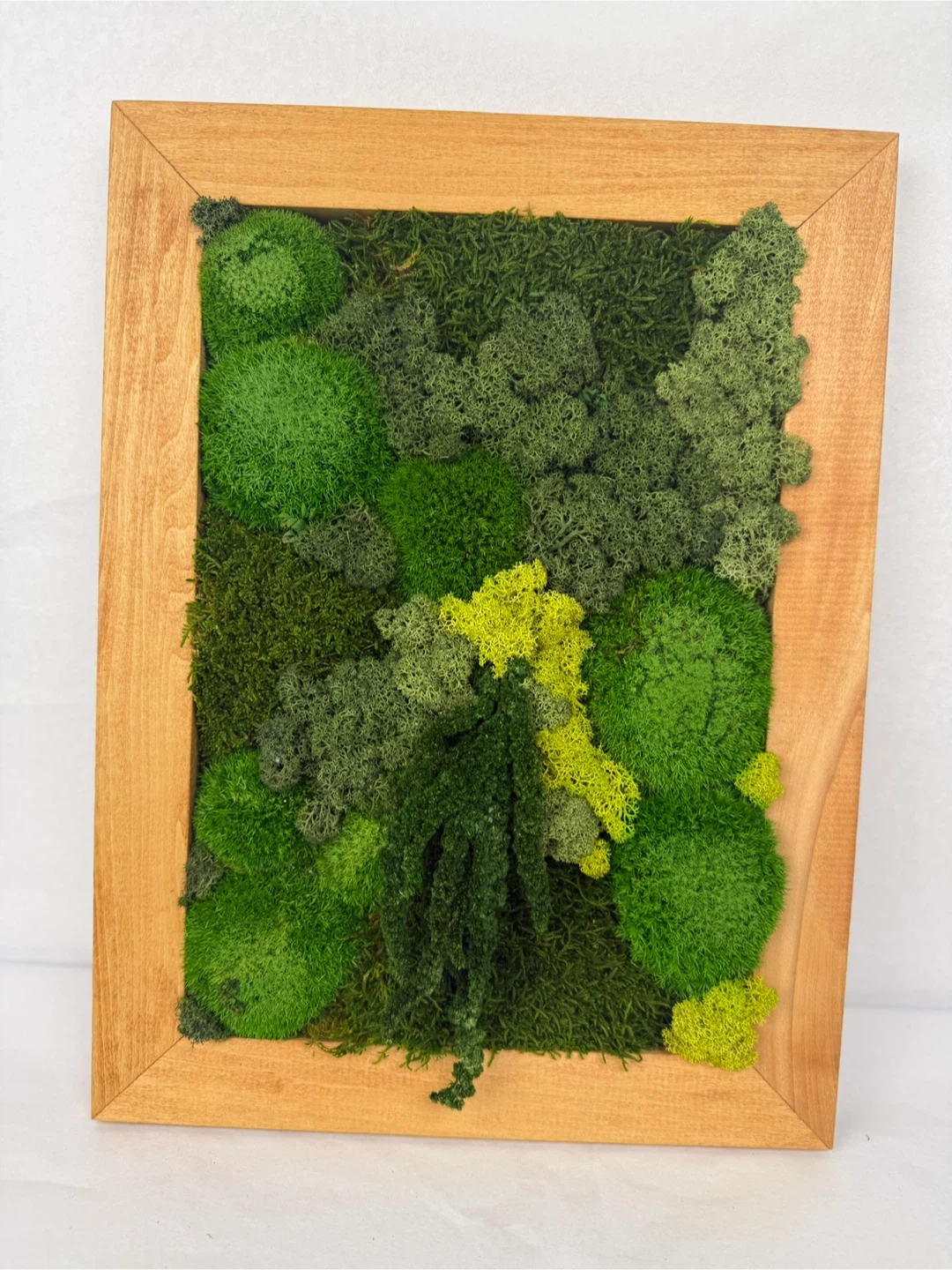 Beautiful framed moss art piece. It's a unique and eye-catching piece of décor that brings a touch of nature indoors. The different shades of green moss create a vibrant and textured display, perfect for adding a natural element to any room 12” x 16”