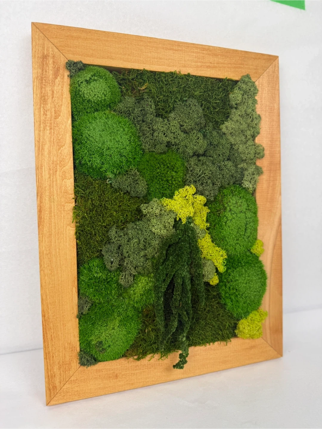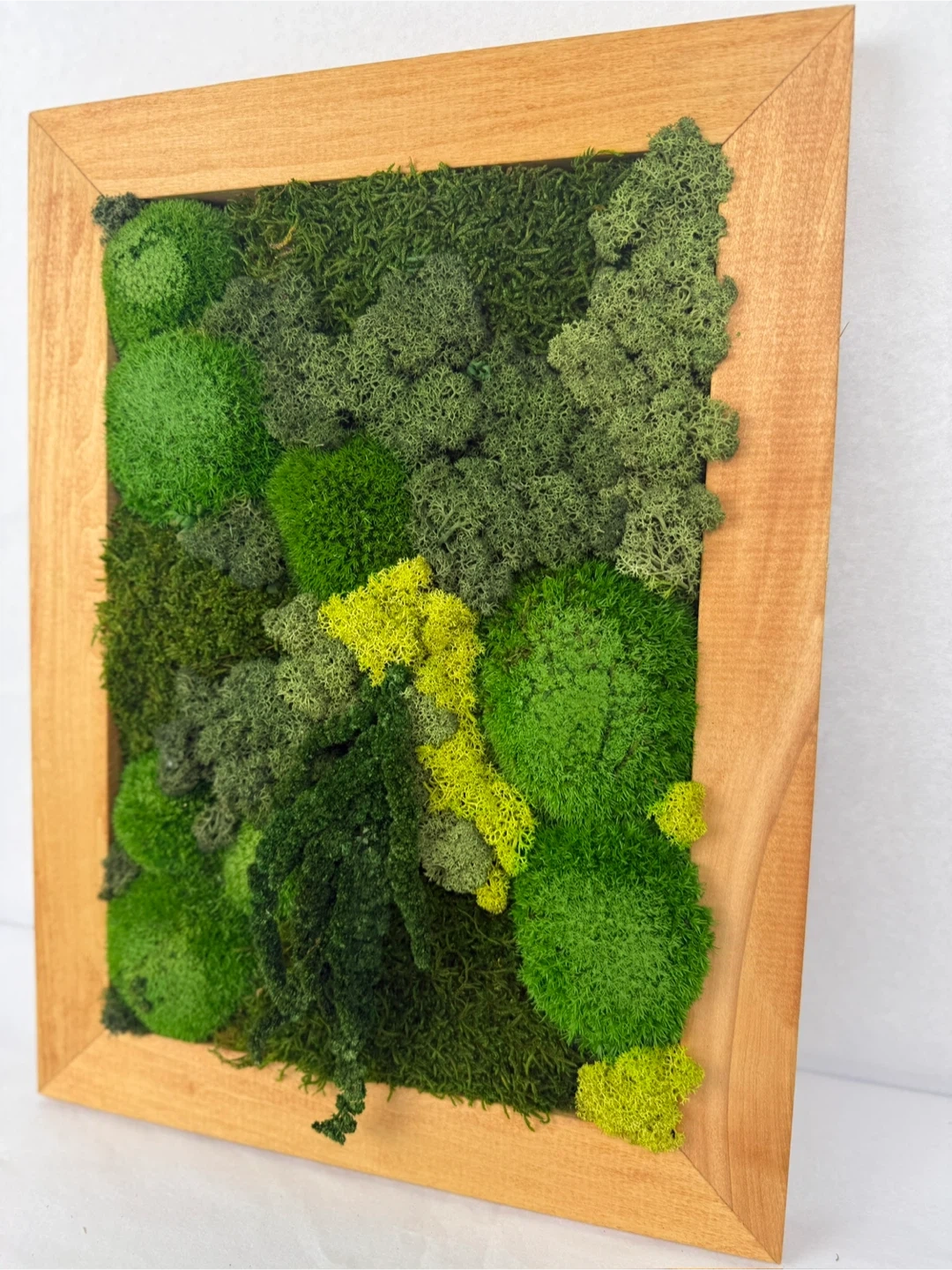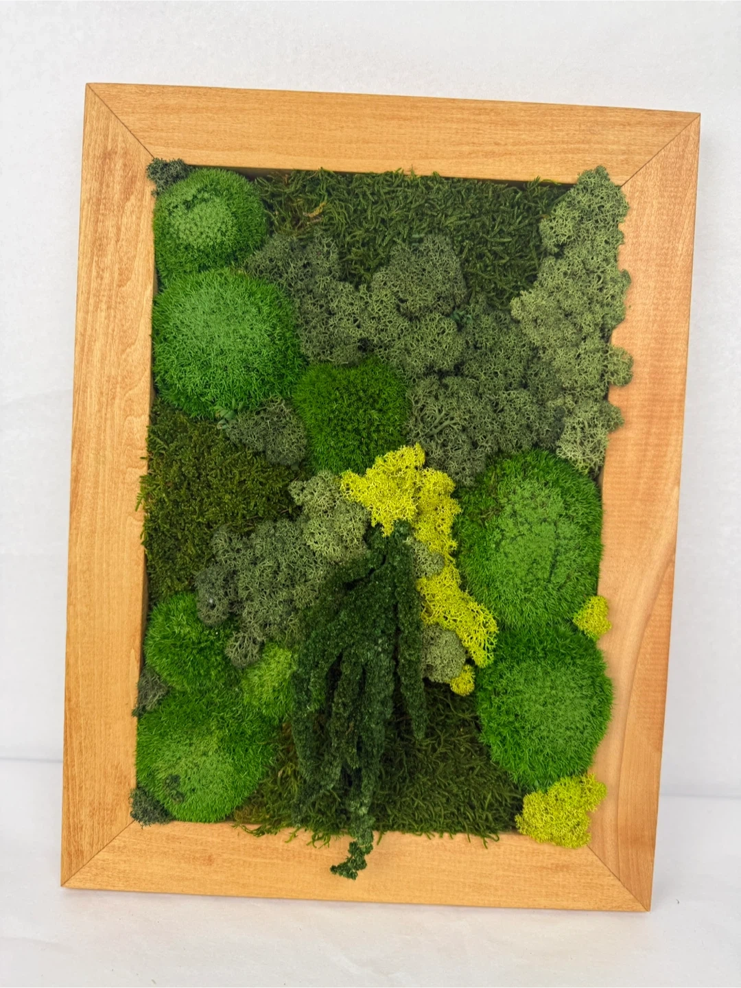 Beautiful framed moss art piece. It's a unique and eye-catching piece of décor that brings a touch of nature indoors. The different shades of green moss create a vibrant and textured display, perfect for adding a natural element to any room 12” x 16”