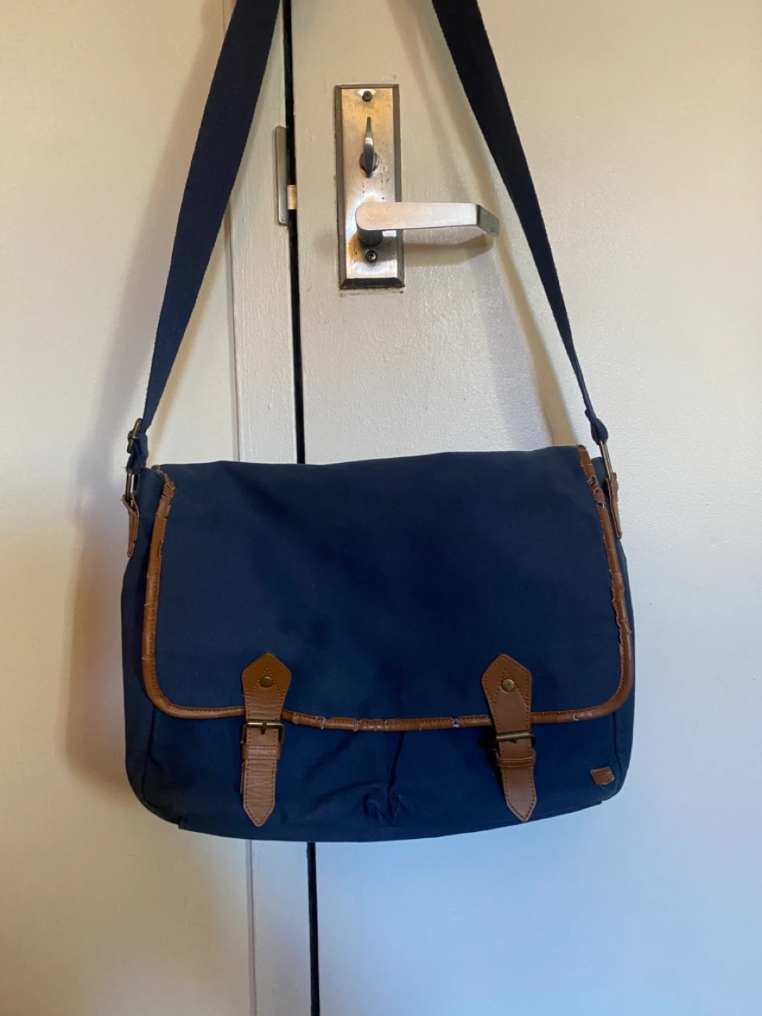 Blue messenger bag with brown leather-like accents and buckle straps. It has a long shoulder strap for easy carrying. Perfect for everyday use!