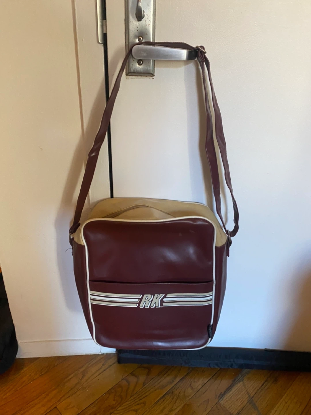 Selling a stylish RK shoulder bag! It features a burgundy and beige color scheme. Perfect for carrying your essentials in style