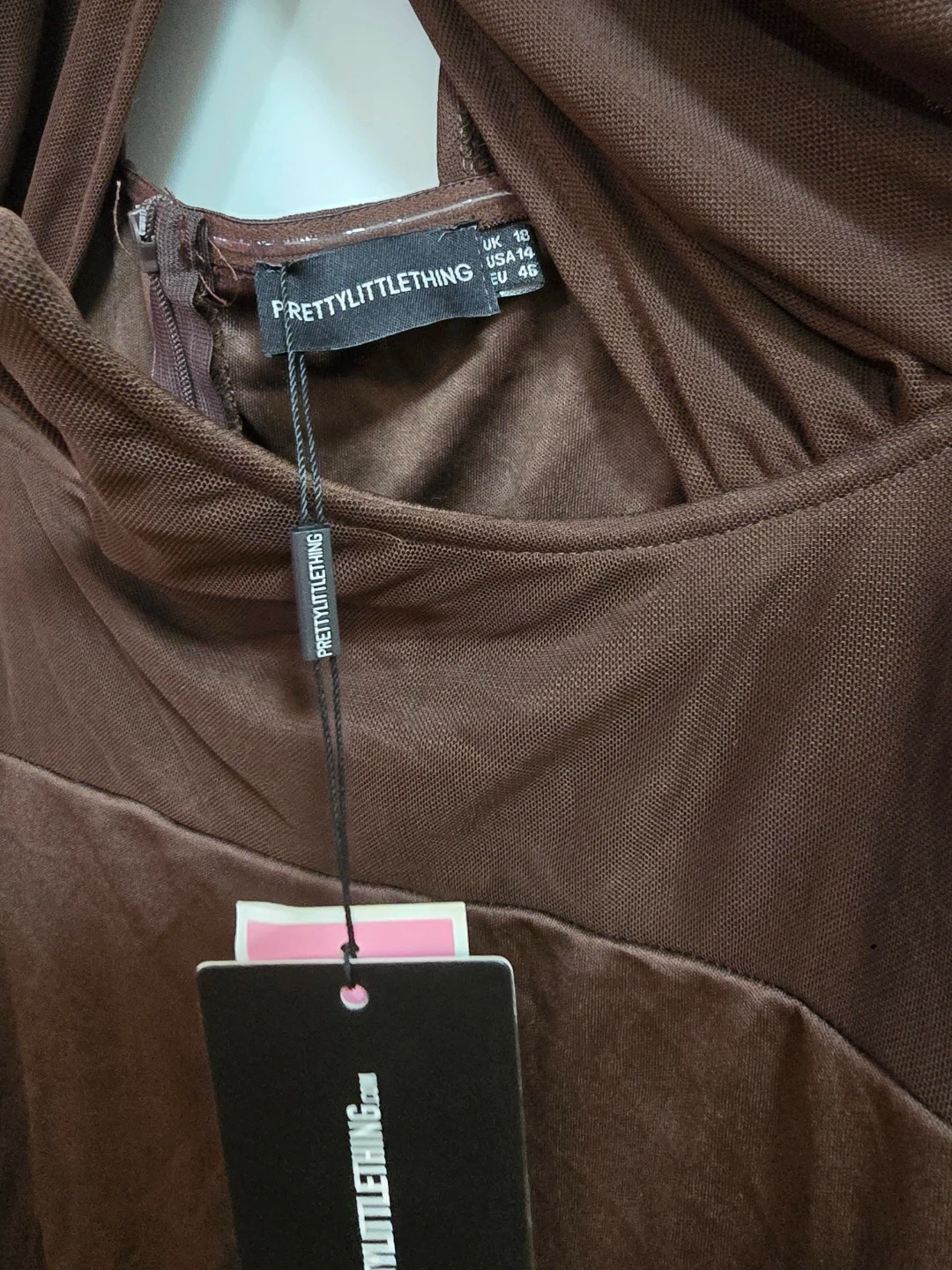 This is a PrettyLittleThing brown mini dress in a size 14. It features a unique criss-cross back design and is perfect for a night out or special occasion. The dress is in excellent condition!