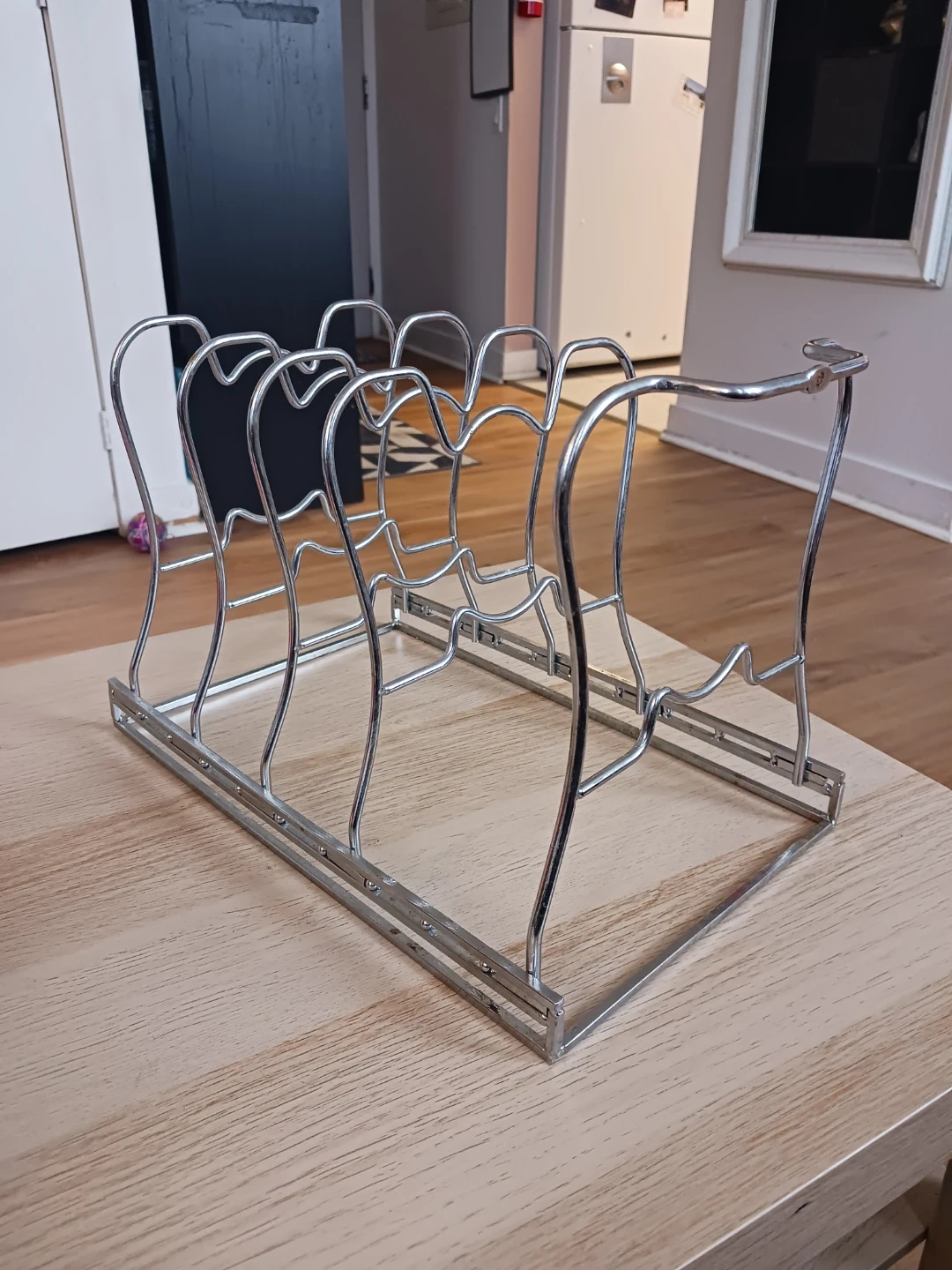 Here's a handy silver-coloured pan organizer rack! It's in great shape and ready to help you declutter your kitchen cabinets. Perfect for keeping your pots, pans, and lids neatly organized and easily accessible