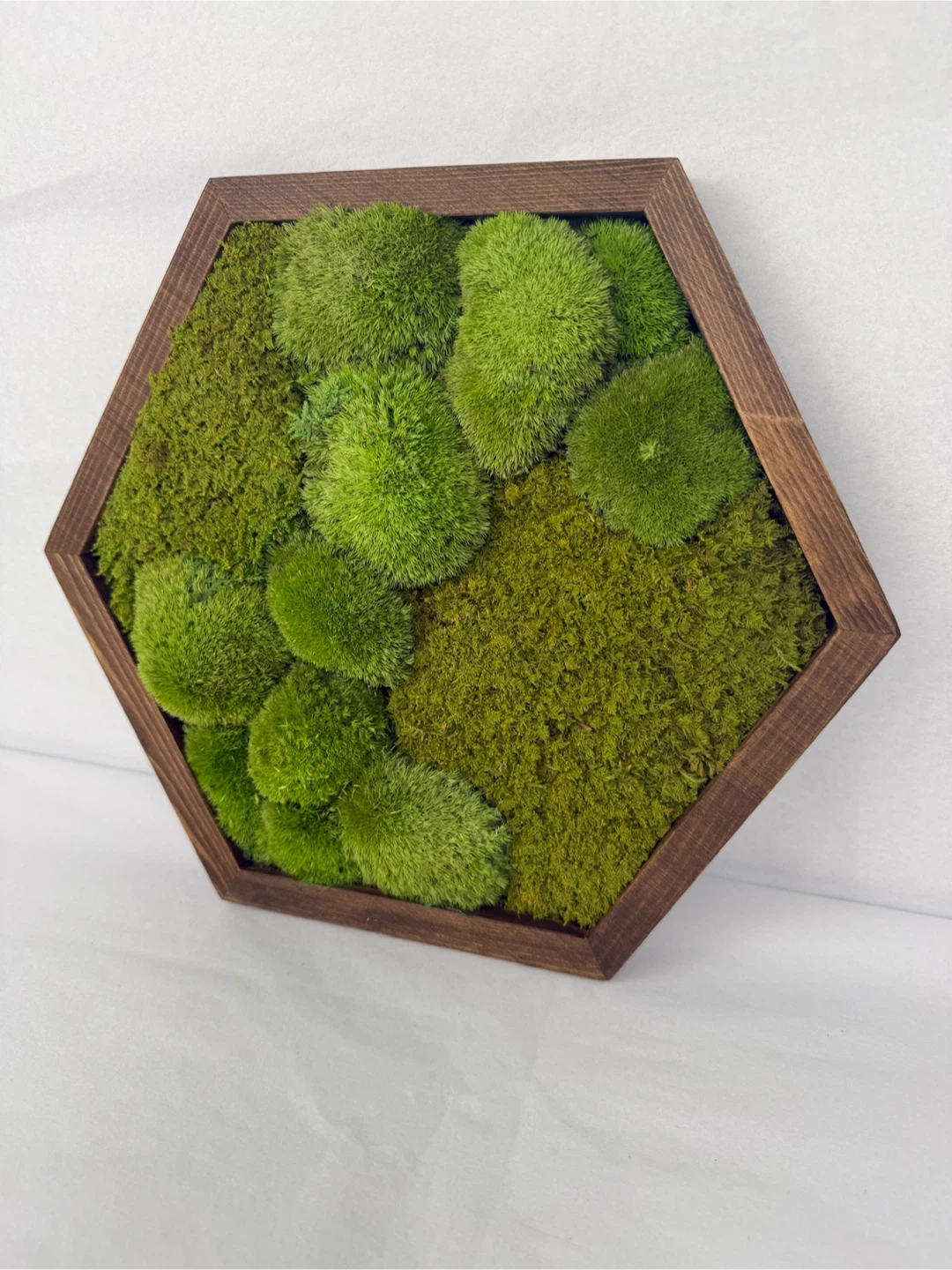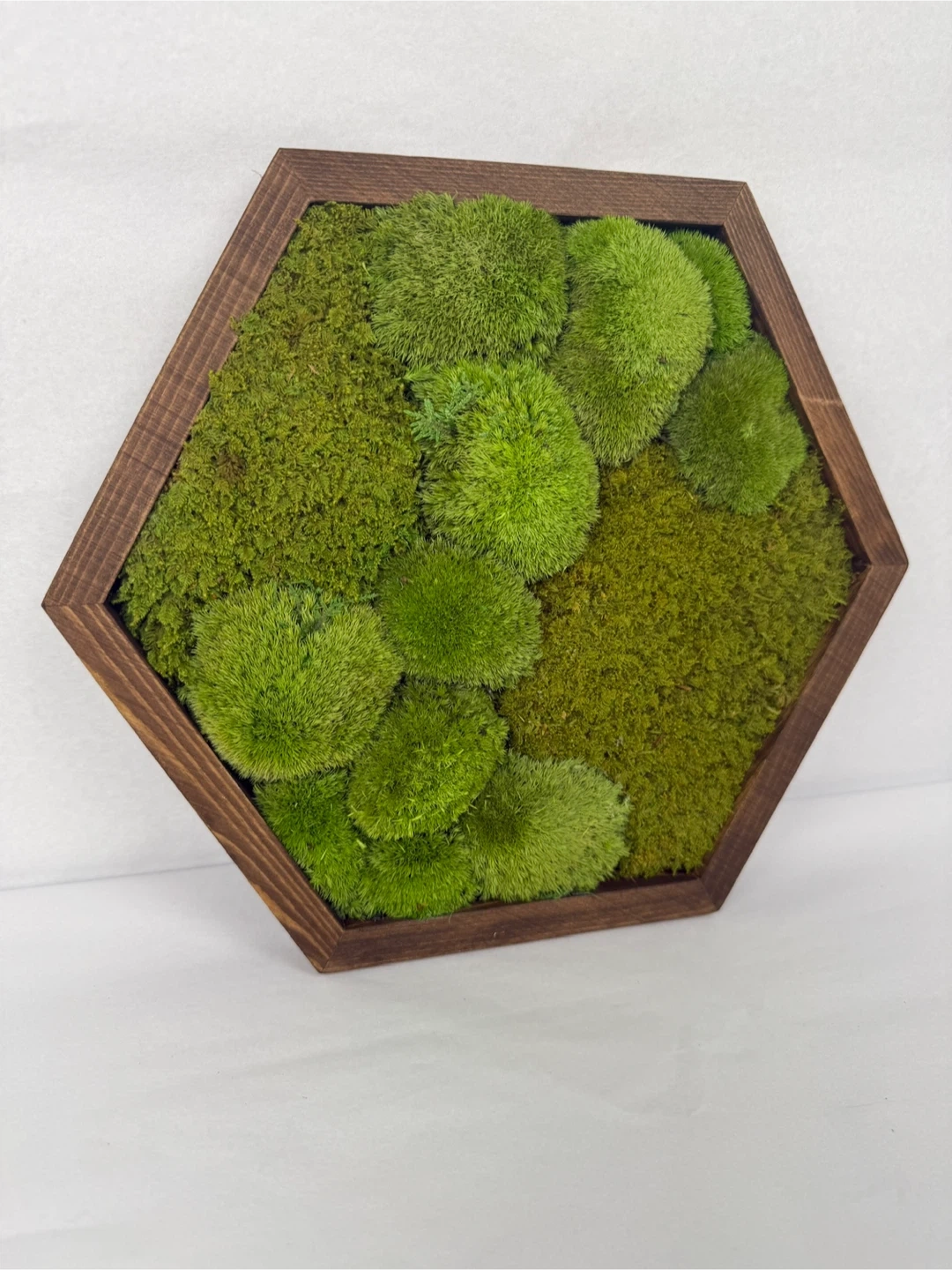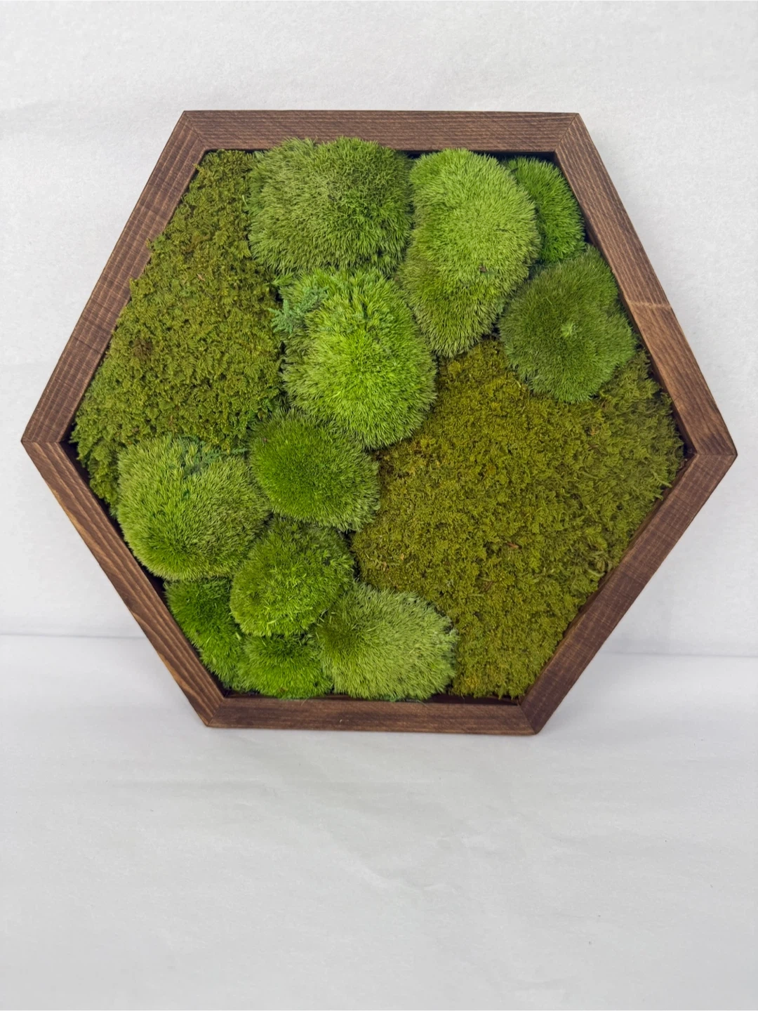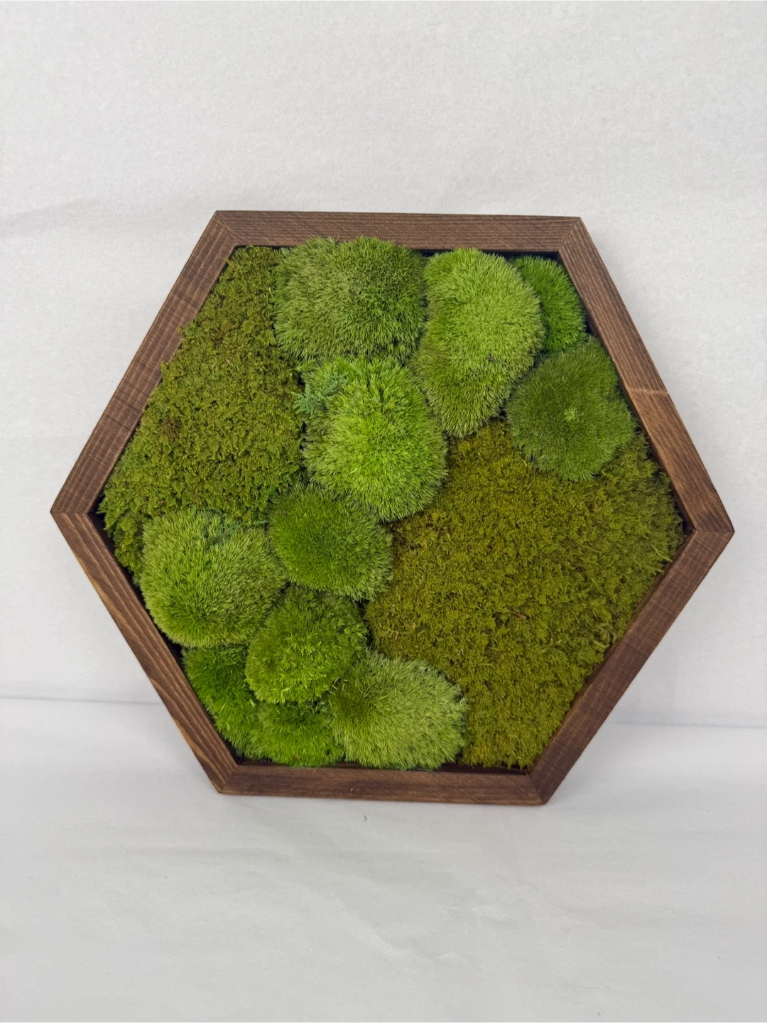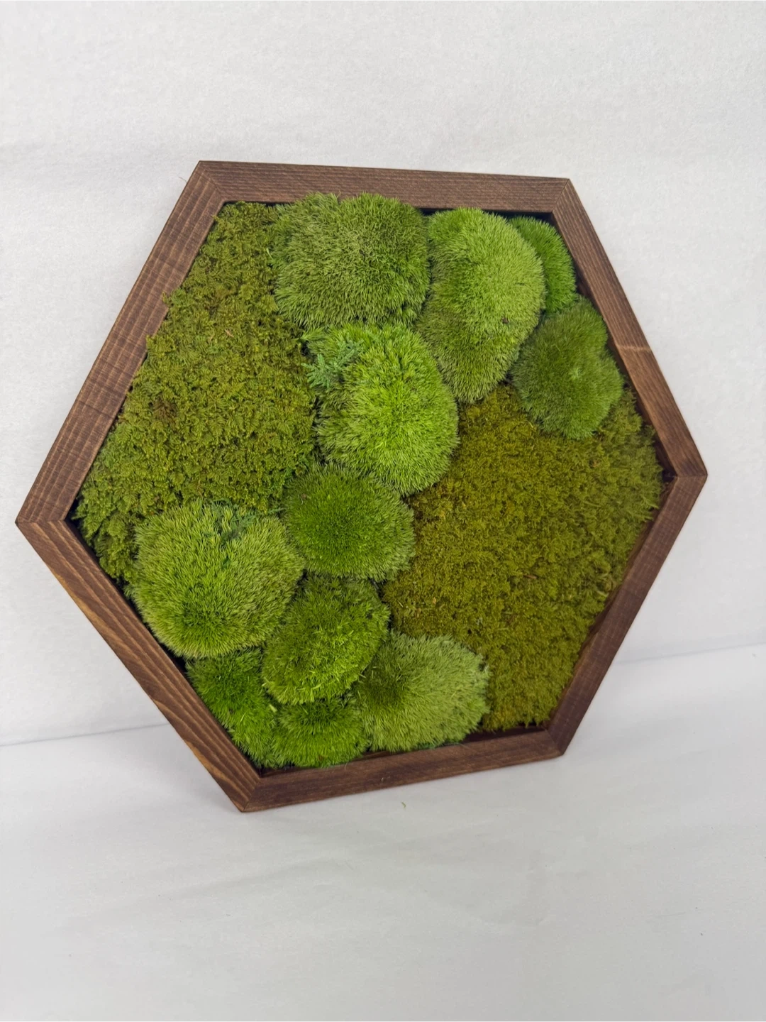 Selling a lovely piece of moss wall art! It features a variety of textures and shades of green moss, all contained within a stylish wooden frame. This unique piece would add a touch of nature to any room, bringing a calming and organic feel to your space 10” x 11 1/2”