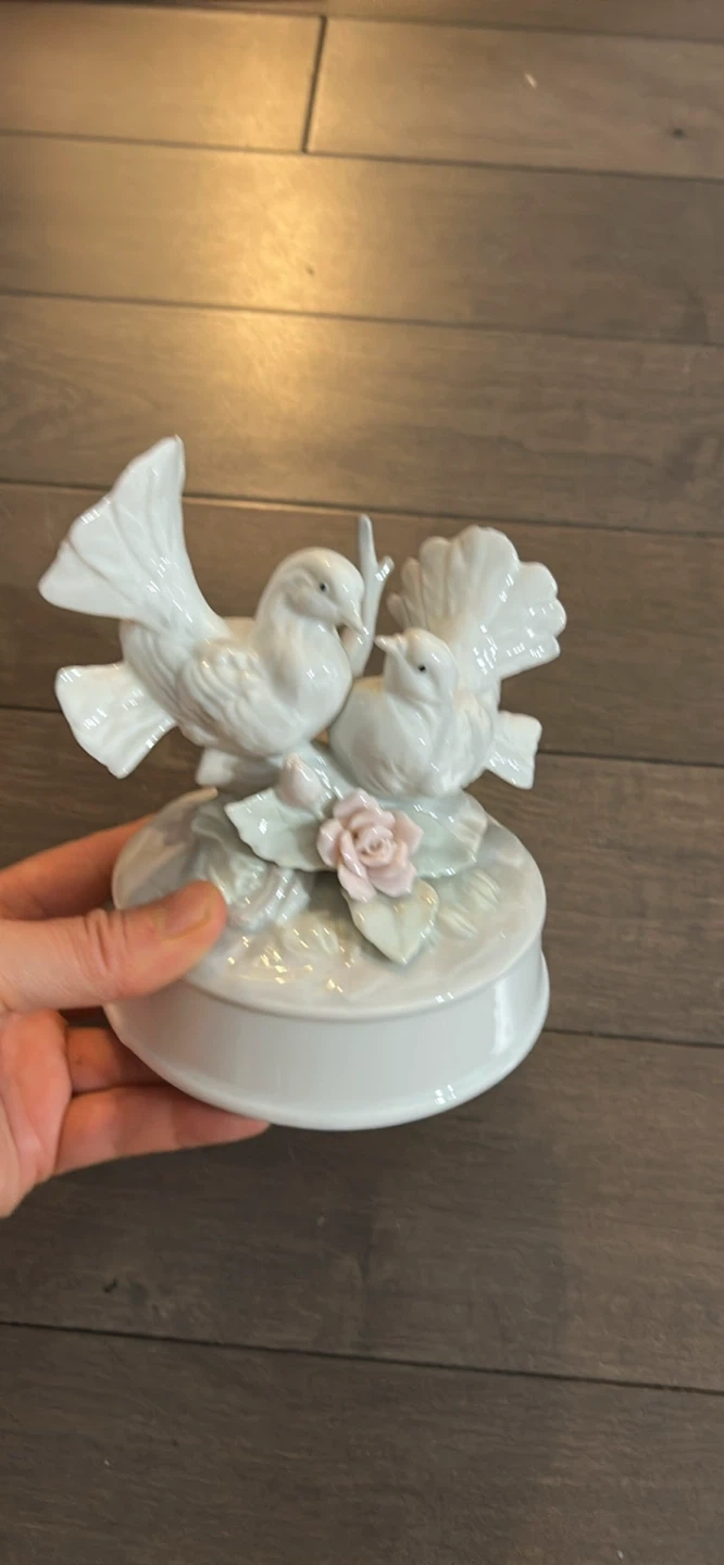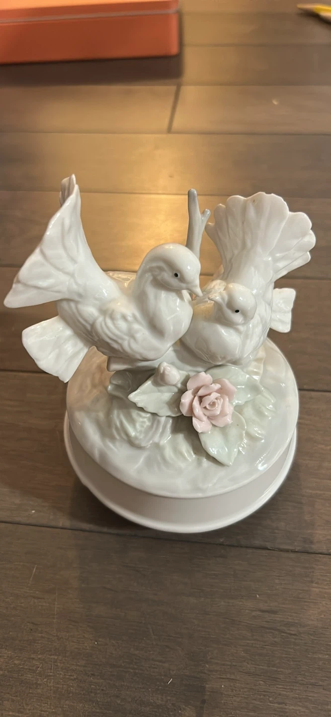 A lovely vintage dove music box! It features two white doves with a small rose accent. It's in great condition and would make a wonderful addition to any collection or a sweet gift