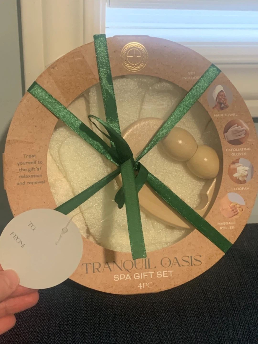 Treat yourself to relaxation with this Tranquil Oasis Spa Gift Set! It includes a hair towel, exfoliating gloves, a loofah, and a massage roller. Perfect for elevating your at-home spa experience