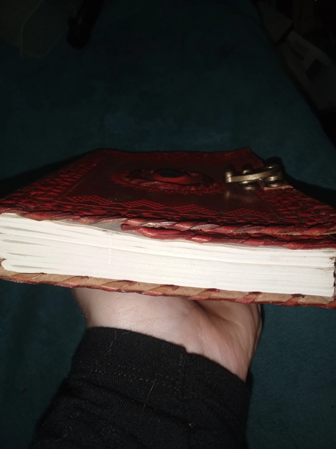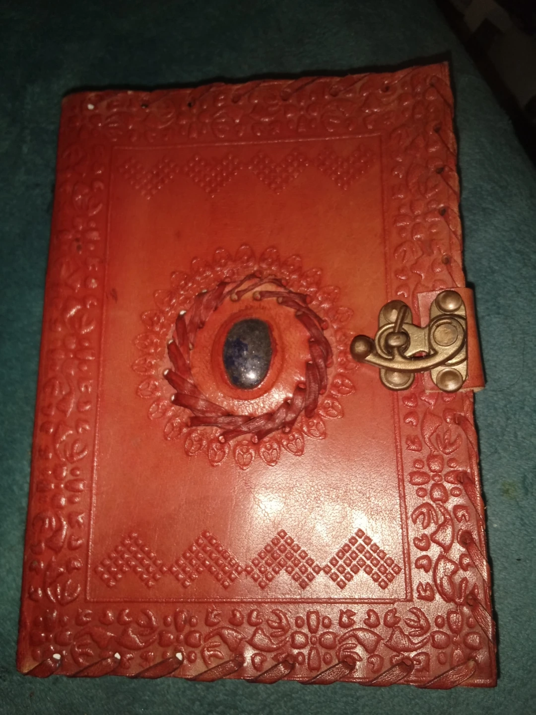 Selling a red leather journal diary. It has a unique design with a stone in the center and a metal clasp. The leather has an embossed floral pattern around the edges. Great for writing or sketching!