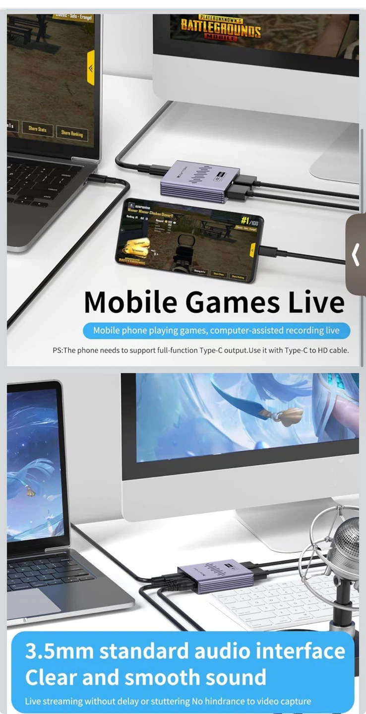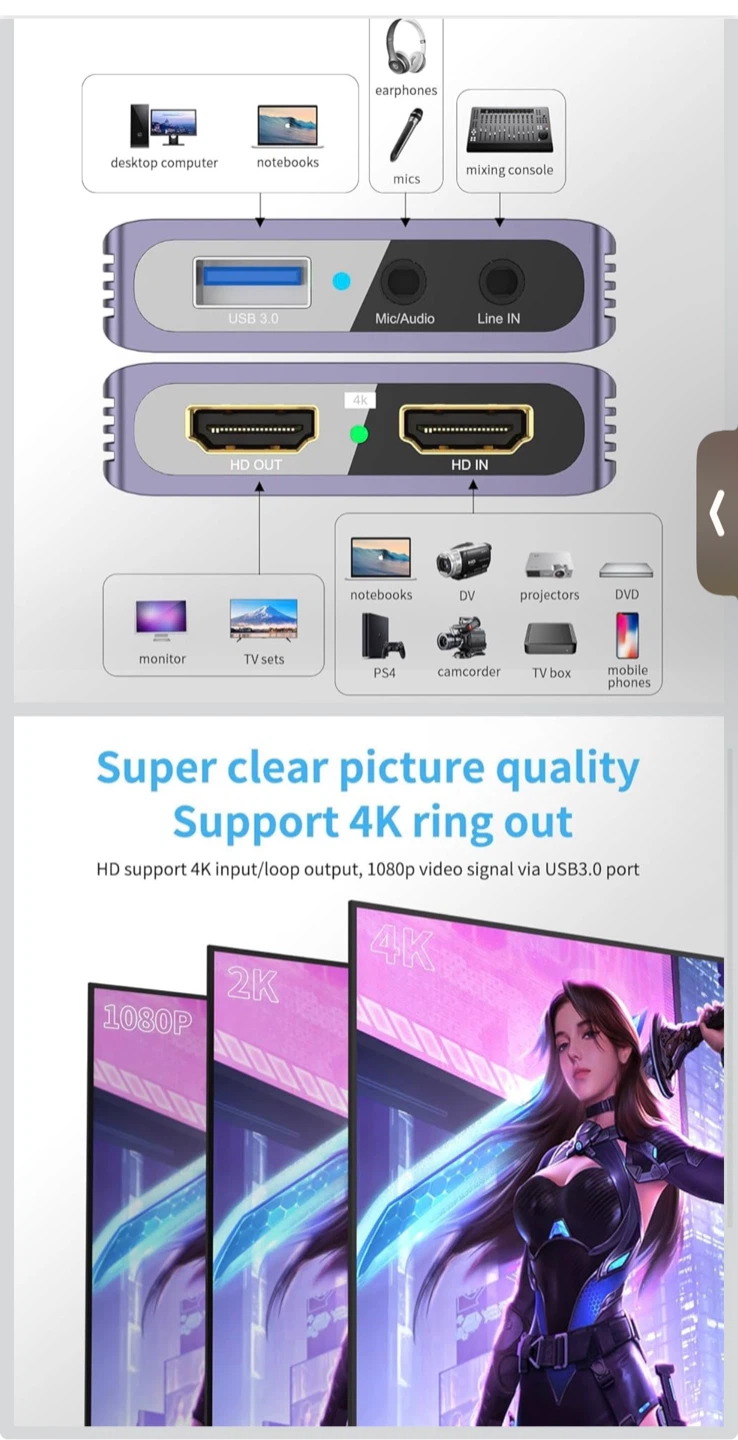 4K HDMI Video Capture Card for Nintendo Switch 2, PS5, Xbox, PC,Streaming- USB 3.0 Game Capture Device with 2K 30fps, Compatible with Broadcasting, Mobile Cameras & More