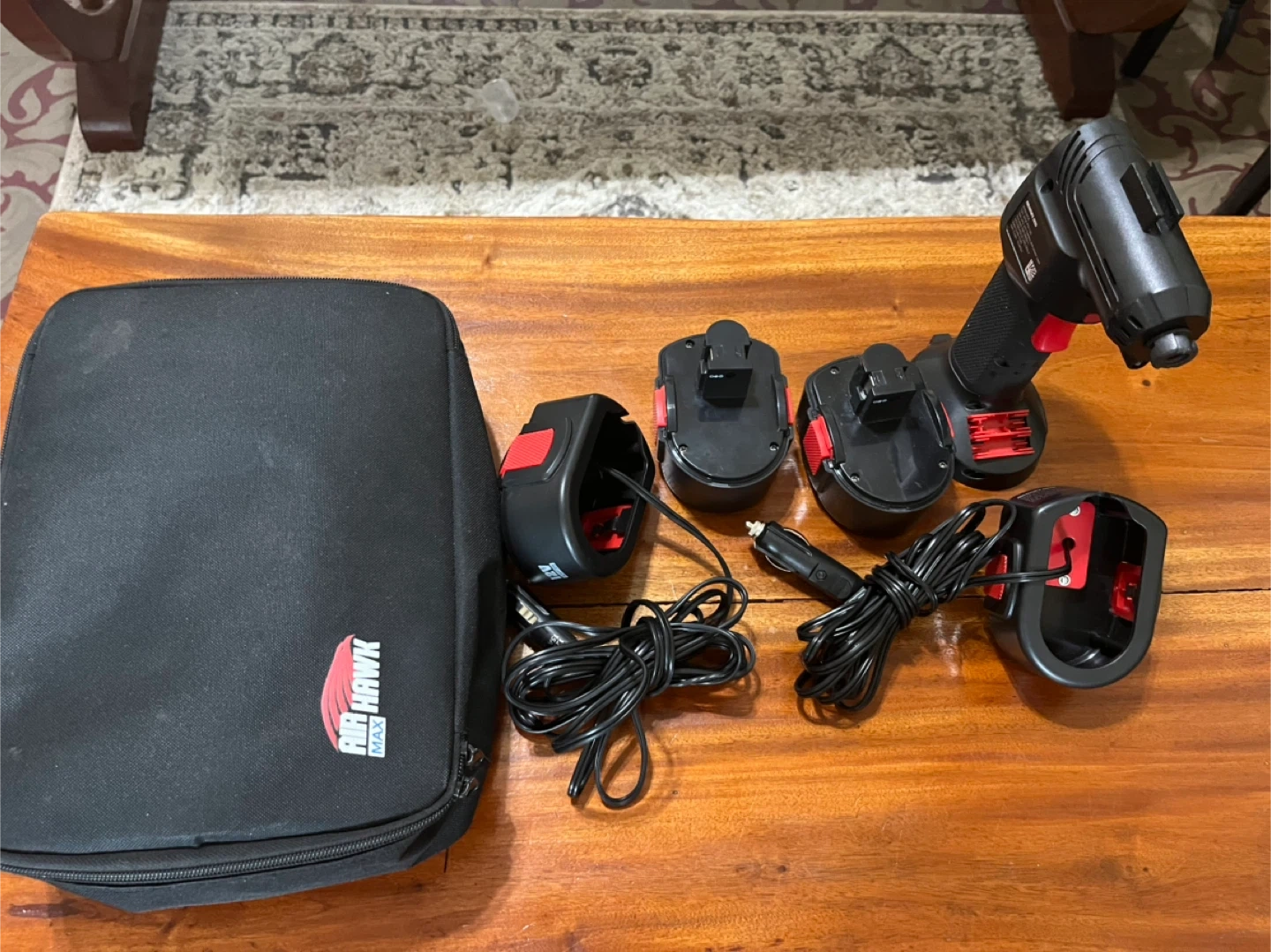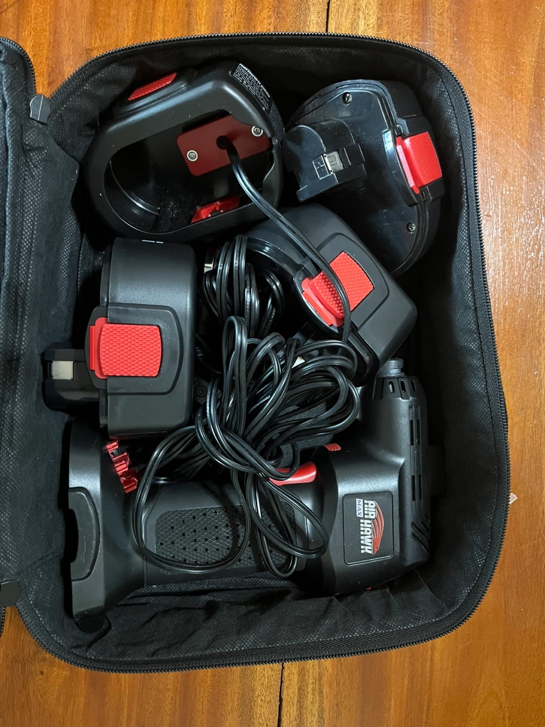 Selling an Air Hawk Max portable tire inflator/compressor! It comes with the carrying case, the compressor itself, two battery packs, and a car charger adapter. This is perfect for inflating tires or other inflatables on the go