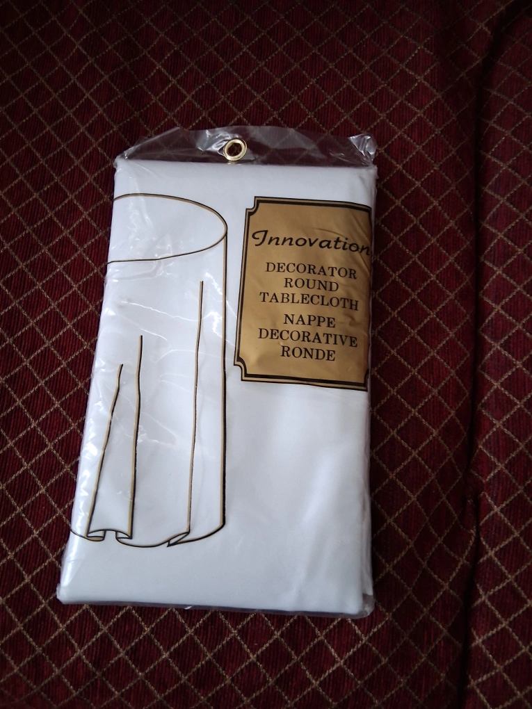 Selling a new, still-in-packaging Innovation Decorator Round Tablecloth! It's a 70" diameter tablecloth made of 100% polyester. Machine washable for easy care!