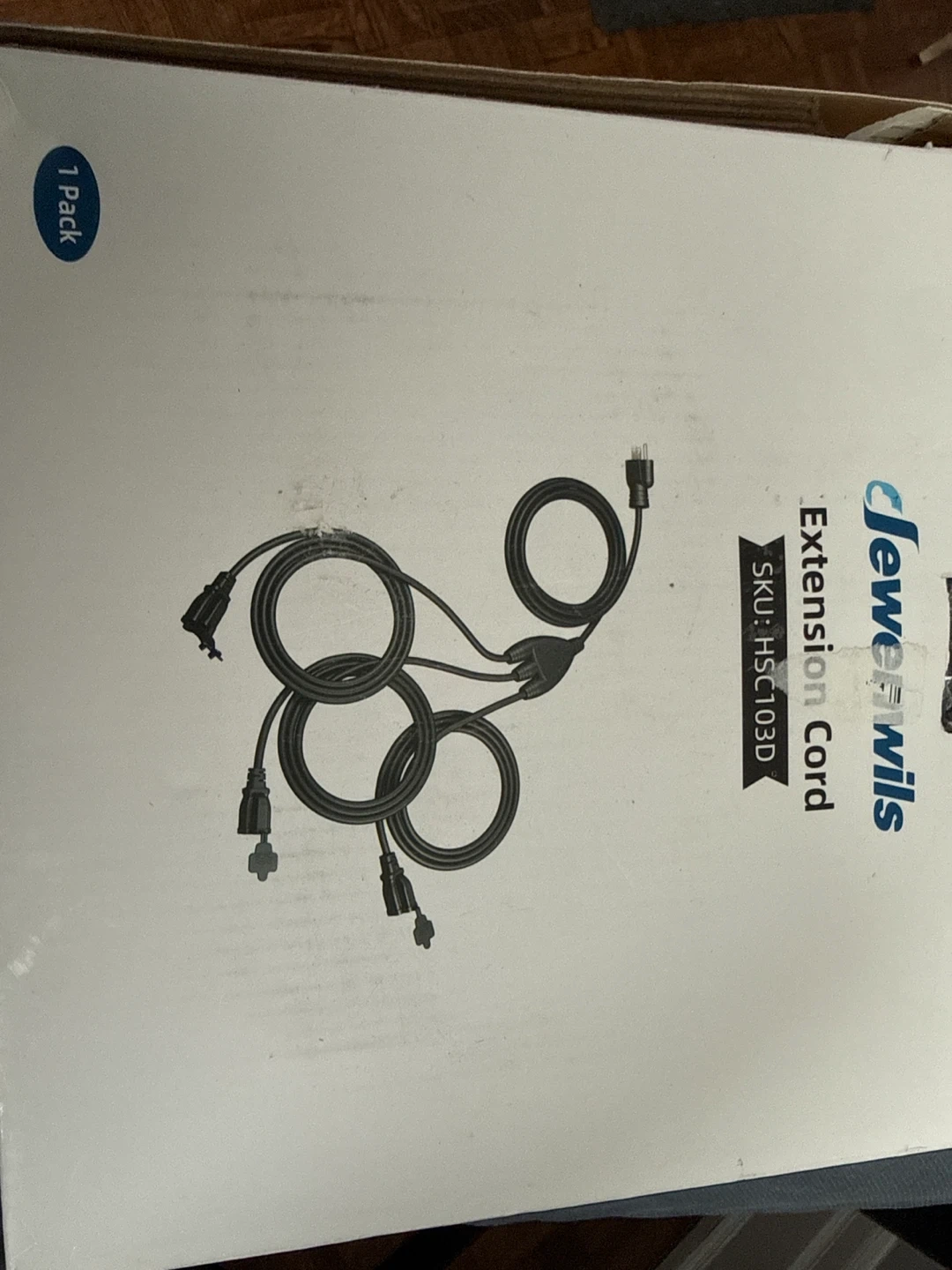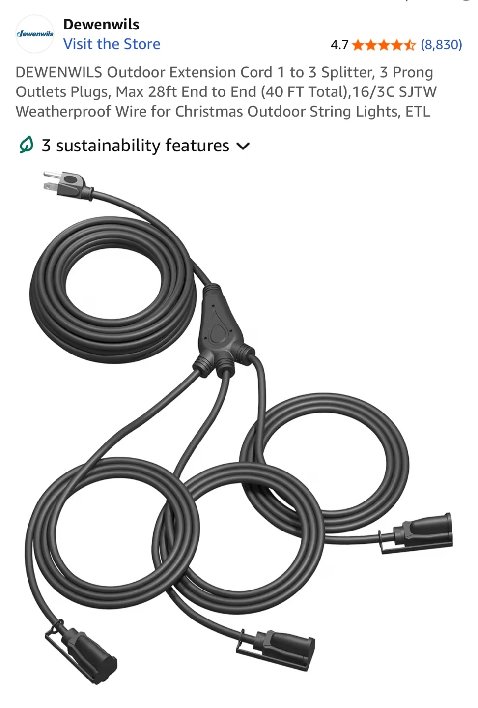 Selling a brand new Dewenwils outdoor extension cord with a 1 to 3 splitter! This cord features 3 prong outlets and is 40 feet in total length. It's a 16/3C SJTW weatherproof wire, perfect for Christmas outdoor string lights. It also has ETL certification. Comes in the original box